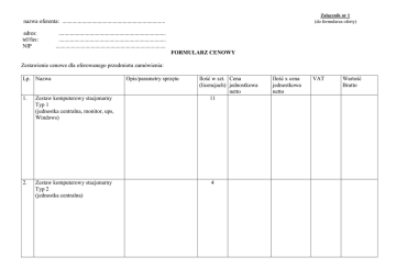 Załącznik nr 1 (do formularza oferty) nazwa oferenta: ......................................................................... adres: tel/fax: NIP ............................................................................ ............................................................................ .............................................................................. FORMULARZ CENOWY Zestawienie cenowe dla oferowanego przedmiotu zamówienia: Lp. Nazwa 1. Zestaw komputerowy stacjonarny Typ 1 (jednostka centralna, monitor, ups, Windows) 2. Zestaw komputerowy stacjonarny Typ 2 (jednostka centralna) Opis/parametry sprzętu Ilość w szt. Cena (licencjach) jednostkowa netto 11 4 Ilość x cena jednostkowa netto VAT Wartość Brutto 3. Serwer 1 4. Laptop 2 5. Drukarka Typ 1 3 6. Drukarka Typ 2 (urządzenie wielofunkcyjne) 2 7. Drukarka Typ 3 1 5 8. Rzutnik multimedialny 9. 4 Skaner 10. 1 Czytnik kodów kreskowych 11. Dysk USB zewnętrzny 2 TB WD My Passport Ultra USB3.0 12. Dysk SSD do laptopa 2,5” 256 GB 13. Dysk SSD wewnętrzny 2,5” 480 GB 14. Stacja dokująca serwisowa do dysków twardych 3,5 2,5” Gembird 15. Karta Goliath HD Protector (do komputerów stacjonarnych) - Goliath Simple wersja PCI-Ex 16. Przełącznik aktywny VGA do rzutnika i monitora LCD Digitus Mini Splitter wideo VGA 1xPC 2x Monitor, 350 MHz wbudowany wzmacniacz do 75 M 17. Przełącznik sieciowy 48 portów 10/100 2-4 potów Gbit skrętkowe, zarządzalny Cisco obsługa 802.1Q WS-C2960+48TC-L 18. Zasilacz ATX Modecom MC400-85 19. Kontroler 2xUSB 3.0 Pci Express 20. Pamięć RAM do laptopa 2 GB DDR3 1333 Mhz 21. Pamięć RAM do laptopa 2 GB DDR2 667 Mhz 22. Pamięć RAM do laptopa 2 GB DDR2 800 Mhz 23. Pamięć RAM do komputerów stacjonarnych DDR2 800 Mhz, kość 2 GB 1 1 2 1 20 5 1 5 2 2 2 2 4 2 24. Kabel skrętka UTP 300 metrów 25. 10 Kabel VGA do rzutnika 2,5 metra 26. Oprogramowanie Microsoft Office Pro 17 2010 OGÓŁEM Wyliczoną wartość zamówienia z poz. OGÓŁEM należy przenieść do formularza oferty. .......................................... (miejscowość i data) ................................................................... (podpis wykonawcy)
