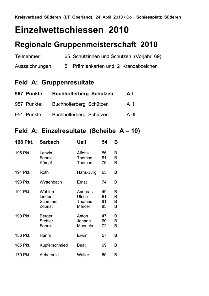 Kreisverband Süderen (LT Oberland) 24. April 2010 / Do Schiessplatz Süderen Einzelwettschiessen 2010 Regionale Gruppenmeisterschaft 2010 Teilnehmer: 65 Schützinnen und Schützen (Vorjahr 69) Auszeichnungen: 51 Prämienkarten und 2 Kranzabzeichen Feld A: Gruppenresultate 967 Punkte: Buchholterberg Schützen AI 957 Punkte: Buchholterberg Schützen A II 951 Punkte: Buchholterberg Schützen A III Feld A: Einzelresultate (Scheibe A – 10) 198 Pkt. Sarbach Ueli 54 B 195 Pkt. Lenzin Fahrni Kämpf Alfons Thomas Thomas 56 61 76 B B B 194 Pkt. Roth Hans-Jürg 65 B 193 Pkt. Wyttenbach Ernst 74 B 191 Pkt. Wahlen Linder Scheuner Zobrist Andreas Ulrich Thomas Marcel 49 61 81 83 B B B B 190 Pkt. Berger Stettler Fahrni Anton Johann Manuela 47 60 72 B B B 186 Pkt. Hänni Erwin 57 B 185 Pkt. Kupferschmied Beat 69 B 179 Pkt. Aebersold Walter 60 B Feld D: Gruppenresultate 697 Punkte: Buchholterberg Schützen Buchholterberg Schützen DI D III 681 Punkte: Buchholterberg Schützen D II 674 Punkte: Buchholterberg Schützen D IV 667 Punkte: Buchholterberg Schützen D VII 666 Punkte: Buchholterberg Schützen DV 650 Punkte: Buchholterberg Schützen D VI 627 Punkte: Buchholterberg Schützen D VIII Feld D: Einzelresultate (Scheibe A – 10) 143 Pkt. Meyer Rüegsegger Hans Jakob 52 79 B B 142 Pkt. Hostettler Fahrni Kurt Martin 67 68 B B 140 Pkt. Roth Bartenbach Aebersold Hans Eduard Beat 38 41 74 B B B 138 Pkt. Schüpbach Dällenbach Müller Wittwer Blaser Ernst Robert Margrit Peter Corinne 39 53 67 72 82 B B B B B 137 Pkt. Schlüchter Spycher Wyttenbach Bachmann Oberli Dällenbach Fritz Peter Madelaine Monika Sascha Beat 48 67 68 77 90 90 S B B B B B 136 Pkt. Imhof Joss Aebersold Haldimann Walter Rolf Ulrich Andrea 49 58 62 85 B B B B 135 Pkt. Dolder Blaser Hanspeter Stefan 54 75 B B 134 Pkt. Sigrist Rüegsegger Dällenbach Hans Samuel Reto 47 81 92 B B B 133 Pkt. Ineichen Beat 76 B 132 Pkt. Egli Ramseier Fritz Fritz 49 55 B S 130 Pkt. Jenni Urs 92 B 129 Pkt. Wenger Roth Samuel Adrian 43 90 S B 128 Pkt. Rüegsegger Sempach Dummermuth Ueli Stefan Rolf 42 64 92 B B B 127 Pkt. Beutler Sempach Peter Andreas 57 70 B B 126 Pkt. Maeder Joss Pfander Pia Patric Benjamin 74 90 92 B B B 124 Pkt. Röthlisberger Marco 91 B 123 Pkt. Rüegsegger Aebersold Michael Marco 86 93 B B 122 Pkt. Scheuner Hans 45 S 118 Pkt. Gehrig Kevin 92 B 116 Pkt. Wyss Nathan 93 B 115 Pkt. Egli Lorenz 92 B Röthlisberger Micha 93 B 99 Pkt. Legende: B S Buchholterberg Schützen Schützengesellschaft Süderen