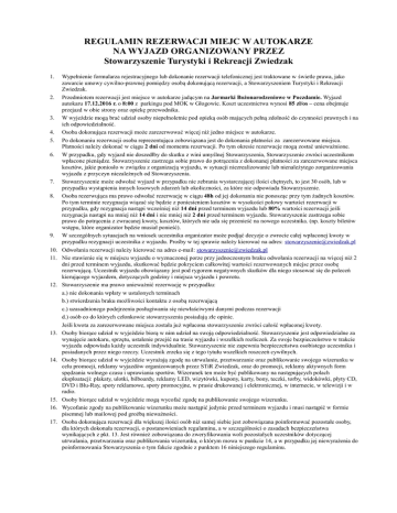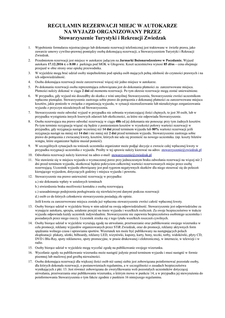 REGULAMIN REZERWACJI MIEJC W AUTOKARZE NA WYJAZD ORGANIZOWANY PRZEZ Stowarzyszenie Turystyki i Rekreacji Zwiedzak 1. 2. 3. 4. 5. 6. 7. 8. 9. 10. 11. 12. 13. 14. 15. 16. 17. Wypełnienie formularza rejestracyjnego lub dokonanie rezerwacji telefonicznej jest traktowane w świetle prawa, jako zawarcie umowy cywilno-prawnej pomiędzy osobą dokonującą rezerwacji, a Stowarzyszeniem Turystyki i Rekreacji Zwiedzak. Przedmiotem rezerwacji jest miejsce w autokarze jadącym na Jarmarki Bożonarodzeniowe w Poczdamie. Wyjazd autokaru 17.12.2016 r. o 8:00 z parkingu pod MOK w Głogowie. Koszt uczestnictwa wynosi 85 zł/os – cena obejmuje przejazd w obie strony oraz opiekę przewodnika. W wyjeździe mogą brać udział osoby niepełnoletnie pod opieką osób mających pełną zdolność do czynności prawnych i na ich odpowiedzialność. Osoba dokonująca rezerwacji może zarezerwować więcej niż jedno miejsce w autokarze. Po dokonaniu rezerwacji osoba reprezentująca zobowiązana jest do dokonania płatności za zarezerwowane miejsca. Płatności należy dokonać w ciągu 2 dni od momentu rezerwacji. Po tym okresie rezerwacje mogą zostać unieważnione. W przypadku, gdy wyjazd nie doszedłby do skutku z wini umyślnej Stowarzyszenia, Stowarzyszenie zwróci uczestnikom wpłacone pieniądze. Stowarzyszenie zastrzega sobie prawo do potrącenia z dokonanej płatności za zarezerwowane miejsca kosztów, jakie poniosło w związku z organizacją wyjazdu, w sytuacji niezrealizowanie lub nienależytego zorganizowania wyjazdu z przyczyn niezależnych od Stowarzyszenia. Stowarzyszenie może odwołać wyjazd w przypadku nie zebrania wystarczającej ilości chętnych, to jest 30 osób, lub w przypadku wystąpienia innych losowych zdarzeń lub okoliczności, za które nie odpowiada Stowarzyszenie. Osoba rezerwująca ma prawo odwołać rezerwację w ciągu 48h od jej dokonania nie ponosząc przy tym żadnych kosztów. Po tym terminie rezygnacja wiązać się będzie z poniesieniem kosztów w wysokości połowy wartości rezerwacji w przypadku, gdy rezygnacja nastąpi wcześniej niż 14 dni przed terminem wyjazdu lub 80% wartości rezerwacji jeśli rezygnacja nastąpi na mniej niż 14 dni i nie mniej niż 2 dni przed terminem wyjazdu. Stowarzyszenie zastrzega sobie prawo do potrącenia z zwracanej kwoty, kosztów, których nie uda się przenieść na nowego uczestnika. (np. koszty biletów wstępu, które organizator będzie musiał ponieść). W szczególnych sytuacjach na wniosek uczestnika organizator może podjąć decyzje o zwrocie całej wpłaconej kwoty w przypadku rezygnacji uczestnika z wyjazdu. Prośby w tej sprawie należy kierować na adres: [email protected] Odwołania rezerwacji należy kierować na adres e-mail: [email protected] Nie stawienie się w miejscu wyjazdu o wyznaczonej porze przy jednoczesnym braku odwołania rezerwacji na więcej niż 2 dni przed terminem wyjazdu, skutkować będzie pokryciem całkowitej wartości rezerwowanych miejsc przez osobę rezerwującą. Uczestnik wyjazdu obowiązany jest pod rygorem negatywnych skutków dla niego stosować się do poleceń kierującego wyjazdem, dotyczących godziny i miejsca wyjazdu i powrotu. Stowarzyszenie ma prawo unieważnić rezerwację w przypadku: a.) nie dokonania wpłaty w ustalonych terminach b.) stwierdzenia braku możliwości kontaktu z osobą rezerwującą c.) uzasadnionego podejrzenia posługiwania się niewłaściwymi danymi podczas rezerwacji d.) osób co do których członkowie stowarzyszenia posiadają złe opinie. Jeśli kwota za zarezerwowane miejsca została już wpłacona stowarzyszenie zwróci całość wpłaconej kwoty. Osoby biorące udział w wyjeździe biorą w nim udział na swoją odpowiedzialność. Stowarzyszenie jest odpowiedzialne za wynajęcie autokaru, sprzętu, ustalenie przejść na trasie wyjazdu i wszelkich rozliczeń. Za swoje bezpieczeństwo w trakcie wyjazdu odpowiada każdy uczestnik indywidualnie. Stowarzyszenie nie zapewnia bezpieczeństwa osobistego uczestnika i posiadanych przez niego rzeczy. Uczestnik zrzeka się z tego tytułu wszelkich roszczeń cywilnych. Osoby biorące udział w wyjeździe wyrażają zgodę na utrwalanie, przetwarzanie oraz publikowanie swojego wizerunku w celu promocji, reklamy wyjazdów organizowanych przez STiR Zwiedzak, oraz do promocji, reklamy aktywnych form spędzania wolnego czasu i uprawiania sportów. Wizerunek ten może być publikowany na następujących polach eksploatacji: plakaty, ulotki, bilboardy, reklamy LED, wizytówki, kupony, karty, bony, teczki, torby, widokówki, płyty CD, DVD i Blu-Ray, spoty reklamowe, spoty promocyjne, w prasie drukowanej i elektronicznej, w internecie, w telewizji i w radio. Osoby biorące udział w wyjeździe mogą wycofać zgodę na publikowanie swojego wizerunku. Wycofanie zgody na publikowanie wizerunku może nastąpić jedynie przed terminem wyjazdu i musi nastąpić w formie pisemnej lub mailowej pod groźbą nieważności. Osoba dokonująca rezerwacji dla większej ilości osób niż samej siebie jest zobowiązana poinformować pozostałe osoby, dla których dokonała rezerwacji, o postanowieniach regulaminu, a w szczególności o zasadach bezpieczeństwa wynikających z pkt. 13. Jest również zobowiązana do zweryfikowania woli pozostałych uczestników dotyczącej utrwalania, przetwarzania oraz publikowania wizerunku, o którym mowa w punkcie 14, a w przypadku jej niewyrażenia do poinformowania Stowarzyszenia o tym fakcie zgodnie z punktem 16 niniejszego regulaminu.
