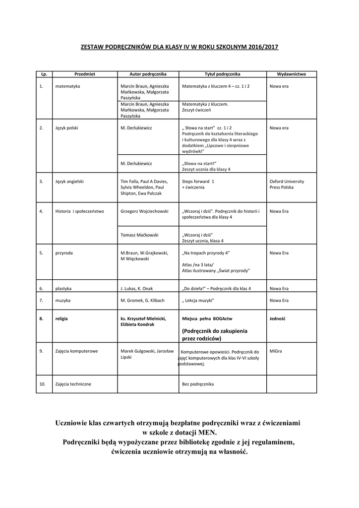 ZESTAW PODRĘCZNIKÓW DLA KLASY IV W ROKU SZKOLNYM 2016/2017 Lp. 1. 2. Przedmiot matematyka Język polski Autor podręcznika Tytuł podręcznika Marcin Braun, Agnieszka Mańkowska, Małgorzata Paszyńska Marcin Braun, Agnieszka Mańkowska, Małgorzata Paszyńska Matematyka z kluczem 4 – cz. 1 i 2 M. Derlukiewicz „ Słowa na start” cz. 1 i 2 Podręcznik do kształcenia literackiego i kulturowego dla klasy 4 wraz z dodatkiem „Lipcowe i sierpniowe wędrówki” M. Derlukiewicz „Słowa na start!” Zeszyt ucznia dla klasy 4 Wydawnictwo Nowa era Matematyka z kluczem. Zeszyt ćwiczeń Nowa era 3. Język angielski Tim Falla, Paul A Davies, Sylvia Wheeldon, Paul Shipton, Ewa Palczak Steps forward 1 + ćwiczenia Oxford University Press Polska 4. Historia i społeczeństwo Grzegorz Wojciechowski „Wczoraj i dziś”. Podręcznik do historii i społeczeństwa dla klasy 4 Nowa Era Tomasz Maćkowski „Wczoraj i dziś” Zeszyt ucznia, klasa 4 M.Braun, W.Grajkowski, M Więckowski „Na tropach przyrody 4” 5. przyroda Nowa Era Atlas /na 3 lata/ Atlas ilustrowany „Świat przyrody” 6. plastyka J. Lukas, K. Onak „Do dzieła!” – Podręcznik dla klas 4 Nowa Era 7. muzyka M. Gromek, G. Kilbach „ Lekcja muzyki” Nowa Era 8. religia ks. Krzysztof Mielnicki, Elżbieta Kondrak Miejsca pełna BOGActw Jedność (Podręcznik do zakupienia przez rodziców) 9. Zajęcia komputerowe 10. Zajęcia techniczne Marek Gulgowski, Jarosław Komputerowe opowieści. Podręcznik do Lipski zajęć komputerowych dla klas IV-VI szkoły podstawowej. MiGra Bez podręcznika Uczniowie klas czwartych otrzymują bezpłatne podręczniki wraz z ćwiczeniami w szkole z dotacji MEN. Podręczniki będą wypożyczane przez bibliotekę zgodnie z jej regulaminem, ćwiczenia uczniowie otrzymują na własność. ZESTAW PODRĘCZNIKÓW DLA KLASY V W ROKU SZKOLNYM 2016/2017 Lp. 1. 2. Przedmiot matematyka Język polski Autor podręcznika Tytuł podręcznika Marcin Braun, Agnieszka Mańkowska, Małgorzata Paszyńska Marcin Braun, Agnieszka Mańkowska, Małgorzata Paszyńska Matematyka z kluczem 5 – cz. 1 i 2 M. Derlukiewicz „ Słowa na start” cz. 1 i 2 Podręcznik do kształcenia literackiego i kulturowego dla klasy 5 M. Derlukiewicz „Słowa na start!” Zeszyt ucznia dla klasy 5 Wydawnictwo Nowa era Matematyka z kluczem 5. Zeszyt ćwiczeń Nowa era 3. Język angielski Tim Falla, Paul A Davies, Sylvia Wheeldon, Paul Shipton, Ewa Palczak Steps forward 2 + ćwiczenia Oxford University Press Polska 4. Historia i społeczeństwo Grzegorz Wojciechowski „Wczoraj i dziś”. Podręcznik do historii i społeczeństwa dla klasy 5 Nowa Era Tomasz Maćkowski „Wczoraj i dziś” Zeszyt ćwiczeń klasa 5 5. przyroda M.Braun, W.Grajkowski, M Więckowski „Na tropach przyrody 5” Nowa Era 6. plastyka J. Lukas, K. Onak „Do dzieła!” – Podręcznik dla klas 5 Nowa Era 7. muzyka M. Gromek, G. Kilbach „ Lekcja muzyki” Nowa Era 8. religia ks. Krzysztof Mielnicki, Elżbieta Kondrak Spotkania uBOGAcające Jedność (Podręcznik do zakupienia przez rodziców) 9. Zajęcia komputerowe 10. Zajęcia techniczne Marek Gulgowski, Jarosław Komputerowe opowieści. Podręcznik do Lipski zajęć komputerowych dla klas IV-VI szkoły podstawowej. MiGra Bez podręcznika Uczniowie klas piątych otrzymują bezpłatne podręczniki wraz z ćwiczeniami w szkole z dotacji MEN. Podręczniki będą wypożyczane przez bibliotekę zgodnie z jej regulaminem, ćwiczenia uczniowie otrzymują na własność. ZESTAW PODRĘCZNIKÓW DLA KLASY VI W ROKU SZKOLNYM 2016/2017 Lp. 1. 2. Przedmiot matematyka Język polski Autor podręcznika Tytuł podręcznika M Dobrowolska, M. Jucewicz, M. Karpiński,P.Zarzycki. „ Matematyka 6” matematyka z plusem, Hanna Dobrowolska, „ Jutro pójdę w świat”. Podręcznik do kształcenia kulturowego i językowego dla kl. 6 Hanna Dobrowolska, „ Jutro pójdę w świat”. Zeszyt ćwiczeń. Szkoła podstawowa. Klasa 6 Matematyka 6 - zeszyty ćwiczeń – Geometria kl. VI Liczby i wyrażenia algebraiczne cz. 1 Liczby i wyrażenia algebraiczne cz. 2 Wydawnictwo Gdańskie Wydawnictwo Oświatowe WSiP 3. Język angielski Tim Falla, Paul A Davies, Sylvia Wheeldon, Paul Shipton, Ewa Palczak Steps in English 3 + ćwiczenia Oxford University Press Polska 4. Historia i społeczeństwo Grzegorz Wojciechowski „Wczoraj i dziś”. Podręcznik do historii i społeczeństwa dla klasy 6 Nowa Era Tomasz Maćkowski „Wczoraj i dziś” Zeszyt ucznia, klasa 6 część 1 i 2 M.Braun, W.Grajkowski, M Więckowski Podręcznik bez ćwiczeń „Na tropach przyrody 6” Nowa Era „Lubię tworzyć” Podręcznik 6 MAC EDUKACJA 5. przyroda 6. plastyka „Lubię tworzyć” – zeszyt ćwiczeń 6 7. muzyka T.Wójcik „Muzyczny świat” Podręcznik klasa 6 T.Wójcik „Muzyczny świat” Zeszyt ćwiczeń, klasa 6, szkoła podstawowa Ks. Krzysztof Mielnicki „Tajemnice Bogatego życia” 8. religia 9. Zajęcia komputerowe Bez podręcznika 10. Zajęcia techniczne Bez podręcznika MAC EDUKACJA Jedność