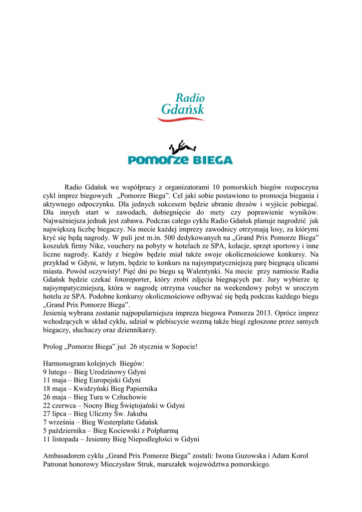 Radio Gdańsk we współpracy z organizatorami 10 pomorskich biegów rozpoczyna cykl imprez biegowych „Pomorze Biega”. Cel jaki sobie postawiono to promocja biegania i aktywnego odpoczynku. Dla jednych sukcesem będzie ubranie dresów i wyjście pobiegać. Dla innych start w zawodach, dobiegnięcie do mety czy poprawienie wyników. Najważniejsza jednak jest zabawa. Podczas całego cyklu Radio Gdańsk planuje nagrodzić jak największą liczbę biegaczy. Na mecie każdej imprezy zawodnicy otrzymają losy, za którymi kryć się będą nagrody. W puli jest m.in. 500 dedykowanych na „Grand Prix Pomorze Biega” koszulek firmy Nike, vouchery na pobyty w hotelach ze SPA, kolacje, sprzęt sportowy i inne liczne nagrody. Każdy z biegów będzie miał także swoje okolicznościowe konkursy. Na przykład w Gdyni, w lutym, będzie to konkurs na najsympatyczniejszą parę biegnącą ulicami miasta. Powód oczywisty! Pięć dni po biegu są Walentynki. Na mecie przy namiocie Radia Gdańsk będzie czekać fotoreporter, który zrobi zdjęcia biegnących par. Jury wybierze tę najsympatyczniejszą, która w nagrodę otrzyma voucher na weekendowy pobyt w uroczym hotelu ze SPA. Podobne konkursy okolicznościowe odbywać się będą podczas każdego biegu „Grand Prix Pomorze Biega”. Jesienią wybrana zostanie najpopularniejsza impreza biegowa Pomorza 2013. Oprócz imprez wchodzących w skład cyklu, udział w plebiscycie wezmą także biegi zgłoszone przez samych biegaczy, słuchaczy oraz dziennikarzy. Prolog „Pomorze Biega” już 26 stycznia w Sopocie! Harmonogram kolejnych Biegów: 9 lutego – Bieg Urodzinowy Gdyni 11 maja – Bieg Europejski Gdyni 18 maja – Kwidzyński Bieg Papiernika 26 maja – Bieg Tura w Człuchowie 22 czerwca – Nocny Bieg Świętojański w Gdyni 27 lipca – Bieg Uliczny Św. Jakuba 7 września – Bieg Westerplatte Gdańsk 5 października – Bieg Kociewski z Polpharmą 11 listopada – Jesienny Bieg Niepodległości w Gdyni Ambasadorem cyklu „Grand Prix Pomorze Biega” zostali: Iwona Guzowska i Adam Korol Patronat honorowy Mieczysław Struk, marszałek województwa pomorskiego. Patron techniczny: maratonypolskie.pl Patron medialny: trójmiasto.pl „Dziennik Bałtycki” Partner: sklepbiegowy.pl, sportowysklep.pl, Parkrun Warto dodać, że w ramach cyklu „Pomorze Biega” wystartował w Radiu Gdańsk cykliczny program o bieganiu. Co czwartek od godziny 14 Tomasz Galiński promuje aktywny wypoczynek. Radio Gdańsk objęło także patronatem sobotnie gdańskie i gdyńskie biegi Parkrun organizowane przez Stowarzyszenie parkrun Polska, które wraz z podobnymi stowarzyszeniami organizuje biegi parkrun w ośmiu krajach na świecie (Wielka Brytania, Irlandia, Dania, Australia, RPA, Islandia i Polska. W naszym kraju biegi odbywają się w Trójmieście oraz w Łodzi i Poznaniu. Idea parkrun Polska zakłada organizację biegów wszędzie tam, gdzie jest takie zapotrzebowanie i są osoby, które chcą aktywizować społeczność lokalną. Obecnie parkrun Polska skupia już ponad 1600 zarejestrowanych uczestników, których liczba powiększa się miesięcznie o ok. 100 osób. Radio Gdańsk poszukuje grup biegowych, miejsc w których warto trenować, firm w których powstały grupy biegowe. Wszyscy, którzy chcą podzielić się swoją pasją zostaną zaprezentowani na antenie oraz stronie internetowej. Czekamy na zgłoszenia pod adresem: [email protected]