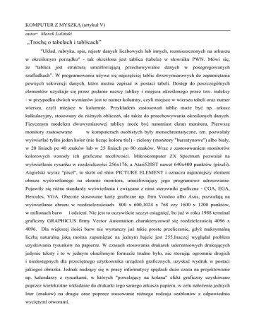 KOMPUTER Z MYSZKĄ (artykuł V) autor: Marek Luliński „Trochę o tabelach i tablicach” "Układ, rubryka, spis, rejestr danych liczbowych lub innych, rozmieszczonych na arkuszu w określonym porządku" - tak określona jest tablica (tabela) w słowniku PWN. Mówi się, że "tablica jest strukturą umożliwiającą przechowywanie danych w posegregowanych szufladkach”. W programowaniu używa się najczęściej tablic dwuwymiarowych do zapamiętania pewnych sekwencji danych, które można zapisać w postaci tabeli. Dostęp do poszczególnych elementów uzyskuje się przez podanie nazwy tablicy i miejsca określonego przez tzw. indeksy - w przypadku dwóch wymiarów jest to numer kolumny, czyli miejsce w wierszu tabeli oraz numer wiersza, czyli miejsce w kolumnie. Przykładem zastosowań tablic może być np. arkusz kalkulacyjny, stosowany do różnych obliczeń, ale także do przechowywania określonych danych. Fizycznym modelem dwuwymiarowej tablicy może być natomiast ekran monitora. Pierwsze monitory zastosowane w komputerach osobistych były monochromatyczne, tzn. pozwalały wyświetlać tylko jeden kolor (nie licząc koloru tła!) - zielony (monitory "bursztynowe") albo biały, w 20 liniach po 40 znaków lub w 25 liniach po 80 znaków. Wraz z zastosowaniem monitorów kolorowych wzrosły ich graficzne możliwości. Mikrokomputer ZX Spectrum pozwalał na wyświetlenie rysunku w rozdzielczości 256x176, a Atari520ST nawet 640x400 punktów (pixeli). Angielski wyraz "pixel", to skrót od słów PICTURE ELEMENT i oznacza najmniejszy element obrazu wyświetlanego na ekranie monitora, umożliwiający jego programowe adresowanie. Pojawiły się różne standardy wyświetlania i związane z nimi sterowniki graficzne - CGA, EGA, Hercules, VGA. Obecnie stosowane karty graficzne np. firm Voodoo albo Asus, pozwalają na wyświetlanie obrazu w rozdzielczościach 800 x 600,1024 x 768 czy 1600 x 1200 punktów, w milionach barw i odcieni. Nie jest to oczywiście szczyt osiągnięć, bo już w roku 1988 terminal graficzny GRAPHICUS firmy Vector Automation charakteryzował się rozdzielczością 4096 x 4096. Dla większej ilości barw nie wystarczy już takie proste przeliczenie, gdyż maksymalną liczbą naturalną jaką można zapamiętać na jednym bajcie jest 255.Inaczej wyglądał problem uzyskiwania rysunków na papierze. W czasach stosowania drukarek uderzeniowych drukujących jedynie teksty i to w jednym określonym formacie trudno było, nie stosując ogromnie drogich i niedostępnych dla przeciętnego użytkownika urządzeń graficznych, uzyskać wydruk w postaci jakiegoś obrazka. Jednak nudzący się w pracy informatycy spędzali dużo czasu na projektowanie np. kalendarzy z rysunkami, w których "powalający na kolana" efekt graficzny uzyskiwano poprzez wielokrotne wkładanie do drukarki tego samego arkusza papieru, w celu nałożenia jednych liter (znaków) na drugie oraz poprzez stosowanie różnego rodzaju szablonów z odpowiednio wyciętymi otworami. Takie "znakowe", zabawne „rysunki” tekstowe spotykamy z resztą znowu, po wielu latach np. w wiadomościach wysyłanych przez użytkowników poczty elektronicznej, czy w internecie. Jednym z praktycznych zastosowań tablic można wymienić zapamiętywanie niewielkich fragmentów obrazu (okna graficznego) w postaci dwuwymiarowej tablicy. Ze względu na olbrzymią ilość danych charakteryzujących obecnie stosowane rysunki, wykorzystuje się różne sposoby ich kompresji i specjalne metody zapamiętywania tak zakodowanych parametrów, zapisywanych w plikach. Jednak nawet dla obrazów monochromatycznych o niewielkich rozmiarach, sporządzona tabela z danymi jest dość obszerna i zajmuje sporo pamięci.