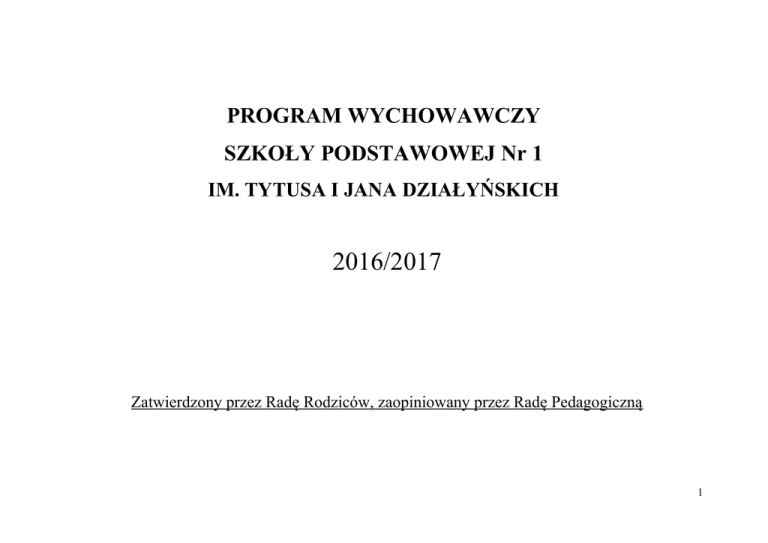 PROGRAM WYCHOWAWCZY SZKOŁY PODSTAWOWEJ Nr 1 IM. TYTUSA I JANA DZIAŁYŃSKICH 2016/2017 Zatwierdzony przez Radę Rodziców, zaopiniowany przez Radę Pedagogiczną 1 SYSTEM WARTOŚCI SZKOŁY PODSTAWOWEJ NR 1 W PLEWISKACH Uczciwość Tolerancja Bezpieczeństwo Rodzina Przyjaźń Patriotyzm Edukacja 2 Sylwetka Absolwenta Szkoły Podstawowej nr1 im. Tytusa i Jana Działyńskich Jest uczciwy (prawdomówny i sprawiedliwy). Jest tolerancyjny (wrażliwy na potrzeby innych, szanujący inność). Dba o bezpieczeństwo swoje i innych (pomaga w sytuacjach trudnych, wspiera słabszych). Jest przyjacielski (pielęgnuje relacje i pomaga w potrzebie). Szanuje symbole narodowe. Godnie reprezentuje szkołę. Bierze czynny udział w życiu szkoły. Daje dobry przykład młodszym. Dba o swój rozwój. Szanuje swoich bliskich, wychowawców i pracowników szkoły. 3 CELE OGÓLNE PROGRAMU WYCHOWAWCZEGO • • • • • • • • Wspieranie wszechstronnego rozwoju ucznia. Kształtowanie u uczniów postawy akceptacji, życzliwości i szacunku wobec siebie i innych. Budowanie prawidłowych relacji społecznych. Rozwijanie współpracy między rodzicami, nauczycielami i uczniami. Propagowanie i rozwijanie zdrowego stylu życia, aktywności sportowej i efektywnego spędzania czasu wolnego. Rozwijanie tradycji szkolnych i regionalnych oraz kształtowanie postaw patriotycznych. Przygotowanie do uczestnictwa w kulturze. Kształtowanie twórczego myślenia ucznia poprzez nowatorskie formy organizacji kształcenia oraz metody pracy dydaktycznej. 4 KALENDARZ ŚWIĄT I UROCZYSTOŚCI Święto/uroczystość Data Obchody Dnia Niepodległości Obchody Konstytucji 3 Maja Obchody rocznicy Powstania Wielkopolskiego Dzień Edukacji Narodowej Dzień Życzliwości Święto Języka Polskiego Listopad Maj Rodzinne Festyn Rodzinny Czerwiec Lokalne/ regionalne Dzień Seniora Pariotyczne Kalendarzowe Październik Możliwość wykorzystania w aspekcie wychowawczym Kształtowanie postawy patriotycznej Wzmacnianie wśród uczniów wartości edukacji Wzmacnianie wartości szacunku do drugiego człowieka Kształtowanie przynależności do społeczności szkolnej i lokalnej Kształtowanie przynależności do społeczności lokalnej 5 OBSZARY I. OBSZAR Organizacja zespołu klasowego. Higiena ucznia. Wskaźnik realizacji zadania 1.Uczeń zna i przestrzega ustalonych reguł klasowych i ma poczucie odpowiedzialności w związku z wypracowanym kontraktem. 2. Uczeń potrafi dbać o bezpieczeństwo własne i innych. ZADANIA 1.1. Wybór samorządu klasowego oraz ustalenie kontraktu klasowego. Przypomnienie wartości szkoły i sylwetki absolwenta. 1.2. Organizowanie wycieczek integracyjnych i imprez klasowych. 2.1. Przypomnienie norm i reguł klasowych oraz zasad bezpiecznego zachowania się w szkole i poza nią. 2.2. Rozwijanie współpracy między dziećmi i chęć pomocy kolegom. 3. Uczeń rozumie konieczność dbania o swój rozwój umysłowy poprzez rozwijanie swoich zainteresowań i pasji, pogłębianie swoich zdolności, umiejętności. 3.1. Zastosowanie nowatorskich metod nauczania, rozwijających twórcze myślenie oraz odkrywających potencjał uczniów. Dzień Hobbysty. 4. Uczeń aktywnie uczestniczy w zajęciach świetlicy szkolnej. 4.1. Organizowanie zajęć rozwijających zainteresowania uczniów w świetlicy szkolnej. OSOBY ODPOWIEDZIALNE Wychowawcy klas Rodzice SPOSOBY EWALUACJI Zapisy w dzienniku klasowym Wychowawcy klas Nauczyciele WF Rodzice Zapisy w dzienniku klasowym Kontrakty (zasady) w klasach Rodzice i wychowawcy klas Zapisy w dzienniku klasowym Gazetki klasowe Nauczyciele poszczególnych przedmiotów Zapisy w dziennikach lekcyjnych i kół Galeria wytworów uczniowskich Wychowawcy świetlicy szkolnej Galeria wytworów uczniowskich 6 II. OBSZAR Promowanie zdrowego stylu życia, higiena ucznia. Ekologia. 1. Uczeń wie, na czym polega zdrowy styl życia. 1.1. Przeprowadzenie lekcji kształtujących postawy zdrowego stylu życia (właściwe odżywianie, zasady higieny osobistej, efektywne spędzanie czasu wolnego, świadome i umiejętne korzystanie ze środków audiowizualnych. 1.2. Realizacja programu „Owoce i warzywa w szkole”. 1.3. Udział w programie „Szkoła promująca zdrowie”. 1.4. Udział w akcjach: „ Sprzątanie świata”, „ Dokarmianie ptaków i zwierząt” kl. I-III oraz organizowanie lekcji i wycieczek kształtujących postawy proekologiczne. "Dzień ziemi". 1.5. Organizacja zawodów sportowych, udział uczniów. 1.6. Prowadzenie koła turystycznego (rajdy piesze, rowerowe). 1.7. Udział w zajęciach z profilaktyki uzależnień. Wychowawcy klas Nauczyciele przyrody, wychowania fizycznego Wychowawcy świetlicy Prace uczniów, wystawy Protokoły konkursów Aneta Wójtowicz Zapisy w dzienniku klasowym Gazetki świetlicy Zespół ds. Promocji zdrowia J. Piechowicz Wychowawcy klas i nauczyciele przyrody Sprawozdanie Ankiety Wyniki Konkursu plastycznego Sprawozdanie z programu Nauczyciele wychowania fizycznego Opiekunowie koła P. Boruszak, B. Basińska-Troć M. Jabłońska M. Prabucka M. Witkowiak Wychowawcy kl.VI Zapisy w dzienniku Foto relacja Strona internetowa szkoły Zapisy w dzienniku klasowym Zapisy w dziennikach pedagoga i psychologów szkolnych 7 III. OBSZAR Organizacja życia społecznego w szkole. Kształtowanie postaw prospołecznych. Rozwijanie pasji i zainteresowań uczniów. 1. Uczeń zna swoje prawa i obowiązki. Szanuje prawa innych osób. 1.1. Zapoznanie uczniów z regułami organizującymi społeczność szkolną (Statut szkoły itd.). Wychowawcy klas Nauczyciele Pedagog, Psycholog Samorząd Uczniowski Zapisy w dzienniku klasowym Podpisy uczniów i rodziców 1.2. Zapoznanie uczniów z prawami dziecka, człowieka oraz ucznia (Konwencja o Prawach Dziecka, Powszechna Deklaracja Praw Człowieka, prawa i obowiązki ucznia). Wychowawcy klas Nauczyciele Wychowawcy świetlicy Zapisy w dzienniku klasowym Program świetlicy Wychowawcy klas Zapisy w dzienniku klasowym 2. Uczeń zna i uświadamia s