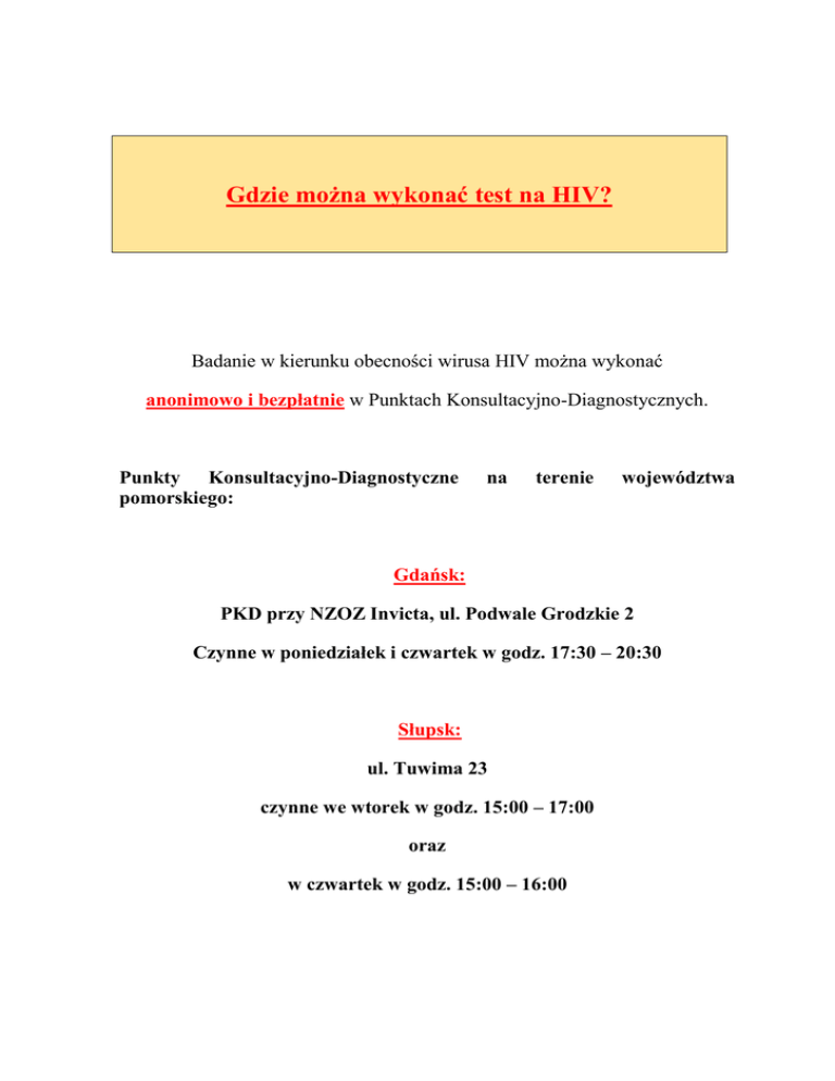 Gdzie można wykonać test na HIV? Badanie w kierunku obecności wirusa HIV można wykonać anonimowo i bezpłatnie w Punktach Konsultacyjno-Diagnostycznych. Punkty Konsultacyjno-Diagnostyczne pomorskiego: na terenie województwa Gdańsk: PKD przy NZOZ Invicta, ul. Podwale Grodzkie 2 Czynne w poniedziałek i czwartek w godz. 17:30 – 20:30 Słupsk: ul. Tuwima 23 czynne we wtorek w godz. 15:00 – 17:00 oraz w czwartek w godz. 15:00 – 16:00
