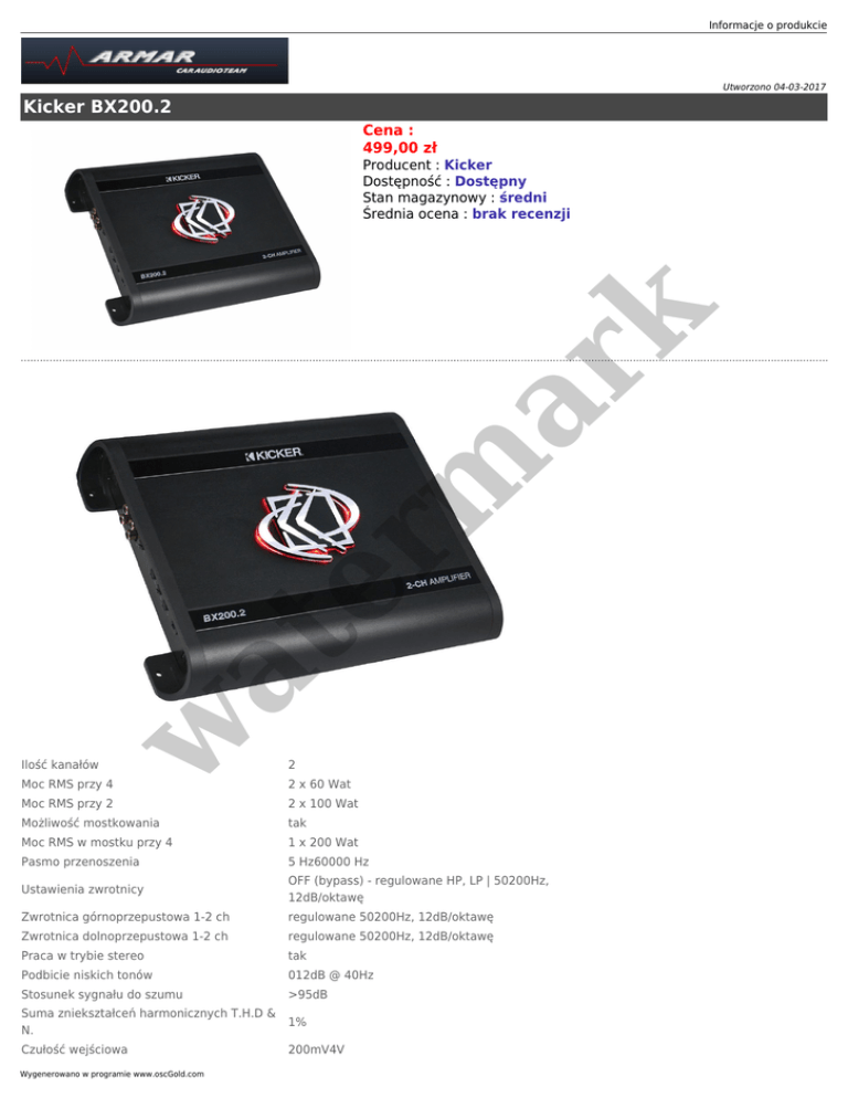Informacje o produkcie Utworzono 04-03-2017 Kicker BX200.2 Cena : 499,00 zł w at er m ar k Producent : Kicker Dostępność : Dostępny Stan magazynowy : średni Średnia ocena : brak recenzji Ilość kanałów 2 Moc RMS przy 4 2 x 60 Wat Moc RMS przy 2 2 x 100 Wat Możliwość mostkowania tak Moc RMS w mostku przy 4 1 x 200 Wat Pasmo przenoszenia 5 Hz60000 Hz Ustawienia zwrotnicy OFF (bypass) - regulowane HP, LP | 50200Hz, 12dB/oktawę Zwrotnica górnoprzepustowa 1-2 ch regulowane 50200Hz, 12dB/oktawę Zwrotnica dolnoprzepustowa 1-2 ch regulowane 50200Hz, 12dB/oktawę Praca w trybie stereo tak Podbicie niskich tonów 012dB @ 40Hz Stosunek sygnału do szumu >95dB Suma zniekształceń harmonicznych T.H.D & 1% N. Czułość wejściowa Wygenerowano w programie www.oscGold.com 200mV4V Wejście liniowe sygnału RCA tak Wejście sygnału Hi-level tak Wejście sygnału High Level 500mV10V Wyjście sygnału RCA Zdalne sterowanie basu tak - sterownik opcja/nie ma w komplecie Wskaźniki diagnostyczne zasilanie / zabezpieczenie / przegrzanie Zabezpieczenie prądowe 2x15A Wymiary (wys x szer x dłg) 5,4 x 22 x 27 er m ar k Seria Wzmacniaczy BX marki Kicker została zaprojektowana na potrzeby rynku europejskiego. Konstruktorzy kierowali nie zarówno upodobaniami muzycznymi europejskiego słuchacza, jak również wysokimi wymaganiami technicznymi stawianymi produktom marki Kicker. Wzmacniacze BX spełniają wszelkie europejskie normy i cechują się solidnym wykonaniem i ciekawym designem. Seria wzmacniaczy BX obejmuje trzy modele dwukanałowe, dwa modele czterokanałowe i dwa modele monofoniczne. Tak duży wybór pozwala na precyzyjne dopasowanie wzmacniacza do posiadanego systemu głośnikowego i subwoofera, aby zapewnić najlepsze wykorzystanie mocy . Logo Kickera z czerwonym podświetleniem i diamentowym wykończeniem Kompaktowe wymiary Wysokie osiągi przy niewielkim rozmiarze Komponenty przedwzmacniacza wykonane z najlepszych materiałów Wejście przedwzmacniacza z dużą szybkością narastania napięcia wyjściowego SR = 9V/uS Duże, odlewane i gwintowane terminale końcowe umożliwiają podłączenie grubych kabli prądowych i głośnikowych Bass Remote BXRC możliwość podłączenia zdalnego sterownika poziomu basu obsługiwanego z siedzenia kierowcy wszystkie modele. Sterownik w komplecie znajduje się tylko z modelami monofonicznymi. Do pozostałych modeli można sterownik dokupić oddzielnie. Możliwość podłączenia sygnału z radioodtwarzaczy nie posiadających wyjścia RCA za pomocą przewodów głośnikowych do wejścia High Level: 500mV10V. w at Kicker jest jednym z największych sponsorów w branży car audio Kicker - legendarna amerykańska marka oferująca przede wszystkim doskonałe subwoofery. To Kicker wprowadził kwadratowe subwoofery o potężnych mocach, nieodparcie kojarzone z tą właśnie marką. Dużej mocy subwoofery wymagają również dużej mocy wzmacniaczy - te również znajdują się w ofercie Kickera. Konstruktorzy Kickera są w czołówce branży wyznaczając nowe horyzonty w projektowaniu nowoczesnych systemów audio.
