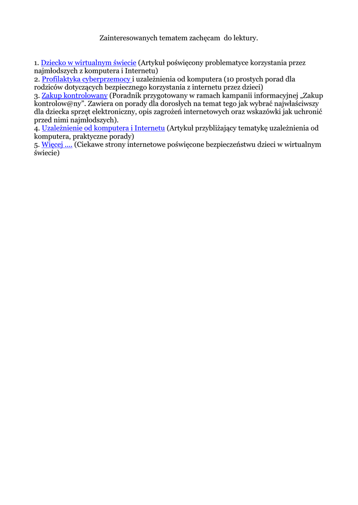 Zainteresowanych tematem zachęcam do lektury. 1. Dziecko w wirtualnym świecie (Artykuł poświęcony problematyce korzystania przez najmłodszych z komputera i Internetu) 2. Profilaktyka cyberprzemocy i uzależnienia od komputera (10 prostych porad dla rodziców dotyczących bezpiecznego korzystania z internetu przez dzieci) 3. Zakup kontrolowany (Poradnik przygotowany w ramach kampanii informacyjnej „Zakup kontrolow@ny”. Zawiera on porady dla dorosłych na temat tego jak wybrać najwłaściwszy dla dziecka sprzęt elektroniczny, opis zagrożeń internetowych oraz wskazówki jak uchronić przed nimi najmłodszych). 4. Uzależnienie od komputera i Internetu (Artykuł przybliżający tematykę uzależnienia od komputera, praktyczne porady) 5. Więcej .... (Ciekawe strony internetowe poświęcone bezpieczeństwu dzieci w wirtualnym świecie)
