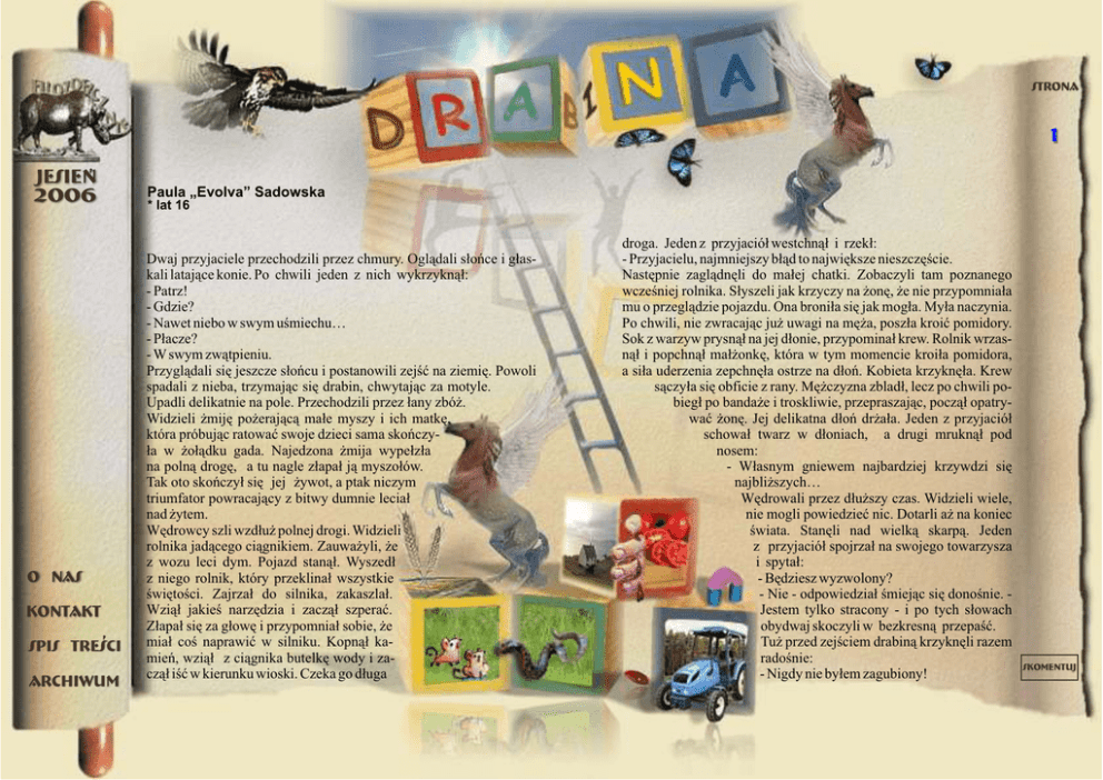 strona 1 , JESIEN 2006 Paula „Evolva” Sadowska * lat 16 o nas kontakt , spis tresci archiwum Dwaj przyjaciele przechodzili przez chmury. Oglądali słońce i głaskali latające konie. Po chwili jeden z nich wykrzyknął: - Patrz! - Gdzie? - Nawet niebo w swym uśmiechu… - Płacze? - W swym zwątpieniu. Przyglądali się jeszcze słońcu i postanowili zejść na ziemię. Powoli spadali z nieba, trzymając się drabin, chwytając za motyle. Upadli delikatnie na pole. Przechodzili przez łany zbóż. Widzieli żmiję pożerającą małe myszy i ich matkę, która próbując ratować swoje dzieci sama skończyła w żołądku gada. Najedzona żmija wypełzła na polną drogę, a tu nagle złapał ją myszołów. Tak oto skończył się jej żywot, a ptak niczym triumfator powracający z bitwy dumnie leciał nad żytem. Wędrowcy szli wzdłuż polnej drogi. Widzieli rolnika jadącego ciągnikiem. Zauważyli, że z wozu leci dym. Pojazd stanął. Wyszedł z niego rolnik, który przeklinał wszystkie świętości. Zajrzał do silnika, zakaszlał. Wziął jakieś narzędzia i zaczął szperać. Złapał się za głowę i przypomniał sobie, że miał coś naprawić w silniku. Kopnął kamień, wziął z ciągnika butelkę wody i zaczął iść w kierunku wioski. Czeka go długa droga. Jeden z przyjaciół westchnął i rzekł: - Przyjacielu, najmniejszy błąd to największe nieszczęście. Następnie zaglądnęli do małej chatki. Zobaczyli tam poznanego wcześniej rolnika. Słyszeli jak krzyczy na żonę, że nie przypomniała mu o przeglądzie pojazdu. Ona broniła się jak mogła. Myła naczynia. Po chwili, nie zwracając już uwagi na męża, poszła kroić pomidory. Sok z warzyw prysnął na jej dłonie, przypominał krew. Rolnik wrzasnął i popchnął małżonkę, która w tym momencie kroiła pomidora, a siła uderzenia zepchnęła ostrze na dłoń. Kobieta krzyknęła. Krew sączyła się obficie z rany. Mężczyzna zbladł, lecz po chwili pobiegł po bandaże i troskliwie, przepraszając, począł opatrywać żonę. Jej delikatna dłoń drżała. Jeden z przyjaciół schował twarz w dłoniach, a drugi mruknął pod nosem: - Własnym gniewem najbardziej krzywdzi się najbliższych… Wędrowali przez dłuższy czas. Widzieli wiele, nie mogli powiedzieć nic. Dotarli aż na koniec świata. Stanęli nad wielką skarpą. Jeden z przyjaciół spojrzał na swojego towarzysza i spytał: - Będziesz wyzwolony? - Nie - odpowiedział śmiejąc się donośnie. Jestem tylko stracony - i po tych słowach obydwaj skoczyli w bezkresną przepaść. Tuż przed zejściem drabiną krzyknęli razem radośnie: - Nigdy nie byłem zagubiony! skomentuj