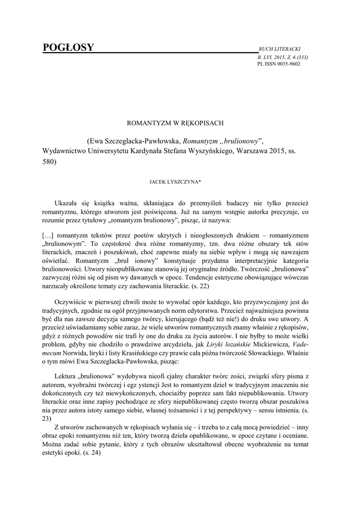 POGŁOSY RUCH LITERACKI R. LVI, 2015, Z. 6 (333) PL ISSN 0035-9602 ROMANTYZM W RĘKOPISACH (Ewa Szczeglacka-Pawłowska, Romantyzm „brulionowy”, Wydawnictwo Uniwersytetu Kardynała Stefana Wyszyńskiego, Warszawa 2015, ss. 580) JACEK LYSZCZYNA* Ukazała się książka ważna, skłaniająca do przemyśleń badaczy nie tylko przecież romantyzmu, którego utworom jest poświęcona. Już na samym wstępie autorka precyzuje, co rozumie przez tytułowy „romantyzm brulionowy”, pisząc, iż nazywa: […] romantyzm tekstów przez poetów ukrytych i nieogłoszonych drukiem – romantyzmem „brulionowym”. To częstokroć dwa różne romantyzmy, tzn. dwa różne obszary tek stów literackich, znaczeń i poszukiwań, choć zapewne miały na siebie wpływ i mogą się nawzajem oświetlać. Romantyzm „brul ionowy” konstytuuje przydatna interpretacyjnie kategoria brulionowości. Utwory nieopublikowane stanowią jej oryginalne źródło. Twórczość „brulionowa” zazwyczaj różni się od pism wy dawanych w epoce. Tendencje estetyczne obowiązujące wówczas narzucały określone tematy czy zachowania literackie. (s. 22) Oczywiście w pierwszej chwili może to wywołać opór każdego, kto przyzwyczajony jest do tradycyjnych, zgodnie na ogół przyjmowanych norm edytorstwa. Przecież najważniejsza powinna być dla nas zawsze decyzja samego twórcy, kierującego (bądź też nie!) do druku swe utwory. A przecież uświadamiamy sobie zaraz, że wiele utworów romantycznych znamy właśnie z rękopisów, gdyż z różnych powodów nie trafi ły one do druku za życia autorów. I nie byłby to może wielki problem, gdyby nie chodziło o prawdziwe arcydzieła, jak Liryki lozańskie Mickiewicza, Vademecum Norwida, liryki i listy Krasińskiego czy prawie cała późna twórczość Słowackiego. Właśnie o tym mówi Ewa Szczeglacka-Pawłowska, pisząc: Lektura „brulionowa” wydobywa nieofi cjalny charakter twórc zości, związki sfery pisma z autorem, wyobraźni twórczej i egz ystencji Jest to romantyzm dzieł w tradycyjnym znaczeniu nie dokończonych czy też niewykończonych, chociażby poprzez sam fakt niepublikowania. Utwory literackie oraz inne zapisy pochodzące ze sfery niepublikowanej często tworzą obszar poszukiwa nia przez autora istoty samego siebie, własnej tożsamości i z tej perspektywy – sensu istnienia. (s. 23) Z utworów zachowanych w rękopisach wyłania się – i trzeba to z całą mocą powiedzieć – inny obraz epoki romantyzmu niż ten, który tworzą dzieła opublikowane, w epoce czytane i oceniane. Można zadać sobie pytanie, który z tych obrazów ukształtował obecne wyobrażenie na temat estetyki epoki. (s. 24) 640 Pogłosy A kolejne rozdziały książki są właśnie poświęcone twórczości Mickiewicza, Słowackiego, Krasińskiego i Norwida – czterech wielkich poetów, których twórczość znana nam to w dużej mierze utwory całkowicie nieznane ich współczesnym, opublikowane dopiero po śmierci ich autorów – czasem zresztą wiele lat później – ale nam oczywiście automatycznie kojarząca się z kanonem lektur związanym z tymi nazwiskami. A przyczyny tego były przecież różne – niektóre utwory romantycy wpisywali przecież w „imionnikach” czy sztambuchach, skąd dopiero po latach wywiodła je na świat ciekawość edytorów, czasem – jak chociażby liryki Krasińskiego – wpisywane były w prywatne listy, czasem zaś – jak w przypadku Norwida – nieszczęśliwy splot edytorskich przypadków też sprawiał, że niektóre teksty ujrzały światło dzienne po wielu latach od ich napisania. * Jack Lyszczyna – prof. dr hab., Uniwersytet Śląski w Katowicach. Jak zauważa autorka książki, dawniej tego rodzaju brulionowe źródła – notesy itp. – spotykały się z zainteresowaniem wyłącznie jako źródła tekstów bądź ich wariantów, nie budziły więc zainteresowania edytorów ze względu na swe własne walory. A przecież często właśnie odczytanie utworów w ich „naturalnym” otoczeniu i kontekście, a więc tak, jak zostały naprawdę zapisane, daje nam wiele informacji o ich sensach niewidocznych w inny sposób. Stąd też postulat, aby jednak przyjrzeć się tym zespołom nie tylko jako źródłom tekstu, ale potraktować je całościowo jako godne zainteresowani jednostki edytorskie. Zresztą – jak zauważa Ewa Szczeglacka-Pawłowska – czasem używa się powszechnie nazw mylących, jak np. przyjęta w odniesieniu do notesu Mickiewicz nazwa „album Moszyńskiego”, sugerująca, że poeta wpisywał po prostu swoje utwory do czyjegoś zeszytu, tymczasem był to po prostu notatnik poetycki samego Mickiewicza, który dopiero później znalazł się w rękach Piotra Moszyńskiego. Wydaje się, że najlepszym rozwiązaniem byłoby przestrzeganie w edycjach krytycznych zasady zawartości druków i rękopisów, a więc zachowywanie całości zarówno pierwotnych edycji, jak i – osobno oczywiście – istniejących rękopisów. Myślę, że zasada taka pomogłaby też utrwalić w świadomości zainteresowanych zarówno istnienie konkretnych edycji – np. ważnych tomów poezji – jak i całości rękopiśmiennych. Autorka książki zwraca uwagę na rzecz jeszcze jedną, bardzo istotną. Otóż stwierdza, że istniejące obecnie możliwości cyfrowej reprodukcji autografów mają swe dwojakie ważne konsekwencje – otóż podnoszą bezpieczeństwo, bo reprodukcja rękopisu, dodajmy, że dość tania, oznacza jego bezpieczeństwo. Oczywiście zawsze można powiedzieć, że cyfrowa kopia to nie to samo co papierowy oryginał – i oczywiście będzie w tym racja. Z drugiej jednak strony znamy wiele przypadków zaginięcia oryginału i wtedy taka kopia jest jedynym dostępnym źródłem. Druga sprawa to kwestia dostępności tych kopii dzięki repozytoriom i bibliotekom cyfrowym – dzięki tej formie każdy ma dostęp do tekstów w tej postaci, które kiedyś, w papierowym oryginale, były praktycznie 