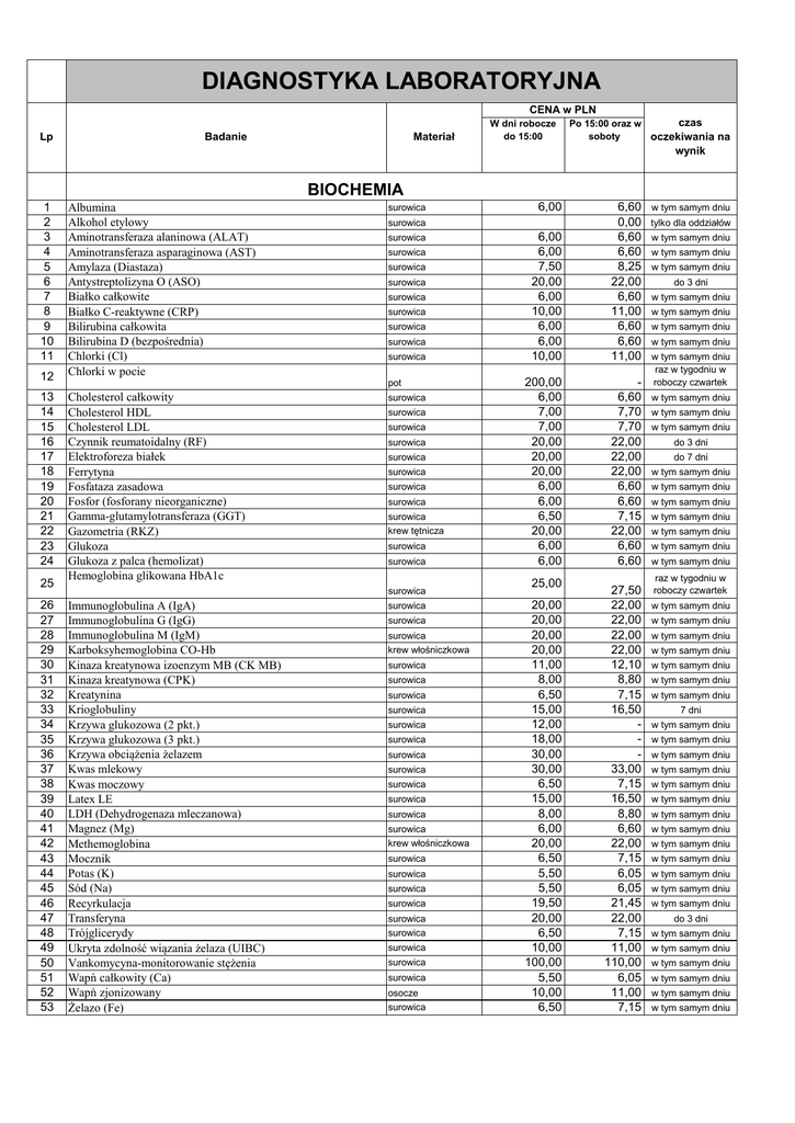 DIAGNOSTYKA LABORATORYJNA CENA w PLN Lp Materiał Badanie W dni robocze do 15:00 czas Po 15:00 oraz w soboty oczekiwania na wynik BIOCHEMIA 1 2 3 4 5 6 7 8 9 10 11 12 13 14 15 16 17 18 19 20 21 22 23 24 25 26 27 28 29 30 31 32 33 34 35 36 37 38 39 40 41 42 43 44 45 46 47 48 49 50 51 52 53 Albumina Alkohol etylowy Aminotransferaza alaninowa (ALAT) Aminotransferaza asparaginowa (AST) Amylaza (Diastaza) Antystreptolizyna O (ASO) Białko całkowite Białko C-reaktywne (CRP) Bilirubina całkowita Bilirubina D (bezpośrednia) Chlorki (Cl) Chlorki w pocie surowica surowica surowica surowica surowica surowica surowica surowica surowica surowica pot Cholesterol całkowity Cholesterol HDL Cholesterol LDL Czynnik reumatoidalny (RF) Elektroforeza białek Ferrytyna Fosfataza zasadowa Fosfor (fosforany nieorganiczne) Gamma-glutamylotransferaza (GGT) Gazometria (RKZ) Glukoza Glukoza z palca (hemolizat) Hemoglobina glikowana HbA1c surowica surowica surowica surowica surowica surowica surowica surowica surowica krew włośniczkowa; krew tętnicza surowica surowica surowica Immunoglobulina A (IgA) Immunoglobulina G (IgG) Immunoglobulina M (IgM) Karboksyhemoglobina CO-Hb Kinaza kreatynowa izoenzym MB (CK MB) Kinaza kreatynowa (CPK) Kreatynina Krioglobuliny Krzywa glukozowa (2 pkt.) Krzywa glukozowa (3 pkt.) Krzywa obciążenia żelazem Kwas mlekowy Kwas moczowy Latex LE LDH (Dehydrogenaza mleczanowa) Magnez (Mg) Methemoglobina Mocznik Potas (K) Sód (Na) Recyrkulacja Transferyna Trójglicerydy Ukryta zdolność wiązania żelaza (UIBC) Vankomycyna-monitorowanie stężenia Wapń całkowity (Ca) Wapń zjonizowany Żelazo (Fe) 6,00 6,00 6,00 7,50 20,00 6,00 10,00 6,00 6,00 10,00 6,60 0,00 6,60 6,60 8,25 22,00 6,60 11,00 6,60 6,60 11,00 200,00 6,00 7,00 7,00 20,00 20,00 20,00 6,00 6,00 6,50 20,00 6,00 6,00 6,60 7,70 7,70 22,00 22,00 22,00 6,60 6,60 7,15 22,00 6,60 6,60 surowica surowica surowica surowica krew włośniczkowa surowica surowica surowica surowica surowica surowica surowica surowica surowica surowica surowica surowica krew włośniczkowa surowica surowica surowica surowica surowica surowica surowica surowica surowica osocze surowica 25,00 20,00 20,00 20,00 20,00 11,00 8,00 6,50 15,00 12,00 18,00 30,00 30,00 6,50 15,00 8,00 6,00 20,00 6,50 5,50 5,50 19,50 20,00 6,50 10,00 100,00 5,50 10,00 6,50 27,50 22,00 22,00 22,00 22,00 12,10 8,80 7,15 16,50 33,00 7,15 16,50 8,80 6,60 22,00 7,15 6,05 6,05 21,45 22,00 7,15 11,00 110,00 6,05 11,00 7,15 w tym samym dniu tylko dla oddziałów w tym samym dniu w tym samym dniu w tym samym dniu do 3 dni w tym samym dniu w tym samym dniu w tym samym dniu w tym samym dniu w tym samym dniu raz w tygodniu w roboczy czwartek w tym samym dniu w tym samym dniu w tym samym dniu do 3 dni do 7 dni w tym samym dniu w tym samym dniu w tym samym dniu w tym samym dniu w tym samym dniu w tym samym dniu w tym samym dniu raz w tygodniu w roboczy czwartek w tym samym dniu w tym samym dniu w tym samym dniu w tym samym dniu w tym samym dniu w tym samym dniu w tym samym dniu 7 dni w tym samym dniu w tym samym dniu w tym samym dniu w tym samym dniu w tym samym dniu w tym samym dniu w tym samym dniu w tym samym dniu w tym samym dniu w tym samym dniu w tym samym dniu w tym samym dniu w tym samym dniu do 3 dni w tym samym dniu w tym samym dniu w tym samym dniu w tym samym dniu w tym samym dniu w tym samym dniu IMMUNOCHEMIA 28,00 50,00 25,00 30,00 30,00 30,00 30,80 do 3 dni 55,00 do 3 dni 27,50 do 3 dni 33,00 do 3 dni 33,00 w tym samym dniu 33,00 w tym samym dniu surowica 30,00 25,00 80,00 32,00 33,00 w tym samym dniu 27,50 w tym samym dniu 88,00 do 5 dni 35,20 w tym samym dniu Estradiol surowica 27,00 29,70 64 F PSA wolne surowica 35,00 38,50 65 FSH FT3 FT4 hCG + beta - gonadotropina kosmówkowa HE4 NOWOŚĆ! IgE Kortyzol Kwas foliowy surowica 27,00 19,00 19,00 35,00 65,00 25,00 30,00 32,00 29,70 20,90 20,90 38,50 71,50 27,50 33,00 35,20 53 54 55 56 57 58 surowica 60 61 62 Alfa-fetoproteina (AFP) Anty-CCP Anty-TG anty-TPO CA 125 - antygen raka jajnika CA 15-3 - antygen raka piersi CA 19-9 -antygen raka przewodu pokarmowego (m.in. trzustki, dróg żółciowych, jelita grubego) CEA - Antygen karcinoembrionalny C-peptyd Digoksyna 63 59 66 67 68 69 70 71 72 73 surowica surowica surowica surowica surowica surowica surowica surowica surowica surowica surowica surowica surowica surowica surowica w tym samym dniu, po godz. 15:00 w tym samym dniu, po godz. 15:00 w tym samym dniu, po godz. 15:00 w tym samym dniu w tym samym dniu w tym samym dniu do 3 dni w tym samym dniu w tym samym dniu w tym samym dniu w tym samym dniu, po godz. 15:00 surowica 27,00 80,00 30,00 29,70 88,00 w tym samym dniu 33,00 w tym samym dniu Progesteron surowica 27,00 29,70 77 Prolaktyna surowica 27,00 29,70 78 Prolaktyna po metoklopramidzie (2 ozn.) ROMA -Ocena ryzyka obecności raka jajnika (Ca125+HE4+Algorytm oceny ryzyka) NOWOŚĆ! Testosteron Total PSA -Swoisty antygen prostaty (całkowity) Troponina TSH Witamina B 12 Witamina D Total surowica 54,00 59,40 LH NT-proBNP Parathormon (PTH) surowica 74 75 76 79 80 81 82 83 84 85 surowica surowica surowica surowica surowica surowica surowica surowica 95,00 w tym samym dniu, po godz. 15:00 w tym samym dniu, po godz. 15:00 w tym samym dniu, po godz. 15:00 30,00 30,00 25,00 18,00 25,00 60,00 104,50 33,00 33,00 27,50 19,80 27,50 66,00 50,00 55,00 do 3 tygodni 143,00 55,00 do 3 tygodni 132,00 71,50 71,50 38,50 38,50 55,00 do 3 tygodni 143,00 do 3 tygodni do 3 dni w tym samym dniu w tym samym dniu w tym samym dniu w tym samym dniu w tym samym dniu do 3 dni AUTOIMMUNOLOGIA 86 ANA – met.IIF surowica ANA – profil 3 (LineBlot- zawiera: nRNP/Sm, Sm, SS-A, Ro-52, SS-B, Scl- 87 70, Jo-1, CENT B, PCNA, dsDNA, nukleosomy, histony, rib. Białko P, AMAM2) surowica ANCA – met.IIF surowica ANCA - test potwierdzenia (LineBlot zawiera: anty-MPO, PR3, GBM) Anty-gliadyna IgA i endomysium – met.IIF Anty-gliadyna IgG i endomysium – met.IIF Anty-transglutaminaza tkankowa IgA (ELISA) Anty-transglu
