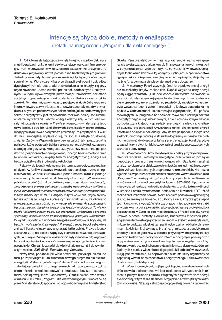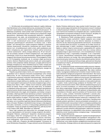 Tomasz E. Kołakowski Członek SEP Intencje są chyba dobre, metody nienajlepsze (notatki na marginesach „Programu dla elektroenergetyki”) 1. Od kilkunastu lat przedstawiciele kolejnych rządów deklarują chęć liberalizacji rynku energii elektrycznej, prywatyzacji firm energetycznych i wprowadzenie w tej dziedzinie zasad konkurencyjnych. Te deklaracje przybierały nawet postać dość konkretnych programów. Jednak prawie natychmiast proces realizacji tych programów ulegał spowolnieniu. Wprawdzie kilka prywatyzacji elektrowni i zakładów dystrybucyjnych się udało, ale przekształcenia te toczyły się przy organizowanych „samorzutnie” protestach społecznych i politycznych i w rytm wywalczanych przez związki zawodowe pakietach socjalnych gwarantujących zatrudnienie na dłuższy czas, a także zarobki. Tym dramatycznym często przejawom dbałości o grupowe interesy towarzyszyły nieustannie, powtarzane jak mantry stwierdzenia o tym, że podstawowym celem zmian, jakim poddawany jest sektor energetyczny jest zapewnienie możliwie pełnej konkurencji w sferze wytwarzania i obrotu energią elektryczną. W tym kierunku szły też przepisy zawarte w Prawie energetycznym, ale częste jego nowelizacje, a było ich już około dwudziestu, stępiały ostrze podstaw mogących stymulować prorynkowe przemiany. Po przystąpieniu Polski do Unii Europejskiej wydawało się, że sytuacja uległa gruntownej zmianie. Zarówno Wspólnota jako pewna całość, jak i poszczególne państwa, które podpisały traktaty akcesyjne, przyjęły jednoznacznie strategię energetyczną, którą charakteryzują trzy hasła: energia jest i będzie (bezpieczeństwo energetyczne), energia będzie możliwie tania (w wyniku konkurencji między firmami energetycznymi), energia nie będzie uciążliwa dla środowiska (ekologia). Pojawiły się jednak kolejne mantry, tym razem dotyczące realizacji dyrektyw Unii w obszarze tworzenia europejskiego rynku energii elektrycznej. W celu zilustrowania podać można cytat z jednego z najnowszych prasowych artykułów zatytułowanego: „Wzmacnianie polskiego prądu” (tak jakby elektrony czy dziury miały narodowość): „Importowana energia elektryczna zalałaby nasz rynek po wejściu w życie rozporządzeń wykonawczych do prawa energetycznego uchwalonego przez Sejm w 1997 r. między innymi wówczas, gdyby byłaby tańsza od naszej. Prąd w Polsce był tani dzięki temu, że okradano w majestacie prawa górnictwo – węgiel dla energetyki sprzedawany był przymusowo dla górnictwa poniżej kosztów wydobycia. To nie kopalnie kalkulowały ceny węgla, ale energetyka, wychodząc z prognoz sprzedaży, odejmują sobie koszty dystrybucji, przesyłu i wytwarzania. W wyniku podobnych wyliczeń energetyka informowała kopalnie, ile będzie mogła zapłacić za węgiel.” Przyznać trzeba, że potrzeba wiele złej woli i braku wiedzy, aby wygłaszać takie opinie. Prawdą jednak jest także, że to nie polskie rządy były liderami blokowania liberalizacji rynku w Europie. Wiodące w tej dziedzinie były rosnące w siłę oligopole francuskie, niemieckie, a w końcu w miarę postępu globalizacji ponad europejskie. Chyba nie zdradzi się wielkiej tajemnicy, jeśli się wymieni w tym miejscu EdF, RWE, Electrabel czy Vattenfall. Nowy rząd, podobnie jak wiele przed nim, przystąpił niemal od razu po zaprzysiężeniu do tworzenia nowego programu dla elektroenergetyki. Wybrano „właściwych” ekspertów i zbudowano program zmieniający układ firm energetycznych tak, aby powstały „silne ekonomicznie przedsiębiorstwa” o strukturze jeszcze nieznanej, może holdingowej, może koncernowej. Opublikowane dwie wersje w marcu 2006 roku „Programu dla elektroenergetyki” firmowane są przez Ministerstwo Gospodarki. Po jego wdrożeniu przez Ministerstwo strona 298 Skarbu Państwa elektrownie mają uzyskać środki finansowe i gwarancje wystarczające dla banków do finansowania nowych inwestycji w dotychczasowych źródłach, czyli na odtworzenie w nowocześniejszym technicznie kształcie tej energetyki jaka jest, a społeczeństwo i gospodarka ma kupować energię po cenach wyższych, ale jakby nie na tyle (przypominają się plusy ujemne i plusy dodatnie). 2. Mieszkańcy Polski zużywają średnio o połowę mniej energii niż mieszkańcy krajów zachodnich. Dopóki względne ceny energii będą ciągle wzrastały (a są one obecnie najwyższe na świecie w stosunku do siły nabywczej gospodarstw domowych), nie powiększy się w sposób istotny jej zużycie, co przełoży się na słaby wzrost popytu wewnętrznego, a zatem i produkcji, a krajowa gospodarka nie będzie w żadnym stopniu konkurencyjna z gospodarką UE i państw rozwiniętych. W programie bez osłonek mówi się o rozwoju sektora energetycznego w ujęciu branżowym, a nie o kompleksowym rozwoju gospodarczym kraju; o wyprzedaży energetyki, a nie o racjonalizacji zużycia, decentralizacji wytwarzania taniej, ekologicznej energii i w efekcie obniżaniu cen energii. Aby nasza gospodarka mogła stać się konkurencyjną i twórczą w stosunku do przemysłu państw zachodnich, musi mieć do dyspozycji tańszą energię, gdyż jej koszt decyduje w zasadniczym stopniu, jak kosztowna jest produkcja poszczególnych towarów i ceny usług. 3. W opracowaniu brak merytorycznej analizy przyczyn niepowodzeń we wdrażaniu reformy w energetyce, praktycznie od początku rozpoczęcia procesu transformacji gospodarki. Bez takiej rzetelnej analizy i wyciągnięcia obiektywnych wniosków nie jest możliwe rzeczywiste wdrożenie następnych programów reformatorskich. Nie można zgodzić się w pełni ze stwierdzeniami zawartymi we wprowadzeniu do „Programu”, a mówiącymi o głównych przyczynach niezrealizowania planów restrukturyzacji energetyki w latach 1997–2005. Upatrywanie niepowodzeń realizacji nakreślonych planów w braku jednomyślności w rządzie i braku systemowego podejścia do likwidacji KDT uznać mo