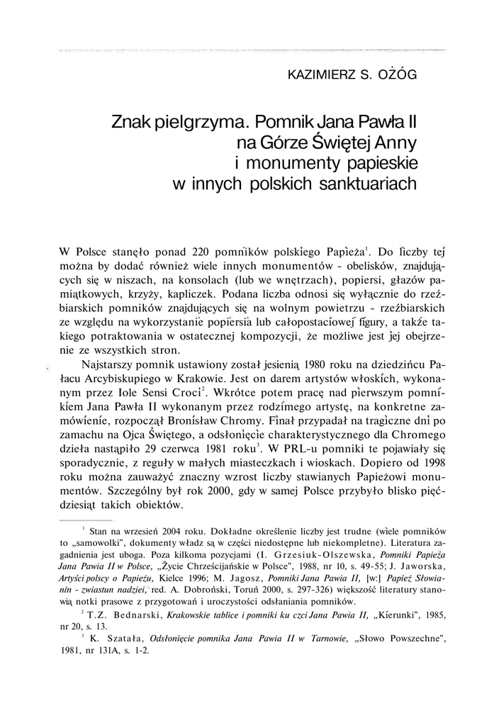 KAZIMIERZ S. OZOG Znak pielgrzyma. Pomnik Jana Pawła II na Górze Świętej Anny i monumenty papieskie w innych polskich sanktuariach W Polsce stanęło ponad 220 pomników polskiego Papieża1. Do liczby tej można by dodać również wiele innych monumentów - obelisków, znajdujących się w niszach, na konsolach (lub we wnętrzach), popiersi, głazów pamiątkowych, krzyży, kapliczek. Podana liczba odnosi się wyłącznie do rzeźbiarskich pomników znajdujących się na wolnym powietrzu - rzeźbiarskich ze względu na wykorzystanie popiersia lub całopostaciowej figury, a także takiego potraktowania w ostatecznej kompozycji, że możliwe jest jej obejrzenie ze wszystkich stron. Najstarszy pomnik ustawiony został jesienią 1980 roku na dziedzińcu Pałacu Arcybiskupiego w Krakowie. Jest on darem artystów włoskich, wykonanym przez Iole Sensi Croci 2 . Wkrótce potem pracę nad pierwszym pomnikiem Jana Pawła II wykonanym przez rodzimego artystę, na konkretne zamówienie, rozpoczął Bronisław Chromy. Finał przypadał na tragiczne dni po zamachu na Ojca Świętego, a odsłonięcie charakterystycznego dla Chromego dzieła nastąpiło 29 czerwca 1981 roku 3 . W PRL-u pomniki te pojawiały się sporadycznie, z reguły w małych miasteczkach i wioskach. Dopiero od 1998 roku można zauważyć znaczny wzrost liczby stawianych Papieżowi monumentów. Szczególny był rok 2000, gdy w samej Polsce przybyło blisko pięćdziesiąt takich obiektów. 1 Stan na wrzesień 2004 roku. Dokładne określenie liczby jest trudne (wiele pomników to „samowolki", dokumenty władz są w części niedostępne lub niekompletne). Literatura zagadnienia jest uboga. Poza kilkoma pozycjami (I. G r z e s i u k - O l s z e w s k a , Pomniki Papieża Jana Pawia II w Polsce, „Życie Chrześcijańskie w Polsce", 1988, nr 10, s. 49-55; J. Jaworska, Artyści polscy o Papieżu, Kielce 1996; M. Jagosz, Pomniki Jana Pawia II, [w:] Papież Słowianin - zwiastun nadziei, red. A. Dobroński, Toruń 2000, s. 297-326) większość literatury stanowią notki prasowe z przygotowań i uroczystości odsłaniania pomników. 2 T.Z. Bednarski, Krakowskie tablice i pomniki ku czci Jana Pawia II, „Kierunki", 1985, nr 20, s. 13. 3 K. Szatała, Odsłonięcie pomnika Jana Pawia II w Tarnowie, „Słowo Powszechne", 1981, nr 131A, s. 1-2. 170 Kazimierz S. Ożóg Pomniki te fundowane są najczęściej przez wiernych, niekiedy angażują się władze lokalne (np. ofiarowując działkę) czy media. Czasem grupa sponsorów jest bardzo wąska (jedna osoba czy rodzina). Przy zamawianiu oszczędność walczy z pragnieniem posiadania dzieła sztuki. Równie często jak zamawianie oryginalnych projektów u uznanych i drogich artystów zdarza się kupowanie miernych odlewów brązowych bądź polimerowych. W tworzenie pomników Papieża zaangażowani są rzeźbiarze wszystkich pokoleń, wywodzący się z najróżniejszych szkół i pracowni. Pojawiają się zarówno nazwiska najsłynniejszych twórców, jak i amatorów, dla których częstokroć nieporadna statua jest ukoronowaniem życiowej twórczości. W rozmieszczeniu geograficznym odbijają się wciąż granice zaborów. Wstrzemięźliwość zachowują regiony zachodnie i północne. Więcej pomników jest na terenie dawnej Kongresówki. Ogromne ich zagęszczenie pojawia się w dawnej Galicji - w diecezji krakowskiej stoi 27 pomników Papieża, w tarnowskiej jedynie o sześć mniej 4 . Pomniki Ojca Świętego istnieją też w krajach o licznej Polonii - w USA, Kanadzie, Brazylii, Argentynie, ale także w Japonii czy Rumunii. Z łatwością można wychwycić grupę pomników znajdujących się przy sanktuariach. Nie jest oczywiście regułą, że w każdym ośrodku pielgrzymkowym staje pomnik Jana Pawła II, niemniej jednak stanowią one sporą część ogólnej liczby tych obiektów. W Polsce znajdziemy je w miejscach najbardziej znanych — na Jasnej Górze, w Licheniu, a także w Limanowej, Kaliszu, Janowie Lubelskim, Zamościu i wielu innych 5 . Pomnik taki — prędzej czy później - musiał powstać również na Górze Świętej Anny. Na szczęście rozsądny Śląsk nie spieszył się z jego wzniesieniem. Dzięki temu powstało dzieło udane, wykonane przez wybitnego artystę, dobrze wkomponowane w otoczenie, historię i rangę miejsca. Umiar zachowały też inne sanktuaria w tej części Polski. Wiele z nich ograniczyło się do tablicy pamiątkowej, niektóre wolały nie myśleć o upamiętnianiu Jana Pawła II za życia. Pomniki znalazły się, oprócz Góry Świętej Anny, tylko w Bardzie i Trzebnicy. Każde z tych sanktuariów ma odmienne znaczenie i historię kontaktów z osobą Ojca Świętego. Granitowe popiersie w Bardzie powstało jako jeden z pierwszych pomni6 ków Papieża Polaka. Odsłonięte zostało 17 października 1981 roku . Hieratyczne w formie dzieło warszawskiego artysty Adama Romana stoi przy wejściu do sanktuarium Matki Bożej Bardzkiej „Strażniczki Wiary"7. Mimo du4 Na Śląsku w diecezji katowickiej nie ma pomnika, z kolei w opolskiej jest jeden, w gliwickiej - jeden i wrocławskiej (przed 2004 rokiem) - jedenaście. 5 Za granicą będzie to m.in. Mariazell (Austria), Altótting (Niemcy), Doylestown (USA), Guadalupe (Meksyk), Midland (Kanada). 6 K. Piśniak, Z brązu, granitu i piaskowca, „Gazeta Wyborcza Wrocław", 2000, nr 115, s. 5. 7 K . Plebanek, Sanktuarium Matki Bożej Strażniczki Wiary - Bardo Śląskie, Bardo Śląskie 1985, s. 78. Znak pielgrzyma 171 żych rozmiarów figury pomnik ten nie przytłacza, dobrze też wpisuje się w swoje otoczenie. Kontakty Karola Wojtyły z Bardem są jednak bardzo ograniczone — był on tam krótko, we wrześniu 1957 roku. Wybór Jana Pawła II nastąpił w dzień świętej Jadwigi Śląskiej, patronki sanktuarium w Trzebnicy. Osiemnaście lat później, 13 października 1996 roku, odsłomęto tam pomnik Jana Pawła II 8 (ił. 73). Nie zaangażowano tym razem znakomitego artysty, poprzestając na zaku