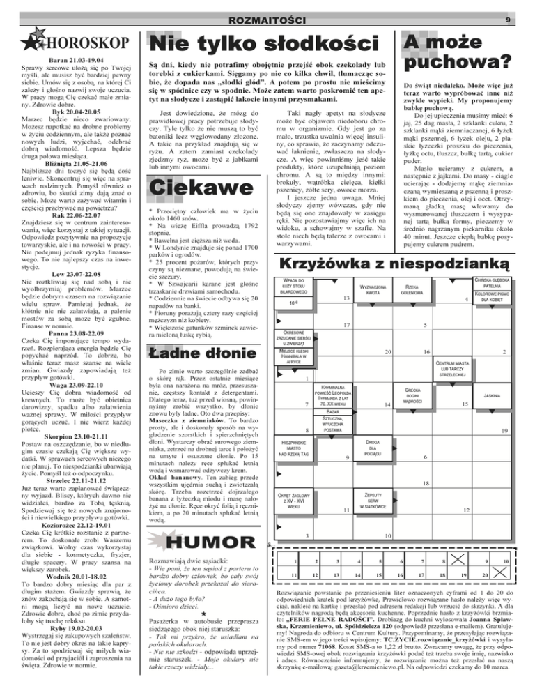 ROZMAITOŚCI HOROSKOP Baran 21.03-19.04 Sprawy sercowe ułożą się po Twojej myśli, ale musisz być bardziej pewny siebie. Umów się z osobą, na której Ci zależy i głośno nazwij swoje uczucia. W pracy mogą Cię czekać małe zmiany. Zdrowie dobre. Byk 20.04-20.05 Marzec będzie nieco zwariowany. Możesz napotkać na drobne problemy w życiu codziennym, ale także poznać nowych ludzi, wyjechać, odebrać dobrą wiadomość. Lepsza będzie druga połowa miesiąca. Bliźnięta 21.05-21.06 Najbliższe dni toczyć się będą dość leniwie. Skoncentruj się więc na sprawach rodzinnych. Pomyśl również o zdrowiu, bo skutki zimy dają znać o sobie. Może warto zażywać witamin i częściej przebywać na powietrzu? Rak 22.06-22.07 Znajdziesz się w centrum zainteresowania, więc korzystaj z takiej sytuacji. Odpowiedz pozytywnie na propozycje towarzyskie, ale i na nowości w pracy. Nie podejmuj jednak ryzyka finansowego. To nie najlepszy czas na inwestycje. Lew 23.07-22.08 Nie roztkliwiaj się nad sobą i nie wyolbrzymiaj problemów. Marzec będzie dobrym czasem na rozwiązanie wielu spraw. Pamiętaj jednak, że kłótnie nic nie załatwiają, a palenie mostów za sobą może być zgubne. Finanse w normie. Panna 23.08-22.09 Czeka Cię imponujące tempo wydarzeń. Rozpierająca energia będzie Cię popychać naprzód. To dobrze, bo właśnie teraz masz szanse na wiele zmian. Gwiazdy zapowiadają też przypływ gotówki. Waga 23.09-22.10 Ucieszy Cię dobra wiadomość od krewnych. To może być obietnica darowizny, spadku albo załatwienia ważnej sprawy. W miłości przypływ gorących uczuć. I nie wierz każdej plotce. Skorpion 23.10-21.11 Postaw na oszczędzanie, bo w niedługim czasie czekają Cię większe wydatki. W sprawach sercowych niczego nie planuj. To niespodzianki ubarwiają życie. Pomyśl też o odpoczynku. Strzelec 22.11-21.12 Już teraz warto zaplanować świąteczny wyjazd. Bliscy, których dawno nie widziałeś, bardzo za Tobą tęsknią. Spodziewaj się też nowych znajomości i niewielkiego przypływu gotówki. Koziorożec 22.12-19.01 Czeka Cię krótkie rozstanie z partnerem. To doskonale zrobi Waszemu związkowi. Wolny czas wykorzystaj dla siebie - kosmetyczka, fryzjer, długie spacery. W pracy szansa na większy zarobek. Wodnik 20.01-18.02 To bardzo dobry miesiąc dla par z długim stażem. Gwiazdy sprawią, że znów zakochają się w sobie. A samotni mogą liczyć na nowe uczucie. Zdrowie dobre, choć po zimie przydałoby się trochę relaksu. Ryby 19.02-20.03 Wystrzegaj się zakupowych szaleństw. To nie jest dobry okres na takie kaprysy. Za to spodziewaj się miłych wiadomości od przyjaciół i zaproszenia na święta. Zdrowie w normie. 9 Nie tylko słodkości A może puchowa? Są dni, kiedy nie potrafimy obojętnie przejść obok czekolady lub torebki z cukierkami. Sięgamy po nie co kilka chwil, tłumacząc sobie, że dopada nas „słodki głód”. A potem po prostu nie mieścimy się w spódnice czy w spodnie. Może zatem warto poskromić ten apetyt na słodycze i zastąpić łakocie innymi przysmakami. Jest dowiedzione, że mózg do prawidłowej pracy potrzebuje słodyczy. Tyle tylko że nie muszą to być batoniki lecz węglowodany złożone. A takie na przykład znajdują się w ryżu. A zatem zamiast czekolady zjedzmy ryż, może być z jabłkami lub innymi owocami. Ciekawe * Przeciętny człowiek ma w życiu około 1460 snów. * Na wieżę Eiffla prowadzą 1792 stopnie. * Bawełna jest cięższa niż woda. * W Londynie znajduje się ponad 1700 parków i ogrodów. * 25 procent pożarów, których przyczyny są nieznane, powodują na świecie szczury. * W Szwajcarii karane jest głośne trzaskanie drzwiami samochodu. * Codziennie na świecie odbywa się 20 napadów na banki. * Pioruny porażają cztery razy częściej mężczyzn niż kobiety. * Większość gatunków szminek zawiera mieloną łuskę rybią. Ładne dłonie Po zimie warto szczególnie zadbać o skórę rąk. Przez ostatnie miesiące była ona narażona na mróz, przesuszanie, częstszy kontakt z detergentami. Dlatego teraz, tuż przed wiosną, powinnyśmy zrobić wszystko, by dłonie znowu były ładne. Oto dwa przepisy: Maseczka z ziemniaków. To bardzo prosty, ale i doskonały sposób na wygładzenie szorstkich i spierzchniętych dłoni. Wystarczy obrać surowego ziemniaka, zetrzeć na drobnej tarce i położyć na umyte i osuszone dłonie. Po 15 minutach należy ręce spłukać letnią wodą i wsmarować odżywczy krem. Okład bananowy. Ten zabieg przede wszystkim ujędrnia suchą i zwiotczałą skórę. Trzeba rozetrzeć dojrzałego banana z łyżeczką miodu i masę nałożyć na dłonie. Ręce okryć folią i ręcznikiem, a po 20 minutach spłukać letnią wodą. Taki nagły apetyt na słodycze może być objawem niedoboru chromu w organizmie. Gdy jest go za mało, trzustka uwalnia więcej insuliny, co sprawia, że zaczynamy odczuwać łaknienie, zwłaszcza na słodycze. A więc powinniśmy jeść takie produkty, które uzupełniają poziom chromu. A są to między innymi: brokuły, wątróbka cielęca, kiełki pszenicy, żółte sery, owoce morza. I jeszcze jedna uwaga. Mniej słodyczy zjemy wówczas, gdy nie będą się one znajdowały w zasięgu ręki. Nie pozostawiajmy więc ich na widoku, a schowajmy w szafie. Na stole niech będą talerze z owocami i warzywami. Krzyżówka z niespodzianką WPADA DO ŁUZY STOŁU BILARDOWEGO Pasażerka w autobusie przeprasza siedzącego obok niej staruszka: - Tak mi przykro, że usiadłam na pańskich okularach. - Nic nie szkodzi - odpowiada uprzejmie staruszek. - Moje okulary nie takie rzeczy widziały... WYZNACZONA KWOTA 13 10 6 CHIŃSKA GŁĘBOKA PATELNIA RZEKA GOLENIOWA 17 OKRESOWE 4 KOLOROWE PISMO DLA KOBIET 5 ZRZUCANIE SIERŚCI U ZWIERZĄT MIEJSCE KLĘSKI HANNIBALA W 20 16 AFRYCE 2 CENTRUM MIASTA LUB TARCZY STRZELECKIEJ 1 7 KRYMINALNA POWIEŚĆ LEOPOLDA TYRMANDA Z LAT 70. XX WIEKU 8 WYUCZONA POSTAWA GRECKA BOGINI MĄDROŚCI 14 BA