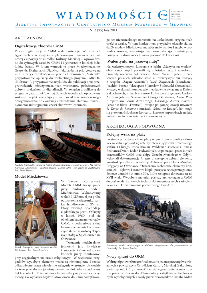 WIADOMOŚCI BIULETYN INFORMACYJNY CENTRALNEGO MUZEUM MORSKIEGO W GDAŃSKU Nr 2 (95) luty 2011 AKT UA LNOŚ CI Digitalizacja zbiorów CMM Proces digitalizacji w CMM stale postępuje. W ostatnich tygodniach – w związku z planowanym umieszczeniem na nowej ekspozycji w Ośrodku Kultury Morskiej – wprowadzono do cyfrowych zasobów CMM 14 jednostek z kolekcji łodzi ludów świata. W lutym wznowiono prace Międzymuzealnej Grupy ds. Digitalizacji DigiMuz. Jako zadania priorytetowe na 2011 r. przyjęto: zakończenie prac nad tezaurusem „Materiał”, przygotowanie aplikacji do wieloletniego programu MKiDN „Kultura+”, przygotowanie artykułów do publikacji oraz przeprowadzenie międzymuzealnych warsztatów poświęconych dobrym praktykom w digitalizacji. W związku z aplikacją do programu „Kultura+”, w najbliższych tygodniach opracowany zostanie projekt zakładający m.in. pozyskanie nowoczesnego oprogramowania do ewidencji i zarządzania zbiorami muzealnymi oraz udostępnienie części zbiorów w Internecie. go bez niepotrzebnego narażania na uszkodzenia oryginalnych części z wraka. W tym konkretnym przypadku okazało się, że dziób modelu Miedziowca ma zbyt mały wznios i trzeba wprowadzić korektę, demontując i na nowo układając przednie pasy poszycia. Budowa modelu może potrwać do końca roku. „Walentynki na jazzową nutę” Na walentynkowym koncercie z cyklu „Muzyka na wodzie” obok zakochanych pojawili się miłośnicy jazzu i saksofonu. Gwiazdą wieczoru był bowiem Adam Wendt, jeden z czołowych polskich saksofonistów, a towarzyszyli mu muzycy z zespołu „Zagan Acoustic”: Paweł Zagańczyk (akordeon), Joachim Łuczak (skrzypce) i Jarosław Stokowski (kontrabas). Muzycy wykonali kompozycje nieodzownie związane z Dniem Zakochanych, m.in. bossa novę Dziewczyna z Ipanemy Carlosa Antonio Jobima, Summertime Georga Gershwina, Moon River z repertuaru Louisa Armstronga, Libertango Astora Piazzolli (znane z filmu „Frantic”), bisując po gorącej owacji utworem El Tango de Roxanne z musicalu „Mouline Rouge”. Jak mogli się przekonać słuchacze koncertu, jazzowe improwizacje nadały znanym melodiom świeżości i nowego wyrazu. A R C HE O L O GI A P O DWO D NA Kolejny wrak na plaży Kolekcja łodzi ludów świata w trakcie dokumentowania w formie cyfrowej. Na zdjęciu Krzysztof Zamościński – opiekun kolekcji i Marcin Kłos – szef grupy ds. digitalizacji. Fot. Paweł Jóźwiak Model Miedziowca W Pracowni Konserwacji Modeli CMM trwają prace przy budowie modelu Miedziowca. Wykonywany w skali 1: 25 model jest próbą odtworzenia wizerunku statku handlowego z XV w., który zatonął, wychodząc z gdańskiego portu. Odkryty w latach 1960., stał się obiektem badań archeologów CMM, a podniesione z dna ładunek i elementy konstrukcyjne statku są ozdobą ekspozycji stałej w Spichlerzach na Ołowiance. Tworzenie modelu danej jednostki jest łatwiejsze Marek Parczyński przy budowie modelu Miedziowca. Fot. Bernadeta Galus i znacznie tańsze od jakiejkolwiek pracy montażowej przy oryginalnym materiale zabytkowym. W większości przypadków wydobyte elementy wraka są niekompletne i często odkształcone przez wieloletnie zaleganie w gruncie lub wodzie i z tego powodu nie jesteśmy pewni, jak dokładnie zbudowany był taki obiekt. Prace na modelu pozwalają na pewne eksperymenty, a w wypadku błędów łatwo wrócić do stanu początkowe- Po zimowych sztormach na plaży – tym razem w okolicy orłowskiego klifu – pojawił się kolejny interesujący wrak drewnianego statku. 11 lutego Iwona Pomian, Waldemar Ossowski i Tomasz Bednarz z Działu Badań Podwodnych, wspomagani przez innych pracowników CMM oraz ekipę Urzędu Morskiego w Gdyni, wykonali dokumentację in situ, a następnie zebrali elementy konstrukcji wraka i przewieźli je do basenu przy Klubie Morskiej Przygody na Ołowiance. Oznaczono zachowane elementy konstrukcji – dębowe i sosnowe klepki poszycia zewnętrznego oraz dębowe denniki (w sumie 30), które wstępnie datowane są na XVII wiek. Wydobyty materiał posłuży archeologom z CMM do doskonalenia nowych technik dokumentacyjnych z użyciem skanera 3D oraz ramienia pomiarowego FaroArm. Fragmenty wraka znalezionego w Orłowie przygotowane do przewiezienia na Ołowiankę. Fot. Iwona Pomian Nowy sprzęt do OKM W drugiej połowie lutego sfinalizowano jeden z przetargów związanych z powstającym Ośrodkiem Kultury Morskiej. Zakupiony został sprzęt, który stanowić będzie wyposażenie pomieszczenia przeznaczonego do dokumentacji zabytków archeologicznych wydobywanych z wody przez pracowników Działu Badań Ilustracje uzyskane na podstawie modelu 3D zabytkowej fajki Podwodnych. Sprzęt ten obejmuje m.in. ramię pomiarowe z nakładką skanującą firmy Faro do precyzyjnej digitalizacji wydobywanych elementów szkutniczych, tachimetr laserowy i sprzęt pomiarowy GPS, a uzupełnieniem są specjalistyczne programy komputerowe do obróbki danych. Wstępne szkolenie dotyczące obsługi nowego oprzyrządowania trwało ponad dwa tygodnie. Teraz nasza instytucja dołączy do wąskiego grona europejskich ośrodków muzealnictwa morskiego na świecie, gdzie do dokumentowania obiektów nautologicznych stosowane jest modelowanie 3D. E D UKACJA Program dla przedszkoli Najmłodsi zwiedzający to jedna z najbardziej wymagających grup publiczności muzealnej. Ich sposób widzenia świata często zaskakuje prowadzących zajęcia, a dociekliwość jest nieograniczona. Dlatego Dział Edukacji CMM z myślą o dzieciach w wieku 5-6 lat przygotował specjalny „Program dla przedszkoli”. Obejmuje on cykl czterech zajęć, różnorodnych tematycznie, łączących zwiedzanie z muzykowaniem, rysowaniem i przebieraniem się w stroje z epoki: „Z wizytą u króla”, „Życie na statku”, „Ozdabiamy okręt” oraz „Gdańskie lwy”. Zajęcia odbywają się we wtorki o godzinie 10.00 w głównej siedzibie CMM w Spichlerzach na Ołowiance. T OWA R