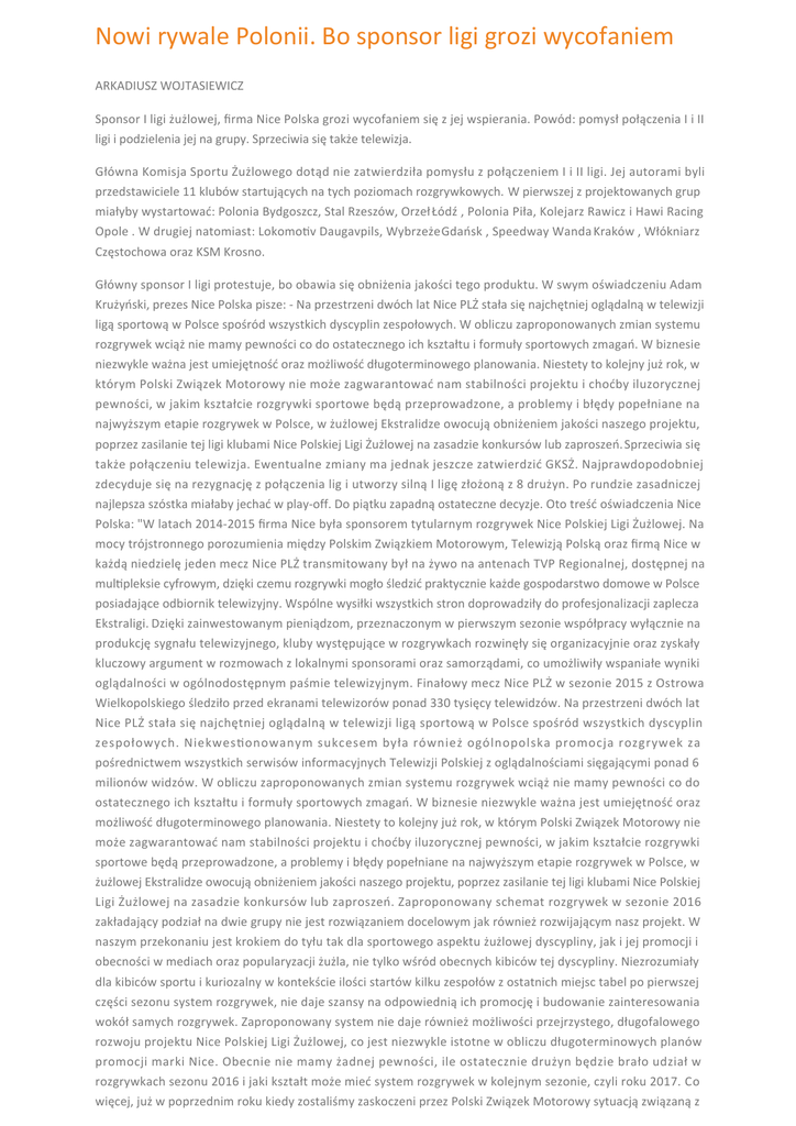 Nowi rywale Polonii. Bo sponsor ligi grozi wycofaniem ARKADIUSZ WOJTASIEWICZ Sponsor I ligi żużlowej, firma Nice Polska grozi wycofaniem się z jej wspierania. Powód: pomysł połączenia I i II ligi i podzielenia jej na grupy. Sprzeciwia się także telewizja. Główna Komisja Sportu Żużlowego dotąd nie zatwierdziła pomysłu z połączeniem I i II ligi. Jej autorami byli przedstawiciele 11 klubów startujących na tych poziomach rozgrywkowych. W pierwszej z projektowanych grup miałyby wystartować: Polonia Bydgoszcz, Stal Rzeszów, Orzeł Łódź , Polonia Piła, Kolejarz Rawicz i Hawi Racing Opole . W drugiej natomiast: Lokomo v Daugavpils, Wybrzeże Gdańsk , Speedway Wanda Kraków , Włókniarz Częstochowa oraz KSM Krosno. Główny sponsor I ligi protestuje, bo obawia się obniżenia jakości tego produktu. W swym oświadczeniu Adam Krużyński, prezes Nice Polska pisze: ‐ Na przestrzeni dwóch lat Nice PLŻ stała się najchętniej oglądalną w telewizji ligą sportową w Polsce spośród wszystkich dyscyplin zespołowych. W obliczu zaproponowanych zmian systemu rozgrywek wciąż nie mamy pewności co do ostatecznego ich kształtu i formuły sportowych zmagań. W biznesie niezwykle ważna jest umiejętność oraz możliwość długoterminowego planowania. Niestety to kolejny już rok, w którym Polski Związek Motorowy nie może zagwarantować nam stabilności projektu i choćby iluzorycznej pewności, w jakim kształcie rozgrywki sportowe będą przeprowadzone, a problemy i błędy popełniane na najwyższym etapie rozgrywek w Polsce, w żużlowej Ekstralidze owocują obniżeniem jakości naszego projektu, poprzez zasilanie tej ligi klubami Nice Polskiej Ligi Żużlowej na zasadzie konkursów lub zaproszeń. Sprzeciwia się także połączeniu telewizja. Ewentualne zmiany ma jednak jeszcze zatwierdzić GKSŻ. Najprawdopodobniej zdecyduje się na rezygnację z połączenia lig i utworzy silną I ligę złożoną z 8 drużyn. Po rundzie zasadniczej najlepsza szóstka miałaby jechać w play‐off. Do piątku zapadną ostateczne decyzje. Oto treść oświadczenia Nice Polska: "W latach 2014‐2015 firma Nice była sponsorem tytularnym rozgrywek Nice Polskiej Ligi Żużlowej. Na mocy trójstronnego porozumienia między Polskim Związkiem Motorowym, Telewizją Polską oraz firmą Nice w każdą niedzielę jeden mecz Nice PLŻ transmitowany był na żywo na antenach TVP Regionalnej, dostępnej na mul pleksie cyfrowym, dzięki czemu rozgrywki mogło śledzić praktycznie każde gospodarstwo domowe w Polsce posiadające odbiornik telewizyjny. Wspólne wysiłki wszystkich stron doprowadziły do profesjonalizacji zaplecza Ekstraligi. Dzięki zainwestowanym pieniądzom, przeznaczonym w pierwszym sezonie współpracy wyłącznie na produkcję sygnału telewizyjnego, kluby występujące w rozgrywkach rozwinęły się organizacyjnie oraz zyskały kluczowy argument w rozmowach z lokalnymi sponsorami oraz samorządami, co umożliwiły wspaniałe wyniki oglądalności w ogólnodostępnym paśmie telewizyjnym. Finałowy mecz Nice PLŻ w sezonie 2015 z Ostrowa Wielkopolskiego śledziło przed ekranami telewizorów ponad 330 tysięcy telewidzów. Na przestrzeni dwóch lat Nice PLŻ stała się najchętniej oglądalną w telewizji ligą sportową w Polsce spośród wszystkich dyscyplin zespołowych. Niekwes onowanym sukcesem była również ogólnopolska promocja rozgrywek za pośrednictwem wszystkich serwisów informacyjnych Telewizji Polskiej z oglądalnościami sięgającymi ponad 6 milionów widzów. W obliczu zaproponowanych zmian systemu rozgrywek wciąż nie mamy pewności co do ostatecznego ich kształtu i formuły sportowych zmagań. W biznesie niezwykle ważna jest umiejętność oraz możliwość długoterminowego planowania. Niestety to kolejny już rok, w którym Polski Związek Motorowy nie może zagwarantować nam stabilności projektu i choćby iluzorycznej pewności, w jakim kształcie rozgrywki sportowe będą przeprowadzone, a problemy i błędy popełniane na najwyższym etapie rozgrywek w Polsce, w żużlowej Ekstralidze owocują obniżeniem jakości naszego projektu, poprzez zasilanie tej ligi klubami Nice Polskiej Ligi Żużlowej na zasadzie konkursów lub zaproszeń. Zaproponowany schemat rozgrywek w sezonie 2016 zakładający podział na dwie grupy nie jest rozwiązaniem docelowym jak również rozwijającym nasz projekt. W naszym przekonaniu jest krokiem do tyłu tak dla sportowego aspektu żużlowej dyscypliny, jak i jej promocji i obecności w mediach oraz popularyzacji żużla, nie tylko wśród obecnych kibiców tej dyscypliny. Niezrozumiały dla kibiców sportu i kuriozalny w kontekście ilości startów kilku zespołów z ostatnich miejsc tabel po pierwszej części sezonu system rozgrywek, nie daje szansy na odpowiednią ich promocję i budowanie zainteresowania wokół samych rozgrywek. Zaproponowany system nie daje również możliwości przejrzystego, długofalowego rozwoju projektu Nice Polskiej Ligi Żużlowej, co jest niezwykle istotne w obliczu długoterminowych planów promocji marki Nice. Obecnie nie mamy żadnej pewności, ile ostatecznie drużyn będzie brało udział w rozgrywkach sezonu 2016 i jaki kształt może mieć system rozgrywek w kolejnym sezonie, czyli roku 2017. Co więcej, już w poprzednim roku kiedy zostaliśmy zaskoczeni przez Polski Związek Motorowy sytuacją związaną z udziałem w rozgrywkach tylko 7 drużyn wyraźnie podkreślaliśmy, że w tym roku nie możemy pozwolić sobie na powtórkę sytuacji z sezonu 2016, kiedy ostateczny kształt ligi został ustalony w marcu. Brak stabilności oraz związany z tym brak możliwości zaplanowania strategii promocyjnej dla naszej marki w dłuższym horyzoncie czasu powoduje spore wątpliwości dotyczące naszego dalszego zaangażowania w sponsoring pierwszej ligi żużlowej. Zasugerowany system rozgrywek z podziałem na grupy, w naszej opinii, zdecydowanie utrudni komunikację z kibic