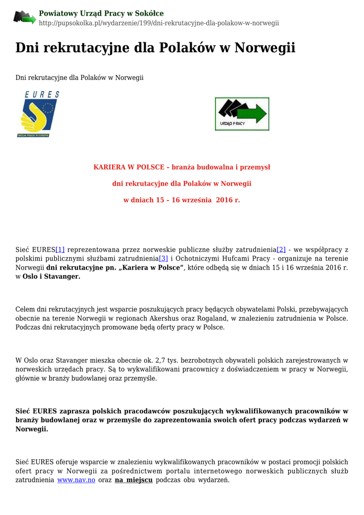 Powiatowy Urząd Pracy w Sokółce http://pupsokolka.pl/wydarzenie/199/dni-rekrutacyjne-dla-polakow-w-norwegii Dni rekrutacyjne dla Polaków w Norwegii Dni rekrutacyjne dla Polaków w Norwegii KARIERA W POLSCE – branża budowalna i przemysł dni rekrutacyjne dla Polaków w Norwegii w dniach 15 – 16 września 2016 r. Sieć EURES[1] reprezentowana przez norweskie publiczne służby zatrudnienia[2] - we współpracy z polskimi publicznymi służbami zatrudnienia[3] i Ochotniczymi Hufcami Pracy - organizuje na terenie Norwegii dni rekrutacyjne pn. „Kariera w Polsce”, które odbędą się w dniach 15 i 16 września 2016 r. w Oslo i Stavanger. Celem dni rekrutacyjnych jest wsparcie poszukujących pracy będących obywatelami Polski, przebywających obecnie na terenie Norwegii w regionach Akershus oraz Rogaland, w znalezieniu zatrudnienia w Polsce. Podczas dni rekrutacyjnych promowane będą oferty pracy w Polsce. W Oslo oraz Stavanger mieszka obecnie ok. 2,7 tys. bezrobotnych obywateli polskich zarejestrowanych w norweskich urzędach pracy. Są to wykwalifikowani pracownicy z doświadczeniem w pracy w Norwegii, głównie w branży budowlanej oraz przemyśle. Sieć EURES zaprasza polskich pracodawców poszukujących wykwalifikowanych pracowników w branży budowlanej oraz w przemyśle do zaprezentowania swoich ofert pracy podczas wydarzeń w Norwegii. Sieć EURES oferuje wsparcie w znalezieniu wykwalifikowanych pracowników w postaci promocji polskich ofert pracy w Norwegii za pośrednictwem portalu internetowego norweskich publicznych służb zatrudnienia www.nav.no oraz na miejscu podczas obu wydarzeń. Wsparcie sieci EURES jest bezpłatne. Doradca EURES wesprze pracodawcę w rejestracji oferty w powiatowym urzędzie pracy lub centrum edukacji i pracy młodzieży OHP. Oferty pracy powinny zostać przekazane do właściwego powiatowego urzędu pracy lub centrum edukacji i pracy młodzieży OHP najpóźniej do dnia 12 sierpnia br. Oferta pracy zostanie opublikowana w centralnej bazie ofert pracy www.oferty.praca.gov.pl. Prosimy pracodawców, aby w ofertach pracy znalazły się dodatkowo informacje nt. rodzaju prowadzonej działalności firmy oraz czy pracodawca oferuje - obok wynagrodzenia - dodatkowe elementy uposażenia, wparcie przy przeniesieniu się do kraju lub integracji w miejscu pracy. Informacja te są niezbędne do zaprezentowania potencjalnym kandydatom. Pracodawcy poszukujący wykwalifikowanej kadry do zatrudnienia w branży budowlanej oraz w przemyśle zainteresowani zatrudnieniem Polaków aktualnie przebywających w Norwegii prosimy o kontakt do dnia 1 sierpnia 2016 r. z doradcą klienta w Powiatowym Urzędzie Pracy w Sokółce (tel. 85 722 90 30) lub doradcą EURES w Wojewódzkim Urzędzie Pracy w Białymstoku (tel. 85 74 97 235). Sporz. Marta Kuźma [1] Sieć EURES (Europejskie Służby Zatrudnienia) to sieć współpracy Komisji Europejskiej, administracji publicznych na szczeblu centralnym, publicznych służb zatrudnienia oraz innych wyznaczonych podmiotów krajowych, regionalnych i lokalnych z państw członkowskich UE/EOG. [2] Norweskie publiczne służby zatrudnienia reprezentuje organizacja pod nazwą NAV (Arbeids- og Velferdsforvaltningen). [3] Polskie publiczne służby zatrudnienia reprezentuje Ministerstwo Rodziny, Pracy i Polityki Społecznej wojewódzkie i powiatowe urzędy pracy