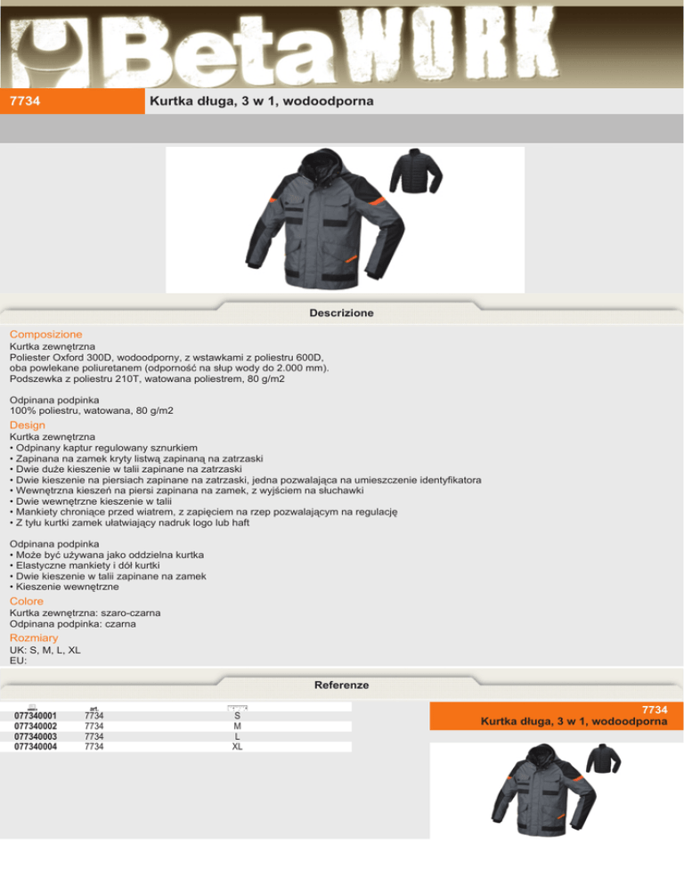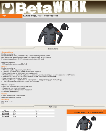 7734 Kurtka długa, 3 w 1, wodoodporna Descrizione Composizione Kurtka zewnętrzna Poliester Oxford 300D, wodoodporny, z wstawkami z poliestru 600D, oba powlekane poliuretanem (odporność na słup wody do 2.000 mm). Podszewka z poliestru 210T, watowana poliestrem, 80 g/m2 Odpinana podpinka 100% poliestru, watowana, 80 g/m2 Design Kurtka zewnętrzna • Odpinany kaptur regulowany sznurkiem • Zapinana na zamek kryty listwą zapinaną na zatrzaski • Dwie duże kieszenie w talii zapinane na zatrzaski • Dwie kieszenie na piersiach zapinane na zatrzaski, jedna pozwalająca na umieszczenie identyfikatora • Wewnętrzna kieszeń na piersi zapinana na zamek, z wyjściem na słuchawki • Dwie wewnętrzne kieszenie w talii • Mankiety chroniące przed wiatrem, z zapięciem na rzep pozwalającym na regulację • Z tyłu kurtki zamek ułatwiający nadruk logo lub haft Odpinana podpinka • Może być używana jako oddzielna kurtka • Elastyczne mankiety i dół kurtki • Dwie kieszenie w talii zapinane na zamek • Kieszenie wewnętrzne Colore Kurtka zewnętrzna: szaro-czarna Odpinana podpinka: czarna Rozmiary UK: S, M, L, XL EU: Referenze 077340001 077340002 077340003 077340004 art. 7734 7734 7734 7734 S M L XL 7734 Kurtka długa, 3 w 1, wodoodporna