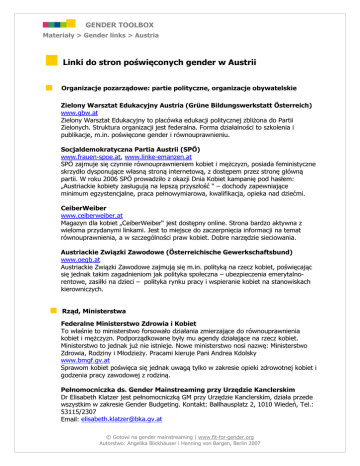 GENDER TOOLBOX Materiały > Gender links > Austria Linki do stron poświęconych gender w Austrii Organizacje pozarządowe: partie polityczne, organizacje obywatelskie Zielony Warsztat Edukacyjny Austria (Grüne Bildungswerkstatt Österreich) www.gbw.at Zielony Warsztat Edukacyjny to placówka edukacji politycznej zbliżona do Partii Zielonych. Struktura organizacji jest federalna. Forma działalności to szkolenia i publikacje, m.in. poświęcone gender i równouprawnieniu. Socjaldemokratyczna Partia Austrii (SPÖ) www.frauen-spoe.at, www.linke-emanzen.at SPÖ zajmuje się czynnie równouprawnieniem kobiet i mężczyzn, posiada feministyczne skrzydło dysponujące własną stroną internetową, z dostępem przez stronę główną partii. W roku 2006 SPÖ prowadziło z okazji Dnia Kobiet kampanię pod hasłem: „Austriackie kobiety zasługują na lepszą przyszłość “ – dochody zapewniające minimum egzystencjalne, praca pełnowymiarowa, kwalifikacja, opieka nad dziećmi. CeiberWeiber www.ceiberweiber.at Magazyn dla kobiet „CeiberWeiber“ jest dostępny online. Strona bardzo aktywna z wieloma przydanymi linkami. Jest to miejsce do zaczerpnięcia informacji na temat równouprawnienia, a w szczególności praw kobiet. Dobre narzędzie sieciowania. Austriackie Związki Zawodowe (Österreichische Gewerkschaftsbund) www.oegb.at Austriackie Związki Zawodowe zajmują się m.in. polityką na rzecz kobiet, poświęcając się jednak takim zagadnieniom jak polityka społeczna – ubezpieczenia emerytalnorentowe, zasiłki na dzieci – polityka rynku pracy i wspieranie kobiet na stanowiskach kierowniczych. Rząd, Ministerstwa Federalne Ministerstwo Zdrowia i Kobiet To właśnie to ministerstwo forsowało działania zmierzające do równouprawnienia kobiet i mężczyzn. Podporządkowane były mu agendy działające na rzecz kobiet. Ministerstwo to jednak już nie istnieje. Nowe ministerstwo nosi nazwę: Ministerstwo Zdrowia, Rodziny i Młodzieży. Pracami kieruje Pani Andrea Kdolsky www.bmgf.gv.at Sprawom kobiet poświęca się jednak uwagą tylko w zakresie opieki zdrowotnej kobiet i godzenia pracy zawodowej z rodziną. Pełnomocniczka ds. Gender Mainstreaming przy Urzędzie Kanclerskim Dr Elisabeth Klatzer jest pełnomocniczką GM przy Urzędzie Kanclerskim, działa przede wszystkim w zakresie Gender Budgeting. Kontakt: Ballhausplatz 2, 1010 Wiedeń, Tel.: 53115/2307 Email: [email protected] © Gotowi na gender mainstreaming | www.fit-for-gender.org Autorstwo: Angelika Blickhäuser i Henning von Bargen, Berlin 2007 GENDER TOOLBOX 2 Materiały > gender links > Austria www.bmwa.gv.at – ustawy i dyrektywy dotyczące rynku pracy www.frauenratgeberin.at – strona przeznaczona do prowadzenia kampanii www.imag-gendermainstreaming.at – międzyresortowa grupa robocza GM www.gendermaisntreaming.at – jedna z pierwszych niemieckojęzycznych stron poświęcona GM www.eu2006.at – na temat Prezydencji w UE Departament polityki na rzecz mężczyzn w Ministerstwie Spraw Społecznych www.bmsg.gv.at/cms/site/liste.html?channel=CH0132 Pod powyższym adresem znajduje się opis działalności departamentu oraz wykaz placówek poradnictwa dla mężczyzn w Austrii. Jest to miejsce koordynacji wzgl. dokumentacji badań naukowych. Departament publikuje artykuły oraz wspiera mężczyzn w trudnym położeniu społecznym. Zobacz też: www.maennerratgeber.at Nauka Wszystkie większe uniwersytety prowadzą zajęcia poświęcone gender. Centra naukowe aktywnie wspierają politykę od strony teoretycznej. Zestawienie instytutów znajduje się na stronie: www.unisalzburg.at/portal/page?_pageid=184,95646&_dad=portal&_schema=PORTAL Inni aktorzy gender Centrum dla Demokracji w Wiedniu (Demokratiezentrum Wien) www.demokratiezentrum.org/de/index.html?idcatside=9 W dużej mierze zajmuje się perspektywą gender. © Gotowi na gender mainstreaming | www.fit-for-gender.org Autorstwo: Angelika Blickhäuser i Henning von Bargen, Berlin 2007