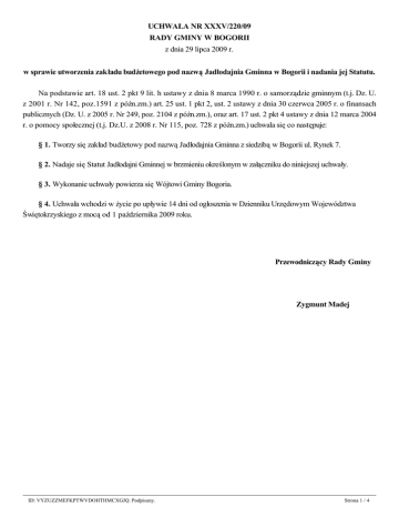 UCHWAŁA NR XXXV/220/09 RADY GMINY W BOGORII z dnia 29 lipca 2009 r. w sprawie utworzenia zakładu budżetowego pod nazwą Jadłodajnia Gminna w Bogorii i nadania jej Statutu. Na podstawie art. 18 ust. 2 pkt 9 lit. h ustawy z dnia 8 marca 1990 r. o samorządzie gminnym (t.j. Dz. U. z 2001 r. Nr 142, poz.1591 z późn.zm.) art. 25 ust. 1 pkt 2, ust. 2 ustawy z dnia 30 czerwca 2005 r. o finansach publicznych (Dz. U. z 2005 r. Nr 249, poz. 2104 z późn.zm.), oraz art. 17 ust. 2 pkt 4 ustawy z dnia 12 marca 2004 r. o pomocy społecznej (t.j. Dz.U. z 2008 r. Nr 115, poz. 728 z późn.zm.) uchwala się co następuje: § 1. Tworzy się zakład budżetowy pod nazwą Jadłodajnia Gminna z siedzibą w Bogorii ul. Rynek 7. § 2. Nadaje się Statut Jadłodajni Gminnej w brzmieniu określonym w załączniku do niniejszej uchwały. § 3. Wykonanie uchwały powierza się Wójtowi Gminy Bogoria. § 4. Uchwała wchodzi w życie po upływie 14 dni od ogłoszenia w Dzienniku Urzędowym Województwa Świętokrzyskiego z mocą od 1 października 2009 roku. Przewodniczący Rady Gminy Zygmunt Madej Załącznik do Uchwały Nr XXXV/220/09 Rady Gminy w Bogorii z dnia 29 lipca 2009 r. STATUT JADŁODAJNI GMINNEJ W BOGORII R o z d z i ał I Postanowienia ogólne § 1. 1. Jadłodajnia Gminna w Bogorii zwana dalej „Jadłodajnią” jest zakładem budżetowym . 2. Jadłodajnia działa w granicach administracyjnych Gminy Bogoria. 3. Jadłodajnia podlega bezpośrednio Wójtowi Gminy Bogoria. 4. Siedziba Jadłodajni mieści się w Bogorii przy ul. Rynek 7. § 2. Jadłodajnia działa na podstawie obowiązującego prawa, a w szczególności w oparciu o przepisy 1) ustawy z dnia 08 marca 1990r. o samorządzie gminnym (tekst jedn.: Dz. U. z 2001 r. Nr 142, poz. 1591 ID: VYZUZZMEFKPTWVDOHTHMCXGJQ. Podpisany. Strona 1 / 4 z późn. zm.), Zygmunt Madej Załącznik do Uchwały Nr XXXV/220/09 Rady Gminy w Bogorii z dnia 29 lipca 2009 r. STATUT JADŁODAJNI GMINNEJ W BOGORII R o z d z i ał I Postanowienia ogólne § 1. 1. Jadłodajnia Gminna w Bogorii zwana dalej „Jadłodajnią” jest zakładem budżetowym . 2. Jadłodajnia działa w granicach administracyjnych Gminy Bogoria. 3. Jadłodajnia podlega bezpośrednio Wójtowi Gminy Bogoria. 4. Siedziba Jadłodajni mieści się w Bogorii przy ul. Rynek 7. § 2. Jadłodajnia działa na podstawie obowiązującego prawa, a w szczególności w oparciu o przepisy 1) ustawy z dnia 08 marca 1990r. o samorządzie gminnym (tekst jedn.: Dz. U. z 2001 r. Nr 142, poz. 1591 z późn. zm.), 2) ustawy z dnia 12 marca 2004r. o pomocy społecznej (Dz. U. Nr 64, poz. 593 z późn. zm.), 3) ustawy z dnia 26 listopada 1998r. o finansach publicznych (tekst jedn.: Dz. U. z 2003 r. Nr 15, poz. 148 z późn.zm.), 4) niniejszego Statutu, 5) innych aktów prawnych. R o z d z i ał I I Cele i zadania § 3. Celem działalności Jadłodajni jest zapewnienie wsparcia społecznego osobom i rodzinom w zakresie umożliwienia całodziennego wyżywienia w placówce gastronomicznej o charakterze otwartym. § 4. Zadania Jadłodajni obejmują w szczególności: 1) wydawanie posiłków dla osób zakwalifikowanych do tej formy pomocy przez Ośrodek Pomocy Społecznej, 2) wydawanie posiłków dla podopiecznych Ośrodka Pomocy Społecznej objętych usługami opiekuńczymi, 3) organizacja i obsługa akcji i spotkań okolicznościowych skierowanych do podopiecznych Ośrodka Pomocy Społecznej i organizacji pozarządowych działających w systemie pomocy społecznej, 4) wydawanie posiłków dla osób biorących udział w akcjach ratowniczych o znamionach kryzysu oraz osób poszkodowanych przez klęski żywiołowe i ekologiczne lub zdarzenia losowe. 5) sprzedaż wyrobów kulinarnych i w systemie abonamentowym, § 5. W celu realizacji zadań statutowych Jadłodajnia współpracuje na zasadzie partnerstwa z organizacjami Strona 2 / 4 społecznymi i pozarządowymi, Kościołem Katolickim, innymi Kościołami, związkami wyznaniowymi oraz osobami fizycznymi i prawnymi. ID: VYZUZZMEFKPTWVDOHTHMCXGJQ. Podpisany. 5) sprzedaż wyrobów kulinarnych i w systemie abonamentowym, § 5. W celu realizacji zadań statutowych Jadłodajnia współpracuje na zasadzie partnerstwa z organizacjami społecznymi i pozarządowymi, Kościołem Katolickim, innymi Kościołami, związkami wyznaniowymi oraz osobami fizycznymi i prawnymi. R o z d z i ał I I I Organizacja i zarządzanie § 6. 1. Jadłodajnią kieruje i reprezentuje ją na zewnątrz Kierownik. 2. Stosunek pracy z kierownikiem nawiązuje i rozwiązuje Wójt Gminy. 3. Kierownik wykonuje czynności pracodawcy w stosunku do osób zatrudnionych w Jadłodajni. 4. Kierownik działa wobec wszystkich władz, organów, instytucji i przedsiębiorstw w ramach zwykłego zarządu i jest upoważniony do składania oświadczeń woli oraz dokonywania czynności prawnych związanych z funkcjonowaniem Jadłodajni, na podstawie pełnomocnictwa udzielonego przez Wójta Gminy. 5. W celu realizacji zadań statutowych Jadłodajni, Kierownik uprawniony jest do wydawania zarządzeń, regulaminów i instrukcji. § 7. 1. Funkcjonowanie Jadłodajni opiera się na zasadzie jednoosobowego kierownictwa, służbowego podporządkowania, podziału czynności i indywidualnej odpowiedzialności za wykonywanie powierzonych zadań. 2. Tryb pracy Jadłodajni oraz organizacje wewnętrzną i szczegółowy zakres działania. § 8. 1. Kierownik Jadłodajni współpracuje z Kierownikiem Ośrodka Pomocy Społecznej w Bogorii. 2. Nadzór nad działalnością Jadłodajni sprawuje Wójt Gminy. R o z d z i ał I V Mienie i gospodarka finansowa § 9. Jadłodajnia pokrywa swoje wydatki bezpośrednio z uzyskanych przychodów. § 10. Mienie Jadłodajni stanowią środki trwałe i pozostałe środki trwałe w użytkowaniu, których stan i wartość określają księgi inwentaryzacyjne oraz roczne sprawozdanie bilansowe. § 11. Gospodarka finansowa Jadłodajni prowadzona jest według zasad określonych w przepisach ustawy o finansach publicznyc