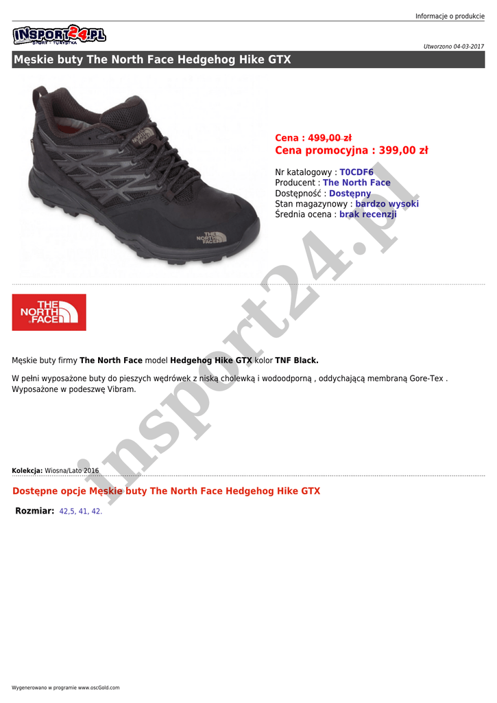Informacje o produkcie Utworzono 04-03-2017 Męskie buty The North Face Hedgehog Hike GTX Cena : 499,00 zł Cena promocyjna : 399,00 zł sp or t2 4. p l Nr katalogowy : T0CDF6 Producent : The North Face Dostępność : Dostępny Stan magazynowy : bardzo wysoki Średnia ocena : brak recenzji Męskie buty firmy The North Face model Hedgehog Hike GTX kolor TNF Black. in W pełni wyposażone buty do pieszych wędrówek z niską cholewką i wodoodporną , oddychającą membraną Gore-Tex . Wyposażone w podeszwę Vibram. Kolekcja: Wiosna/Lato 2016 Dostępne opcje Męskie buty The North Face Hedgehog Hike GTX Rozmiar: 42,5, 41, 42. Wygenerowano w programie www.oscGold.com