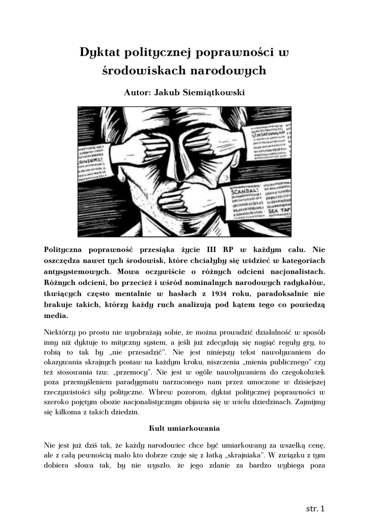 Dyktat politycznej poprawności w środowiskach narodowych Autor: Jakub Siemiątkowski Polityczna poprawność przesiąka życie III RP w każdym calu. Nie oszczędza nawet tych środowisk, które chciałyby się widzieć w kategoriach antysystemowych. Mowa oczywiście o różnych odcieni nacjonalistach. Różnych odcieni, bo przecież i wśród nominalnych narodowych radykałów, tkwiących często mentalnie w hasłach z 1934 roku, paradoksalnie nie brakuje takich, którzy każdy ruch analizują pod kątem tego co powiedzą media. Niektórzy po prostu nie wyobrażają sobie, że można prowadzić działalność w sposób inny niż dyktuje to mityczny system, a jeśli już zdecydują się nagiąć reguły gry, to robią to tak by „nie przesadzić”. Nie jest niniejszy tekst nawoływaniem do okazywania skrajnych postaw na każdym kroku, niszczenia „mienia publicznego” czy też stosowania tzw. „przemocy”. Nie jest w ogóle nawoływaniem do czegokolwiek poza przemyśleniem paradygmatu narzuconego nam przez umoczone w dzisiejszej rzeczywistości siły polityczne. Wbrew pozorom, dyktat politycznej poprawności w szeroko pojętym obozie nacjonalistycznym objawia się w wielu dziedzinach. Zajmijmy się kilkoma z takich dziedzin. Kult umiarkowania Nie jest już dziś tak, że każdy narodowiec chce być umiarkowany za wszelką cenę, ale z całą pewnością mało kto dobrze czuje się z łatką „skrajniaka”. W związku z tym dobiera słowa tak, by nie wyszło, że jego zdanie za bardzo wybiega poza str. 1 ogólnośrodowiskowy mainstream. A przecież często jest tak, że narodowcy nie mają nic mądrego do powiedzenia na jakiś temat poza utartymi frazesami, powtarzanymi po swoich sytuujących się nieraz na pozycjach centroprawicowych (również nie zawsze mądrych) autorytetach, stąd krytyka nadmiernie ugładzonych opinii nie jest czymś, co powinno się spotykać z potępieniem z samego faktu jej stosowania. Unikanie radykalizmu, próby wpasowywania się w istniejący system były na przestrzeni ostatniego 25-lecia standardem w łonie znacznej części środowisk narodowych. Również dziś, gdy chce się kogoś zdyskredytować, zarzuca mu się „skrajność”, ewentualnie odbieganie od endeckich kanonów ideowych, bo przecież endecja „była umiarkowana”, „wolna od oszołomstwa”, no i oczywiście odwoływała się do mitycznego realizmu politycznego. O tym, że endeccy studenci, bardzo inteligentni na ogół przecież ludzie, a nawet bojówkarze rzeczywiście stonowanego ZLN ze Straży Narodowej lubili robić burdy na uniwersytetach i wiecach, na chwilę się jakby zapomina. Liczy się, by mówić coś „umiarkowanego”, takiego co przełknie typowy polski prawicowiec, nie wykrzywiając twarzy odruchem obrzydzenia na myśl, że ktoś może w XXI wieku promować „prymitywny”, „plemienny” nacjonalizm. Widać to także w sferze symboliki. Wciąż niektórym nacjonalistom przeszkadzają „ekstremistyczne i rasistowskie” symbole miecza i młota, krzyża celtyckiego, a nawet falangi... Można przecież odrzucać przeróżne wariactwa, a jednocześnie nie popadać w oszołomstwo umiarkowania dla samego bycia nieskrajnym. Nacjonalizm stawia na bunt, a nie na pozowanie na grzeczną prawicę. Narodowiec czy nacjonalista? Wielu dłużej działających kolegów pamięta zapewne, że w czasach nieboszczki Ligi Polskich Rodzin modne było bzdurne rozróżnianie pomiędzy ideą narodową a nacjonalizmem. „Jesteśmy narodowcami, nie nacjonalistami” - któż nie słyszał wtedy takich słów? Uzasadniano to wyartykułowaną w „Myślach nowoczesnego Polaka” niechęcią Dmowskiego do wszelkiego rodzaju -izmów, i to pomimo, że kilkanaście stron dalej ten sam autor bez większych problemów używa słowa „nacjonalizm” w odniesieniu do własnych poglądów… Nacjonalista kojarzy się źle, pewnie od razu z nazistą, a narodowiec to takie polskie słowo, brzmi łagodniej i tak dalej. Sporo czasu wielu „narodowców” spędziło, by takie farmazony młodym ludziom kłaść do głów, na szczęście te czasy już dawno przeminęły. Dziś mało kto ma problem z własną nacjonalistyczną autoidentyfikacją, słowo to przyciąga młodych ludzi spragnionych czegoś innego niż wieczne międlenie o samym tylko patriotyzmie, do którego odwołać się może nawet członek PO, czy SLD. Słowo nacjonalizm brzmi zdecydowanie i dziś jest to raczej jego zaletą niż minusem. Oczywiście nadal są tacy, którzy wolą je zastąpić narodową demokracją, ideą narodową, a nawet konserwatyzmem (sic!). Tak się jednak składa, że na ogół programowo, jak i mentalnie nie mają oni nic interesującego do zaproponowania. str. 2 Takie dziś czasy, że „narodowcem” może być właściwie każdy, niemal niezależnie od wyznawanych poglądów. Być może przyjdzie czas, że wręcz mniejsze obciążenie będzie ze sobą niosło deklarowanie się mianem nacjonalisty niż stawianie się w jednym szeregu z różnymi „narodowcami”, którzy najchętniej partycypowaliby w nieco tylko ulepszonej (uczciwszej i bardziej patriotycznej?) III RP. Stosunek do środowisk żydowskich Trzeba przyznać, że również na tym polu nastąpiło w ostatnich latach przełamanie tabu. Jeszcze względnie niedawno w dobrym tonie przy składaniu deklaracji o byciu narodowcem było rytualne niemal dodanie, że nie ma się nic do Żydów, że ma się żydowskich znajomych itd. Dziś nie jest specjalnym problemem otwarcie krytyczny stosunek do roszczeń żydowskich czy środowisk, takich jak ŻIH. Nawet na tle stosunku do państwa Izrael i konfliktu żydowsko-arabskiego widać pewien postęp. Tak, jak kiedyś mnóstwo było nacjonalistów, którzy wystawiali sobie niezbyt chwalebne świadectwo słowami „a niech się wytłuką” albo deklamacjami o Izraelu – bastionie cywilizacji Zachodu w morzu islamu, tak dziś krytyczny stosunek do zbrodniczych poczynań Izraelczyków oraz poparcie dla pale
