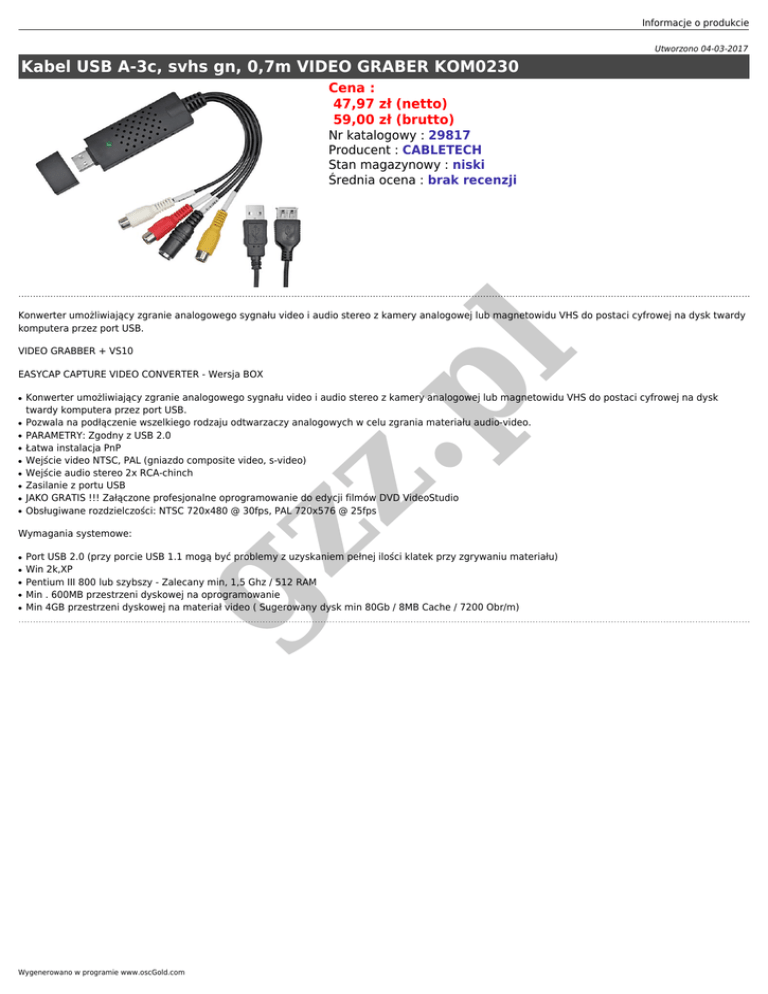 Informacje o produkcie Utworzono 04-03-2017 Kabel USB A-3c, svhs gn, 0,7m VIDEO GRABER KOM0230 Cena : 47,97 zł (netto) 59,00 zł (brutto) Nr katalogowy : 29817 Producent : CABLETECH Stan magazynowy : niski Średnia ocena : brak recenzji VIDEO GRABBER + VS10 EASYCAP CAPTURE VIDEO CONVERTER - Wersja BOX ● ● ● ● ● ● ● ● Konwerter umożliwiający zgranie analogowego sygnału video i audio stereo z kamery analogowej lub magnetowidu VHS do postaci cyfrowej na dysk twardy komputera przez port USB. Pozwala na podłączenie wszelkiego rodzaju odtwarzaczy analogowych w celu zgrania materiału audio-video. PARAMETRY: Zgodny z USB 2.0 Łatwa instalacja PnP Wejście video NTSC, PAL (gniazdo composite video, s-video) Wejście audio stereo 2x RCA-chinch Zasilanie z portu USB JAKO GRATIS !!! Załączone profesjonalne oprogramowanie do edycji filmów DVD VideoStudio Obsługiwane rozdzielczości: NTSC 720x480 @ 30fps, PAL 720x576 @ 25fps gz z ● .p l Konwerter umożliwiający zgranie analogowego sygnału video i audio stereo z kamery analogowej lub magnetowidu VHS do postaci cyfrowej na dysk twardy komputera przez port USB. Wymagania systemowe: ● ● ● ● ● Port USB 2.0 (przy porcie USB 1.1 mogą być problemy z uzyskaniem pełnej ilości klatek przy zgrywaniu materiału) Win 2k,XP Pentium III 800 lub szybszy - Zalecany min, 1,5 Ghz / 512 RAM Min . 600MB przestrzeni dyskowej na oprogramowanie Min 4GB przestrzeni dyskowej na materiał video ( Sugerowany dysk min 80Gb / 8MB Cache / 7200 Obr/m) Wygenerowano w programie www.oscGold.com