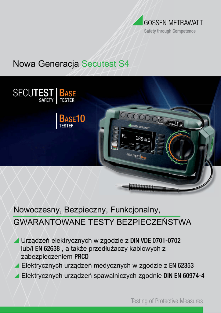 Nowa Generacja Secutest S4 SECUTEST BASE SAFETY TESTER BASE10 TESTER Nowoczesny, Bezpieczny, Funkcjonalny, GWARANTOWANE TESTY BEZPIECZEŃSTWA \ Urządzeń elektrycznych w zgodzie z DIN VDE 0701-0702 lub/i EN 62638 , a także przedłużaczy kablowych z zabezpieczeniem PRCD \ Elektrycznych urządzeń medycznych w zgodzie z EN 62353 \ Elektrycznych urządzeń spawalniczych zgodnie DIN EN 60974-4 Testing of Protective Measures Przygotowny aby sprostać każdemu standardowi i normie Testy wielkości zapewniających bezpieczeństwo użytku użądzeń elektrycznych wymagane są w wielu dziedzinach. Wytyczne zawarte w normach, ustawach rządowych, warunkach towarzystw ubezpieczeniowych - muszą być respektowane i spełnione. Badania i testy są obligatoryjne po każdej naprawie a także po upływie czasookresu eksploatacji , konieczne jest aby były bezpieczne dla operatora.Testery nowej serii SECUTEST zapewniają spełnienie najwyższych wymagań bezpieczeństwa a w połączeniu z bardzo intuicyjną obsługą i efektywnym dokumentowaniem protokołów plasują się na bezkonkurencyjnym miejscu wsród urządeń tego typu. ➡ 8 sekwencji testowych dla szybkich badań nieskomplikowanych urządzeń ➡ gotowe uniwersalne sekwencje testowe ➡ możliwość wykonania dowolnej sekwencji testowej poprzez zakres testu pojedyńczego Cechy : \ Nowa koncepcja zapisu i archiwizacji danych, automatyczne sekwencje testowe a także wybiórcze testy ,możliwości zapisu nawet do 50000 rekordów \ Wygodna obsługa poprzez ergonomiczne przyciski oraz pokrętło obrotowe \ Unikalna kombinacja testów i uniwersalny zapis wyników do adresowanej komórki \ Automatyczne rozpoznanie podłączenia i klasy urządzenia testowanego \ Kompaktowa i bardzo solidna obudowa bazująca na zintegrowanej osłonie gumowej \ Generacja bardzo szczegółowych raportów w odniesieniu do konkretnego standardu \ Niezwykła funkcjonalność poprzez dwa interfejsy USB[klawiatura ,drukarka, skaner] oraz trzeci interfejs USB do wymiany danych z PC \ Intuicyjne nastawy opcji językowych, typu klawiatury, znaków specjalnych czy daty Oprogramowanie ETC ETC oferuje wiele funkcji związanych z przygotowaniem sekwencji testowych oraz jest istotnym wsparciem w celu przetwarzania danych pozyskanych z testerów serii Secutest/Seculife. Akcesoria: \ Drukarka termiczna ze specjalnym papierem zapewniającym dáugi czas czytelnoĞci \ Czytnik kodu / drukarka kodu \ Trójfazowy adapter (aktywny/pasywny) \ Adapter do testu przedáuĪaczy trójfazowych \ Inne czujniki , np: pomiar prądu, temperatury, itd. \ Adapter kalibracyjny \ Futeraáy i walizki SECUTEST dostĊpne modele SECUTEST BASE SAFETY TESTER Model No. M7050-V001 Wersja zdefiniowana: ➡ niemiecka wersja jĊzykowa ➡ przewód zasilający Schuko a takĪe gniazdo test. ➡ certyfikat kalibracji DAkkS w wersji D-GB-FR Wersja zdefiniowana: SECUTEST BASE10 SAFETY TESTER Model No. M7050-V002 ➡ niemiecka wersja jĊzykowa ➡ przewód zasilający Schuko a takĪe gniazdo test. ➡ 200mA i 10A prądy testowe poáączeĔ ochr. ➡ certyfikat kalibracjia DAkkS w wersji D-GB-FR * ProszĊ zapoznaü siĊ z moĪliwoĞciami konfiguracyjnymi na stronie: www.gossenmetrawatt.com/secutest GMC-I Messtechnik GmbH Südwestpark 15 90449 Nürnberg Germany Phone: +49 911 8602-111 Fax: +49 911 8602-777 Printed in Germany · Subject to change without notice · 1 / 9.13 · Order No. 3-337-327-03 www.gossenmetrawatt.com [email protected]