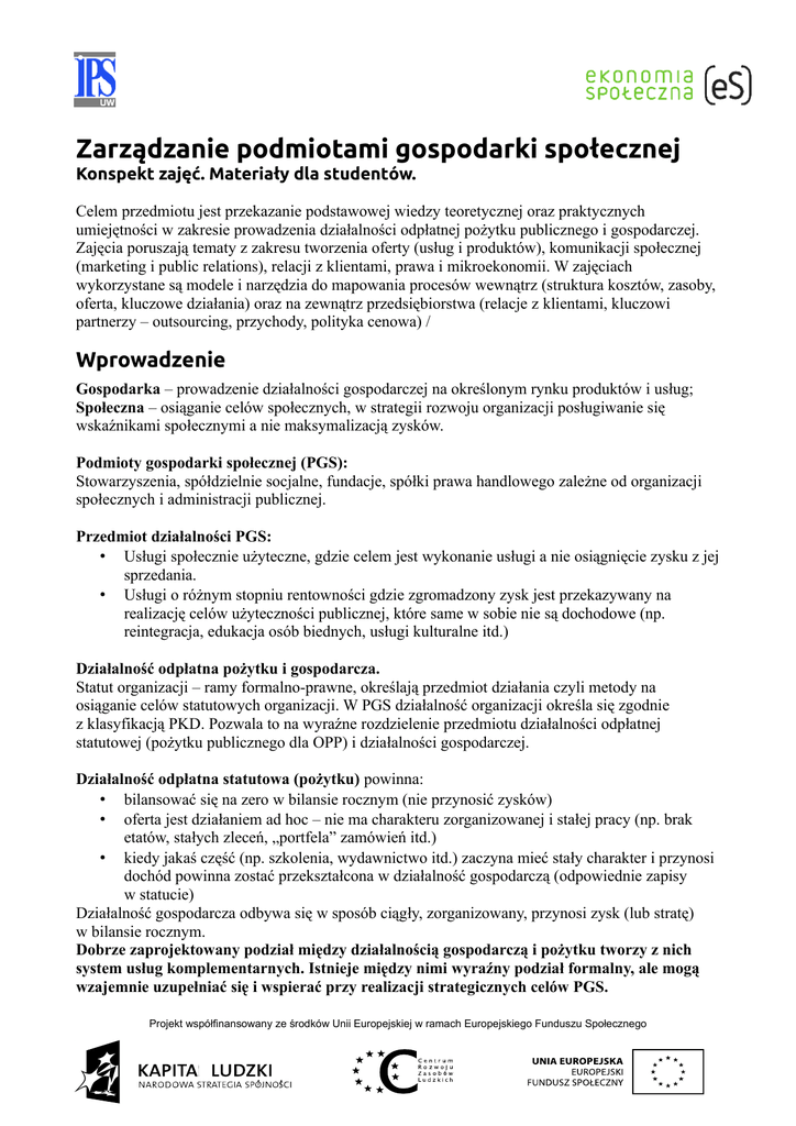 Zarządzanie podmiotami gospodarki społecznej Konspekt zajęć. Materiały dla studentów. Celem przedmiotu jest przekazanie podstawowej wiedzy teoretycznej oraz praktycznych umiejętności w zakresie prowadzenia działalności odpłatnej pożytku publicznego i gospodarczej. Zajęcia poruszają tematy z zakresu tworzenia oferty (usług i produktów), komunikacji społecznej (marketing i public relations), relacji z klientami, prawa i mikroekonomii. W zajęciach wykorzystane są modele i narzędzia do mapowania procesów wewnątrz (struktura kosztów, zasoby, oferta, kluczowe działania) oraz na zewnątrz przedsiębiorstwa (relacje z klientami, kluczowi partnerzy – outsourcing, przychody, polityka cenowa) / Wprowadzenie Gospodarka – prowadzenie działalności gospodarczej na określonym rynku produktów i usług; Społeczna – osiąganie celów społecznych, w strategii rozwoju organizacji posługiwanie się wskaźnikami społecznymi a nie maksymalizacją zysków. Podmioty gospodarki społecznej (PGS): Stowarzyszenia, spółdzielnie socjalne, fundacje, spółki prawa handlowego zależne od organizacji społecznych i administracji publicznej. Przedmiot działalności PGS: • Usługi społecznie użyteczne, gdzie celem jest wykonanie usługi a nie osiągnięcie zysku z jej sprzedania. • Usługi o różnym stopniu rentowności gdzie zgromadzony zysk jest przekazywany na realizację celów użyteczności publicznej, które same w sobie nie są dochodowe (np. reintegracja, edukacja osób biednych, usługi kulturalne itd.) Działalność odpłatna pożytku i gospodarcza. Statut organizacji – ramy formalno-prawne, określają przedmiot działania czyli metody na osiąganie celów statutowych organizacji. W PGS działalność organizacji określa się zgodnie z klasyfikacją PKD. Pozwala to na wyraźne rozdzielenie przedmiotu działalności odpłatnej statutowej (pożytku publicznego dla OPP) i działalności gospodarczej. Działalność odpłatna statutowa (pożytku) powinna: • bilansować się na zero w bilansie rocznym (nie przynosić zysków) • oferta jest działaniem ad hoc – nie ma charakteru zorganizowanej i stałej pracy (np. brak etatów, stałych zleceń, „portfela” zamówień itd.) • kiedy jakaś część (np. szkolenia, wydawnictwo itd.) zaczyna mieć stały charakter i przynosi dochód powinna zostać przekształcona w działalność gospodarczą (odpowiednie zapisy w statucie) Działalność gospodarcza odbywa się w sposób ciągły, zorganizowany, przynosi zysk (lub stratę) w bilansie rocznym. Dobrze zaprojektowany podział między działalnością gospodarczą i pożytku tworzy z nich system usług komplementarnych. Istnieje między nimi wyraźny podział formalny, ale mogą wzajemnie uzupełniać się i wspierać przy realizacji strategicznych celów PGS. Projekt współfinansowany ze środków Unii Europejskiej w ramach Europejskiego Funduszu Społecznego Przykład: Celem stowarzyszenia jest prowadzenie działalności edukacyjnej w zakresie ekologii, sprawiedliwego handlu, problemów globalnych. Strategiczną grupą docelową są młodzi ludzie, mobilni, ciekawi świata, wrażliwi społecznie. Stowarzyszenie prowadzi działalność edukacyjną (spotkania, dyskusje, pokazy filmowe itd.) w ramach wolontariatu i działalności statutowej odpłatnej i nieodpłatnej. W ramach działalności gospodarczej walne zebranie członków postanawia otworzyć hostel i klubokawiarnię. Działalność gospodarcza generuje zyski przeznaczane na organizowanie prelekcji, wydawnictwa, materiały edukacyjne i utrzymanie administracji. Prelekcje organizowane są w klubokawiarni i stanowią dodatkową ofertę (wartość premium) skierowaną do klientów hostelu i kawiarni (ta sama grupa docelowa obu działań). Możliwość dofinansowania prelekcji (np. z konkursów grantowych) wspiera promocję i rozpoznawalność marki organizacji dzięki czemu zmniejsza koszty marketingu usług hostelu. Podstawowy cel prowadzenia działalności gospodarczej przez PGS to zapewnienie stałego i niezależnego źródła finansowania usług pożytku publicznego (realizacji celów statutowych organizacji). Dlatego konieczne jest stosowanie zasad i narzędzi opracowanych na potrzeby biznesu, zorientowanie strategii organizacji na dobrze określone i rozpoznane grupy klientów, posługiwanie się zarówno wskaźnikami mikroekonomicznymi jak i wskaźnikami pokazującymi osiąganie celów społecznych. Organizowanie działalności gospodarczej Charakteru firmy nie określa jej nazwa, statut czy akty prawne. Określają go potrzeby klienta, które zostają zaspokojone, kiedy kupuje on jakiś produkt lub usługę. Zadowolenie klienta stanowi misję i cel każdej firmy. Odpowiedź na pytanie, czym jest nasza firma, można więc uzyskać, jedynie patrząc na nią z zewnątrz, z punktu widzenia klienta i rynku. Peter Drucker Kanwa BMG (Business Model Generation) http://www.businessmodelgeneration.com/ O co chodzi: http://www.youtube.com/watch?v=QoAOzMTLP5s&feature=related PDF do pobrania: http://www.businessmodelgeneration.com/canvas Projekt współfinansowany ze środków Unii Europejskiej w ramach Europejskiego Funduszu Społecznego Popyt (Customer Segment) klient -> zapotrzebowanie -> usługa/produkt • • • • Do kogo adresowana jest nasza oferta? Kim są nasi najważniejsi klienci? Jakie mają potrzeby? Rynki / grupy klientów ◦ Rynek masowy ◦ Rynki niszowe ◦ Segmenty rozłączne ◦ Łączenie segmentów Oferta (Value Proposition) Każdy z nas żyje, coś sprzedając Robert Louis Stevenson • • Oferta nie może być „nadwyżką podaży”. Jest zbyt duża szansa na to że ktoś inny lepiej dopasuje się do potrzeby klienta. Które potrzeby klienta zaspokaja nasz produkt? Projekt współfinansowany ze środków Unii Europejskiej w ramach Europejskiego Funduszu Społecznego • • • Co zrobić żeby był zadowolony? Zadowolenie jest jednym z najważniejszych „towarów” bez wzglę