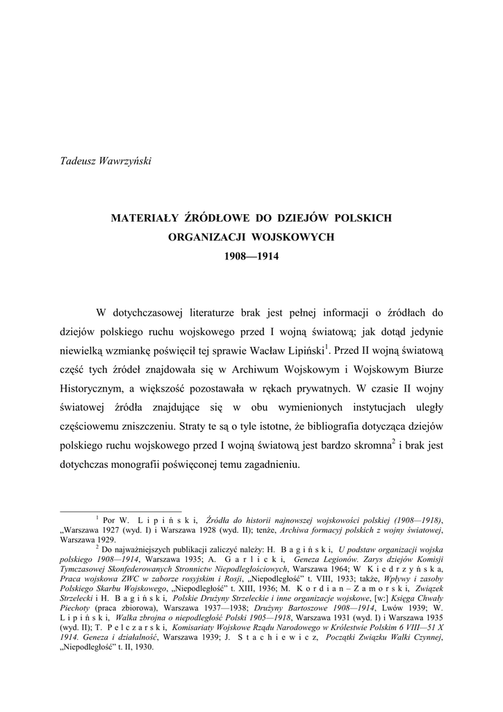 Tadeusz Wawrzyński MATERIAŁY ŹRÓDŁOWE DO DZIEJÓW POLSKICH ORGANIZACJI WOJSKOWYCH 1908—1914 W dotychczasowej literaturze brak jest pełnej informacji o źródłach do dziejów polskiego ruchu wojskowego przed I wojną światową; jak dotąd jedynie niewielką wzmiankę poświęcił tej sprawie Wacław Lipiński1. Przed II wojną światową część tych źródeł znajdowała się w Archiwum Wojskowym i Wojskowym Biurze Historycznym, a większość pozostawała w rękach prywatnych. W czasie II wojny światowej źródła znajdujące się w obu wymienionych instytucjach uległy częściowemu zniszczeniu. Straty te są o tyle istotne, że bibliografia dotycząca dziejów polskiego ruchu wojskowego przed I wojną światową jest bardzo skromna2 i brak jest dotychczas monografii poświęconej temu zagadnieniu. 1 Por W. L i p i ń s k i, Źródła do historii najnowszej wojskowości polskiej (1908—1918), „Warszawa 1927 (wyd. I) i Warszawa 1928 (wyd. II); tenże, Archiwa formacyj polskich z wojny światowej, Warszawa 1929. 2 Do najważniejszych publikacji zaliczyć należy: H. B a g i ń s k i, U podstaw organizacji wojska polskiego 1908—1914, Warszawa 1935; A. G a r l i c k i, Geneza Legionów. Zarys dziejów Komisji Tymczasowej Skonfederowanych Stronnictw Niepodległościowych, Warszawa 1964; W K i e d r z y ń s k a, Praca wojskowa ZWC w zaborze rosyjskim i Rosji, „Niepodległość” t. VIII, 1933; także, Wpływy i zasoby Polskiego Skarbu Wojskowego, „Niepodległość” t. XIII, 1936; M. K o r d i a n – Z a m o r s k i, Związek Strzelecki i H. B a g i ń s k i, Polskie Drużyny Strzeleckie i inne organizacje wojskowe, [w:] Księga Chwały Piechoty (praca zbiorowa), Warszawa 1937—1938; Drużyny Bartoszowe 1908—1914, Lwów 1939; W. L i p i ń s k i, Walka zbrojna o niepodległość Polski 1905—1918, Warszawa 1931 (wyd. I) i Warszawa 1935 (wyd. II); T. P e l c z a r s k i, Komisariaty Wojskowe Rządu Narodowego w Królestwie Polskim 6 VIII—51 X 1914. Geneza i działalność, Warszawa 1939; J. S t a c h i e w i c z, Początki Związku Walki Czynnej, „Niepodległość” t. II, 1930. Ocalałe akta znajdują się obecnie głównie w Centralnym Archiwum Wojskowym, które oprócz akt przechowywanych przed II wojną światową posiada również zbiory przedwojennego Wojskowego Biura Historycznego. Centralne Archiwum Wojskowe posiada 10 szczątkowych zespołów akt wytworzonych w latach 1908—1914 przez instytucje i organizacje związane z polskim ruchem wojskowym przed I wojną światową. Ogółem zespoły te liczą jedynie 39 jednostek archiwalnych. Najwięcej akt zawiera zespół archiwalny T o w a r z y s t w o „S t r z e l e c”3 w K r a k o w i e (14 j.a.). Na uwagę zasługuje księga dyżurów i raportów z lat 1912—1914 (sygnatura 110.6.1), raporty z 1914 roku (110.6.2), dziennik kursu niższego z lat 1912—1913 (110.6.8) wykaz wykładów i ćwiczeń II plutonu oficerskiego kursu niższego z lat 1913—1914 (110.6.9), ewidencja i dziennik Komendy Szkoły Żołnierskiej i Podoficerskiej w Krakowie z lat 1913—1914 (110.6.11, 12—14) Pozostała część akt to spisy książek biblioteki i dowody rachunkowe. Zespół akt K o m e n d a Z w i ą z k ó w S t r z e l e c k i c h O k r ę g u Krakowskiego liczy 5 j.a. z lat 1913—1914. Zachowała się m.in. księga ewidencyjna Związku Strzeleckiego i „Strzelca” (110.7.1) oraz raporty Związku Strzeleckiego w Pradze (110.7.2). Ponadto w zespole znajduje się dziennik korespondencji wpływającej, księga pocztowa i kwitariusze kasowe oraz spisy imienne osób, które wyjechały na wakacje z Krakowa w 1913 roku. Zespół akt Z w i ą z e k S t r z e l e c k i w e L w o w i e (3 j.a.) zawiera, m.in. raporty tygodniowe szkoły podoficerskiej z lat 1913—1914 (110.5.1). Z największego przed II wojną światową zespołu archiwalnego P o l s k i e D r u ż y n y S t r z e l e c k i e4 liczącego 136 j.a. zachowało się jedynie 6 j.a. Na uwagę zasługują tu wykazy członków PDS w Tymbarku, statuty i okólnik 3 „Strzelec”, legalne organizacje wojskowe utworzone przez Związek Walki Czynnej w 1910 r.: we Lwowie jako Związek Strzelecki, w Krakowie jako Towarzystwo „Strzelec”. Zadaniem ich było przygotowywanie kadr oficerskich i podoficerskich do walki zbrojnej z Rosją u boku Austro-Węgier. 4 Polskie Drużyny Strzeleckie (pełna nazwa: Towarzystwo Polskich Drużyn Strzeleckich), jawna organizacja wojskowa zatwierdzona przez władze austriackie 31 VII 1911 r. Działała przede wszystkim na terenie Galicji, w mniejszym zakresie, nielegalnie, w Królestwie i zaborze pruskim. Bezpośrednio kierowała nimi Armia Polska, organizacja powstała w październiku 1910 r. z przekształcenia działającego od przełomu lat 1908—1909 we Lwowie tajnego Polskiego Związku Wojskowego. PDS stawiały sobie te same cele co „Strzelec”, z którym współpracowały w sprawach wojskowych. (110.1.132—135), ewidencja IV plutonu 1 kompanii PDS z 1914 roku (110.1.136) oraz akta kursu instruktorskiego w Rabce w 1914 roku (110.1.43). Zespół akt II K o m e n d a O k r ę g o w a P o l s k i c h D r u ż y n S t r z e l e c k i c h w K r a k o w i e liczy 4 j.a. Na wymienienie zasługują głównie sprawozdania z działalności i organizacji drużyn z okresu marzec — maj 1914 rok (110.9.1) oraz okólniki Komendy Naczelnej PDS i zestawienia komend „Sokoła”5, drużyn strzeleckich i Drużyn Bartoszowych6 z 1914 roku (110.9.3). Pozostałe jednostki archiwalne zawierają akta rachunkowe. Z działalnością Polskich Drużyn Strzeleckich związany jest zespół akt K o m i s j a S k a r b u PDS L w ó w zawierający jedynie raport przewodniczącego komisji z czerwca 1913 roku (110.13.1). Zespół archiwalny D r u ż y n y B a r t o s z o w e we Lwowie liczy 3 j.a. i zawiera ewidencję szkoły podoficerskiej z lipca — sierpnia 1914 roku (110.11.1), raporty z okresu styczeń — sierpień 1914 rok (110.1.2), oraz pro