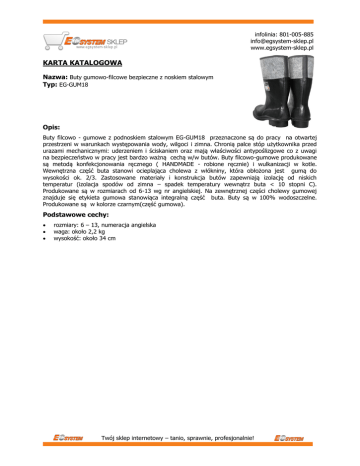infolinia: 801-005-885 [email protected] www.egsystem-sklep.pl KARTA KATALOGOWA Nazwa: Buty gumowo-filcowe bezpieczne z noskiem stalowym Typ: EG-GUM18 Opis: Buty filcowo - gumowe z podnoskiem stalowym EG-GUM18 przeznaczone są do pracy na otwartej przestrzeni w warunkach występowania wody, wilgoci i zimna. Chronią palce stóp użytkownika przed urazami mechanicznymi: uderzeniem i ściskaniem oraz mają właściwości antypoślizgowe co z uwagi na bezpieczeństwo w pracy jest bardzo ważną cechą w/w butów. Buty filcowo-gumowe produkowane są metodą konfekcjonowania ręcznego ( HANDMADE - robione ręcznie) i wulkanizacji w kotle. Wewnętrzna część buta stanowi ocieplająca cholewa z włókniny, która obłożona jest gumą do wysokości ok. 2/3. Zastosowane materiały i konstrukcja butów zapewniają izolację od niskich temperatur (izolacja spodów od zimna – spadek temperatury wewnątrz buta < 10 stopni C). Produkowane są w rozmiarach od 6-13 wg nr angielskiej. Na zewnętrznej części cholewy gumowej znajduje się etykieta gumowa stanowiąca integralną część buta. Buty są w 100% wodoszczelne. Produkowane są w kolorze czarnym(część gumowa). Podstawowe cechy: rozmiary: 6 – 13, numeracja angielska waga: około 2,2 kg wysokość: około 34 cm Twój sklep internetowy – tanio, sprawnie, profesjonalnie!