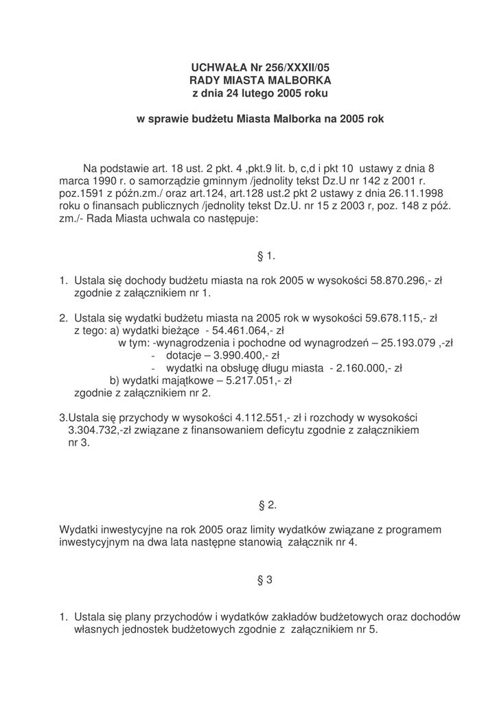 UCHWAŁA Nr 256/XXXII/05 RADY MIASTA MALBORKA z dnia 24 lutego 2005 roku w sprawie bud etu Miasta Malborka na 2005 rok Na podstawie art. 18 ust. 2 pkt. 4 ,pkt.9 lit. b, c,d i pkt 10 ustawy z dnia 8 marca 1990 r. o samorz dzie gminnym /jednolity tekst Dz.U nr 142 z 2001 r. poz.1591 z pó n.zm./ oraz art.124, art.128 ust.2 pkt 2 ustawy z dnia 26.11.1998 roku o finansach publicznych /jednolity tekst Dz.U. nr 15 z 2003 r, poz. 148 z pó . zm./- Rada Miasta uchwala co nast puje: § 1. 1. Ustala si dochody bud etu miasta na rok 2005 w wysoko ci 58.870.296,- zł zgodnie z zał cznikiem nr 1. 2. Ustala si wydatki bud etu miasta na 2005 rok w wysoko ci 59.678.115,- zł z tego: a) wydatki bie ce - 54.461.064,- zł w tym: -wynagrodzenia i pochodne od wynagrodze – 25.193.079 ,-zł - dotacje – 3.990.400,- zł - wydatki na obsług długu miasta - 2.160.000,- zł b) wydatki maj tkowe – 5.217.051,- zł zgodnie z zał cznikiem nr 2. 3.Ustala si przychody w wysoko ci 4.112.551,- zł i rozchody w wysoko ci 3.304.732,-zł zwi zane z finansowaniem deficytu zgodnie z zał cznikiem nr 3. § 2. Wydatki inwestycyjne na rok 2005 oraz limity wydatków zwi zane z programem inwestycyjnym na dwa lata nast pne stanowi zał cznik nr 4. §3 1. Ustala si plany przychodów i wydatków zakładów bud etowych oraz dochodów własnych jednostek bud etowych zgodnie z zał cznikiem nr 5. 2. Ustala si plan przychodów i wydatków funduszu celowego zgodnie z zał cznikiem nr 6. §4 W wydatkach bud etu miasta ustala si nast puj cy zakres i kwoty dotacji przedmiotowych: - ró nica pomi dzy czynszami i opłatami a kosztami eksploatacji wg planu remontów budynków mieszkalnych b d cych własno ci miasta w Zakładzie Gospodarki Komunalnej i Mieszkaniowej na lata 2003 - 2007 - kwota 600.000,-zł. - ró nic pomi dzy przychodami z tyt. wpływu z usług a kosztami utrzymania stadionów, k pieliska miejskiego oraz na koszty organizacji imprez sportowych dla szkół i gimnazjów w O rodku Sportu i Rekreacji - kwota 290.000,zł §5 Dochody i wydatki zwi zane z realizacj zada z zakresu administracji rz dowej i innych zada zleconych w bud ecie miasta na 2005 rok okre la zał cznik nr 7. §6 Wykaz dotacji w wydatkach bud etu miasta na 2005 rok stanowi zał cznik nr 8. §7 Ustala si dochody z tytułu wydawania zezwole na sprzeda napojów alkoholowych w wysoko ci 470.000,-zł oraz wydatki na realizacj zada okre lonych w programie profilaktyki i rozwi zywania problemów alkoholowych w wysoko ci 470.000,- zł. §8 Ustala si dochody i wydatki zwi zane z realizacj zada wspólnych realizowanych w drodze porozumie mi dzy jst w bud ecie Miasta na rok 2005 zgodnie z zał cznikiem nr 9 §9 2 Ustala si prognoz długu zgodnie z zał cznikiem nr 10. § 11 1.Ustala si kwot 1.000.000,-zł po yczek i kredytów krótkoterminowych zaci ganych przez Burmistrza w roku 2005. 2.Okre la si kwot 1.000.000,-zł, do której Burmistrza Miasta mo e samodzielnie zaci ga zobowi zania. 3. Upowa nia si Burmistrza Miasta do: dokonywania przeniesie wydatków bud etowych mi dzy rozdziałami i paragrafami w ramach działu, § 10 Uchwała wchodzi w ycie z dniem podj cia i podlega ogłoszeniu. 3