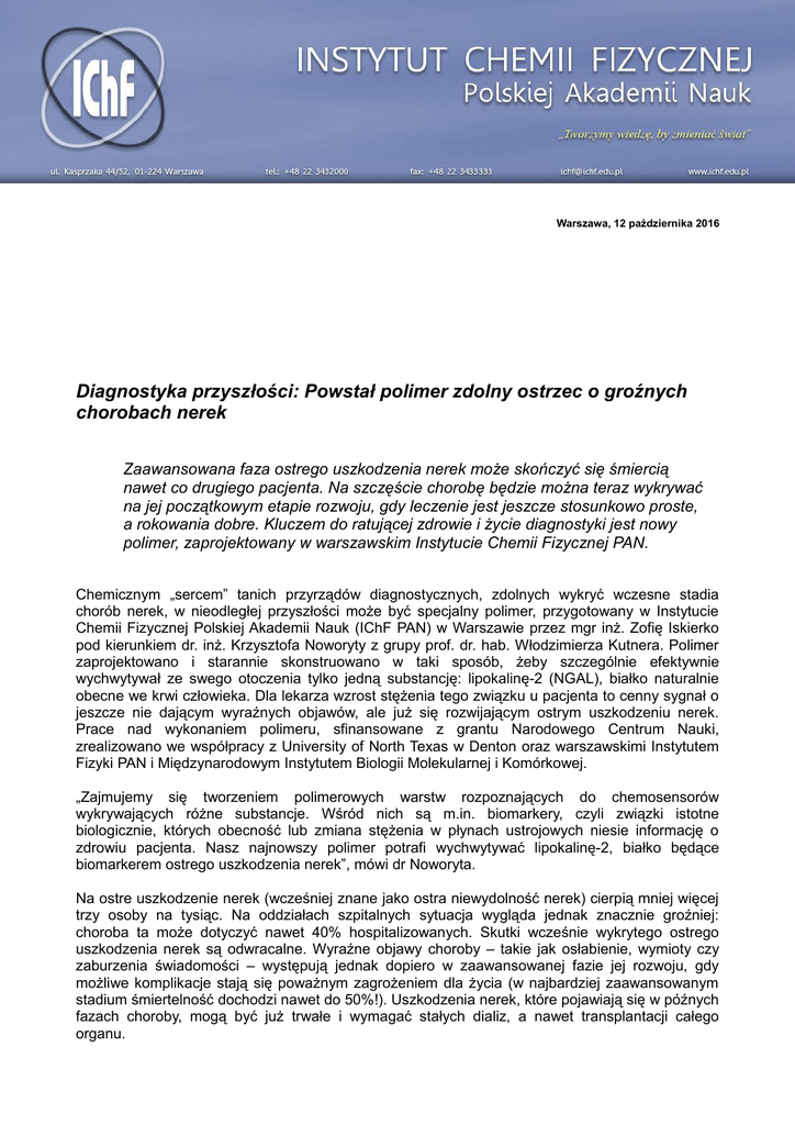 Warszawa, 12 października 2016 Diagnostyka przyszłości: Powstał polimer zdolny ostrzec o groźnych chorobach nerek Zaawansowana faza ostrego uszkodzenia nerek może skończyć się śmiercią nawet co drugiego pacjenta. Na szczęście chorobę będzie można teraz wykrywać na jej początkowym etapie rozwoju, gdy leczenie jest jeszcze stosunkowo proste, a rokowania dobre. Kluczem do ratującej zdrowie i życie diagnostyki jest nowy polimer, zaprojektowany w warszawskim Instytucie Chemii Fizycznej PAN. Chemicznym „sercem” tanich przyrządów diagnostycznych, zdolnych wykryć wczesne stadia chorób nerek, w nieodległej przyszłości może być specjalny polimer, przygotowany w Instytucie Chemii Fizycznej Polskiej Akademii Nauk (IChF PAN) w Warszawie przez mgr inż. Zofię Iskierko pod kierunkiem dr. inż. Krzysztofa Noworyty z grupy prof. dr. hab. Włodzimierza Kutnera. Polimer zaprojektowano i starannie skonstruowano w taki sposób, żeby szczególnie efektywnie wychwytywał ze swego otoczenia tylko jedną substancję: lipokalinę-2 (NGAL), białko naturalnie obecne we krwi człowieka. Dla lekarza wzrost stężenia tego związku u pacjenta to cenny sygnał o jeszcze nie dającym wyraźnych objawów, ale już się rozwijającym ostrym uszkodzeniu nerek. Prace nad wykonaniem polimeru, sfinansowane z grantu Narodowego Centrum Nauki, zrealizowano we współpracy z University of North Texas w Denton oraz warszawskimi Instytutem Fizyki PAN i Międzynarodowym Instytutem Biologii Molekularnej i Komórkowej. „Zajmujemy się tworzeniem polimerowych warstw rozpoznających do chemosensorów wykrywających różne substancje. Wśród nich są m.in. biomarkery, czyli związki istotne biologicznie, których obecność lub zmiana stężenia w płynach ustrojowych niesie informację o zdrowiu pacjenta. Nasz najnowszy polimer potrafi wychwytywać lipokalinę-2, białko będące biomarkerem ostrego uszkodzenia nerek”, mówi dr Noworyta. Na ostre uszkodzenie nerek (wcześniej znane jako ostra niewydolność nerek) cierpią mniej więcej trzy osoby na tysiąc. Na oddziałach szpitalnych sytuacja wygląda jednak znacznie groźniej: choroba ta może dotyczyć nawet 40% hospitalizowanych. Skutki wcześnie wykrytego ostrego uszkodzenia nerek są odwracalne. Wyraźne objawy choroby – takie jak osłabienie, wymioty czy zaburzenia świadomości – występują jednak dopiero w zaawansowanej fazie jej rozwoju, gdy możliwe komplikacje stają się poważnym zagrożeniem dla życia (w najbardziej zaawansowanym stadium śmiertelność dochodzi nawet do 50%!). Uszkodzenia nerek, które pojawiają się w późnych fazach choroby, mogą być już trwałe i wymagać stałych dializ, a nawet transplantacji całego organu. „Zanim ostre uszkodzenie nerek się rozwinie, we krwi chorego rośnie stężenie lipokaliny. Zaprojektowaliśmy więc polimer, w którego strukturze znajdują się luki molekularne bardzo dobrze dopasowane do kształtu i właściwości cząsteczek właśnie tego związku. Prawdopodobieństwo, że ugrzęźnie w nich jakieś inne białko, jest bardzo, bardzo małe”, wyjaśnia doktorantka Zofia Iskierko, pierwsza autorka publikacji w czasopiśmie „ACS Applied Materials & Interfaces”. Nowy polimer wykonano metodą wdrukowania molekularnego. Cząsteczki lipokaliny otoczono najpierw odpowiednio dobranymi, krótkimi polimerami (tzw. funkcyjnymi), wiążącymi się z tym białkiem w specyficznych, charakterystycznych tylko dla niego miejscach. Następnie wprowadzono drugi polimer, sieciujący, który łączył się z polimerem funkcyjnym. Polimer sieciujący poddano później polimeryzacji, po czym z tak powstałej struktury wypłukano lipokalinę. Ostatecznie otrzymano trwałą warstwę polimerową z lukami molekularnymi dopasowanymi do cząsteczek lipokaliny zarówno pod względem ich lokalnych cech chemicznych, jak też rozmiaru i kształtu. „Gdy cząsteczki lipokaliny w badanym roztworze wejdą w kontakt z tak uformowanym polimerem, część z nich ma szansę ulokować się w lukach. Białka są jednak dość duże i niechętnie migrują przez sieć polimerową. Dlatego strukturę naszego polimeru musieliśmy sztucznie rozluźnić, wystarczająco, by zapewnić cząsteczkom lipokaliny jak najlepszy dostęp do jak największej liczby luk, ale nie przesadnie, żeby warstwa polimerowa się nie zapadła”, opisuje dr Noworyta. Wymaganą porowatość przy zachowaniu dostatecznej wytrzymałości mechanicznej naukowcy z IChF PAN otrzymali dzięki użyciu nieorganiczno-organicznych materiałów mikroporowatych typu MOF (Metal-Organic Framework). Pod względem struktury materiały MOF przypominają trójwymiarowe kratownice o rozmiarach „oczek” zależących od rodzaju użytych atomów metalu i łączących je ligandów. To właśnie na tym szkielecie budowlanym wytwarzano właściwą warstwę detekcyjną. Gdy polimer sieciujący był już utwardzony, podczas usuwania cząsteczek lipokaliny niszczono także – wtedy już niepotrzebny – szkielet MOF. Zabieg dodatkowo skutkował rozbudowaniem powierzchni polimeru, co prowadziło do zwiększenia liczby luk dostępnych dla cząsteczek białka i zapewniało lepszą czułość chemoczujnika. Warstwa polimerowa po wychwyceniu cząsteczki lipokaliny zwiększa swą masę. Gdyby więc była osadzona na niewielkim oscylatorze piezoelektrycznym, jego łatwa do zmierzenia częstotliwość drgań musiałaby się zmienić. Innym sposobem zidentyfikowania obecności cząsteczek lipokaliny w lukach molekularnych jest pomiar zmian potencjału warstwy detekcyjnej, który wpływa na zmianę prądu płynącego w elemencie przetwarzającym (tranzystorze polowym). Ze względu na swoją prostotę i niezawodność, to ostatnie rozwiązanie nadawałoby się zwłaszcza do chemoczujników handlowych przeznaczonych dla masowego odbiorcy. „Nasze badania mają charakter podstawowy, laboratoryjny. Od przygotowania polimeru wychwytującego lipokalinę do seryjnej produk