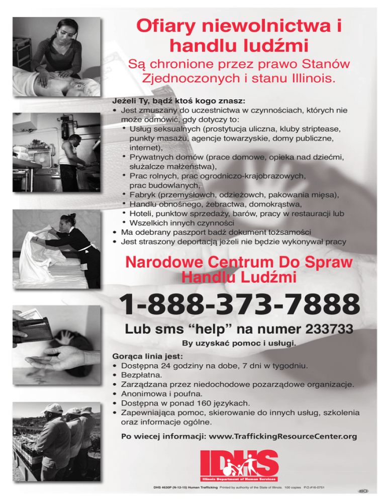 Ofiary niewolnictwa i handlu ludźmi Są chronione przez prawo Stanów Zjednoczonych i stanu Illinois. Jeżeli Ty, bądź ktoś kogo znasz: • Jest zmuszany do uczestnictwa w czynnościach, których nie może odmówić, gdy dotyczy to: • Usług seksualnych (prostytucja uliczna, kluby striptease, punkty masażu, agencje towarzyskie, domy publiczne, internet), • Prywatnych domów (prace domowe, opieka nad dziećmi, służalcze małżeństwa), • Prac rolnych, prac ogrodniczo-krajobrazowych, prac budowlanych, • Fabryk (przemysłowch, odzieżowch, pakowania mięsa), • Handlu obnośnego, żebractwa, domokrąstwa, • Hoteli, punktow sprzedaży, barów, pracy w restauracji lub • Wszelkich innych czynności • Ma odebrany paszport badź dokument tożsamości • Jest straszony deportacją jeżeli nie będzie wykonywał pracy Narodowe Centrum Do Spraw Handlu Ludźmi 1-888-373-7888 Lub sms “help” na numer 233733 By uzyskać pomoc i usługi. Gorąca linia jest: • Dostępna 24 godziny na dobe, 7 dni w tygodniu. • Bezpłatna. • Zarządzana przez niedochodowe pozarządowe organizacje. • Anonimowa i poufna. • Dostępna w ponad 160 językach. • Zapewniająca pomoc, skierowanie do innych usług, szkolenia oraz informacje ogólne. Po wiecej informacji: www.TraffickingResourceCenter.org DHS 4630P (N-12-15) Human Trafficking Printed by authority of the State of Illinois. 100 copies P.O.#16-0751