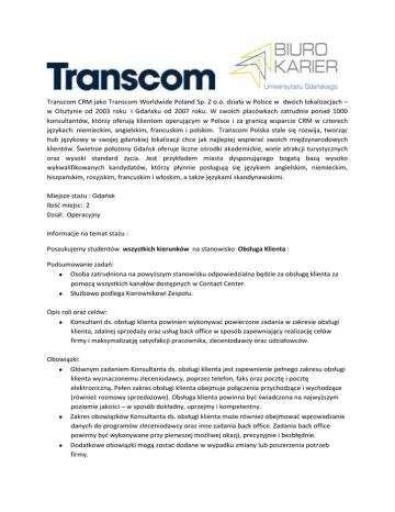 Transcom CRM jako Transcom Worldwide Poland Sp. Z o.o. działa w Polsce w dwóch lokalizacjach – w Olsztynie od 2003 roku i Gdańsku od 2007 roku. W swoich placówkach zatrudnia ponad 1000 konsultantów, którzy oferują klientom operującym w Polsce i za granicą wsparcie CRM w czterech językach: niemieckim, angielskim, francuskim i polskim. Transcom Polska stale się rozwija, tworząc hub językowy w swojej gdańskiej lokalizacji chce jak najlepiej wspierać swoich międzynarodowych klientów. Świetnie położony Gdańsk oferuje liczne ośrodki akademickie, wiele atrakcji turystycznych oraz wysoki standard życia. Jest przykładem miasta dysponującego bogatą bazą wysoko wykwalifikowanych kandydatów, którzy płynnie posługują się językiem angielskim, niemieckim, hiszpańskim, rosyjskim, francuskim i włoskim, a także językami skandynawskimi. Miejsce stażu : Gdańsk Ilość miejsc: 2 Dział: Operacyjny Informacje na temat stażu : Poszukujemy studentów wszystkich kierunków na stanowisko Obsługa Klienta : Podsumowanie zadań: Osoba zatrudniona na powyższym stanowisku odpowiedzialna będzie za obsługę klienta za pomocą wszystkich kanałów dostępnych w Contact Center. Służbowo podlega Kierownikowi Zespołu. Opis roli oraz celów: Konsultant ds. obsługi klienta powinien wykonywać powierzone zadania w zakresie obsługi klienta, zdalnej sprzedaży oraz usług back office w sposób zapewniający realizację celów firmy i maksymalizację satysfakcji pracownika, zleceniodawcy oraz udziałowców. Obowiązki: Głównym zadaniem Konsultanta ds. obsługi klienta jest zapewnienie pełnego zakresu obsługi klienta wyznaczonemu zleceniodawcy, poprzez telefon, faks oraz pocztę i pocztę elektroniczną. Pełen zakres obsługi klienta obejmuje połączenia przychodzące i wychodzące (również rozmowy sprzedażowe). Obsługa klienta powinna być świadczona na najwyższym poziomie jakości – w sposób dokładny, uprzejmy i kompetentny. Zakres obowiązków Konsultanta ds. obsługi klienta może również obejmować wprowadzanie danych do programów zleceniodawcy oraz inne zadania back office. Zadania back office powinny być wykonywane przy pierwszej możliwej okazji, precyzyjnie i bezbłędnie. Dodatkowe obowiązki mogą zostać dodane w wypadku zmiany lub poszerzenia potrzeb firmy. Studenci zainteresowani wzięciem udziału w programie składają następujące dokumenty aplikacyjne: a) deklarację uczestnictwa w programie (załącznik 1, dostępny na bk.ug.edu.pl) b) CV i list motywacyjny, c) zaświadczenie o średniej ocen z całego toku studiów wystawione przez dziekanat. Aplikacje z dopiskiem: STAŻ_TRANSCOM_CSR_PL wysyłamy na adres mailowy [email protected] lub składamy osobiście w Biurze Karier : Biuro Karier UG Sopot, Armii Krajowej 110/203 Na aplikacje czekamy do 30 września 2014 Do aplikacji uprzejmie prosimy dołączyć następującą klauzulę: „Wyrażam zgodę na przetwarzanie moich danych osobowych zawartych w mojej ofercie pracy dla potrzeb niezbędnych do realizacji procesu rekrutacji zgodnie z ustawą z dnia 29 sierpnia 1997 r. o ochronie danych osobowych (Dz. U. z 2002 r. Nr 101, poz. 926, ze zm.)”