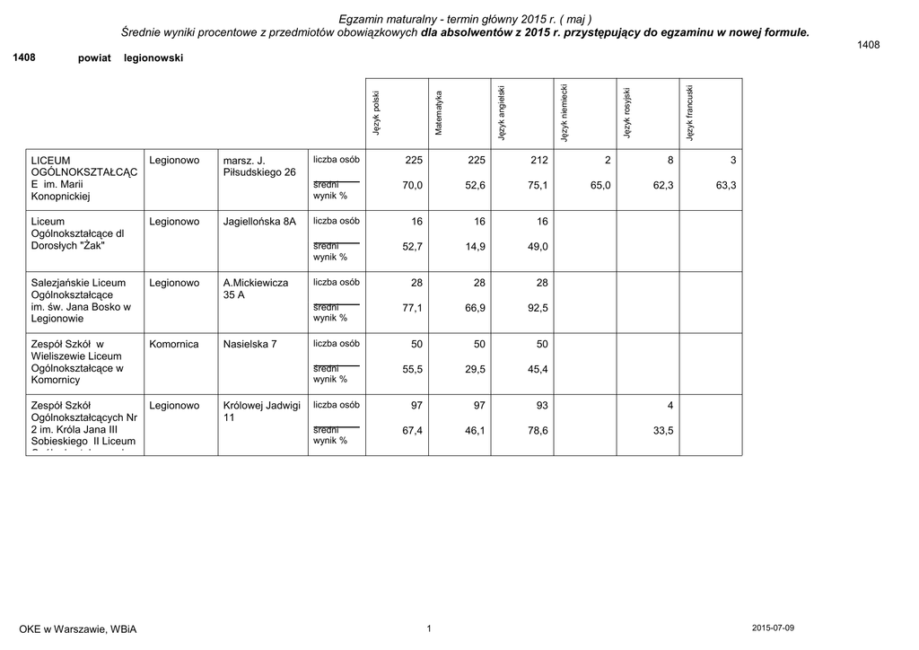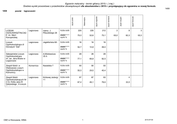 Egzamin maturalny - termin główny 2015 r. ( maj ) Średnie wyniki procentowe z przedmiotów obowiązkowych dla absolwentów z 2015 r. przystępujący do egzaminu w nowej formule. 1408 LICEUM OGÓLNOKSZTAŁCĄC E im. Marii Konopnickiej Legionowo Liceum Ogólnokształcące dl Dorosłych "śak" Legionowo Salezjańskie Liceum Ogólnokształcące im. św. Jana Bosko w Legionowie Legionowo Zespół Szkół w Wieliszewie Liceum Ogólnokształcące w Komornicy Komornica Zespół Szkół Ogólnokształcących Nr 2 im. Króla Jana III Sobieskiego II Liceum Ogólnokształcące ul. Legionowo OKE w Warszawie, WBiA marsz. J. Piłsudskiego 26 liczba osób średni wynik % Jagiellońska 8A liczba osób średni wynik % A.Mickiewicza 35 A liczba osób średni wynik % Nasielska 7 liczba osób średni wynik % Królowej Jadwigi 11 liczba osób średni wynik % Język francuski Język rosyjski Język angielski Język niemiecki legionowski Matematyka powiat Język polski 1408 225 225 212 2 8 3 70,0 52,6 75,1 65,0 62,3 63,3 16 16 16 0 0 0 52,7 14,9 49,0 0,0 0,0 0,0 28 28 28 0 0 0 77,1 66,9 92,5 0,0 0,0 0,0 50 50 50 0 0 0 55,5 29,5 45,4 0,0 0,0 0,0 97 97 93 0 4 0 67,4 46,1 78,6 0,0 33,5 0,0 1 2015-07-09 Egzamin maturalny - termin główny 2015 r. ( maj ) Średnie wyniki procentowe z przedmiotów obowiązkowych dla absolwentów z 2015 r. przystępujący do egzaminu w nowej formule. 1408 LICEUM OGÓLNOKSZTAŁCĄC E im. Marii Konopnickiej Legionowo Liceum Ogólnokształcące dl Dorosłych "śak" Legionowo Salezjańskie Liceum Ogólnokształcące im. św. Jana Bosko w Legionowie Legionowo Zespół Szkół w Wieliszewie Liceum Ogólnokształcące w Komornicy Komornica Zespół Szkół Ogólnokształcących Nr 2 im. Króla Jana III Sobieskiego II Liceum Ogólnokształcące ul. Legionowo OKE w Warszawie, WBiA marsz. J. Piłsudskiego 26 liczba osób średni wynik % Jagiellońska 8A liczba osób średni wynik % A.Mickiewicza 35 A liczba osób średni wynik % Nasielska 7 liczba osób średni wynik % Królowej Jadwigi 11 liczba osób średni wynik % Język francuski Język rosyjski Język angielski Język niemiecki legionowski Matematyka powiat Język polski 1408 225 225 212 2 8 3 70,0 52,6 75,1 65,0 62,3 63,3 16 16 16 0 0 0 52,7 14,9 49,0 0,0 0,0 0,0 28 28 28 0 0 0 77,1 66,9 92,5 0,0 0,0 0,0 50 50 50 0 0 0 55,5 29,5 45,4 0,0 0,0 0,0 97 97 93 0 4 0 67,4 46,1 78,6 0,0 33,5 0,0 1 2015-07-09