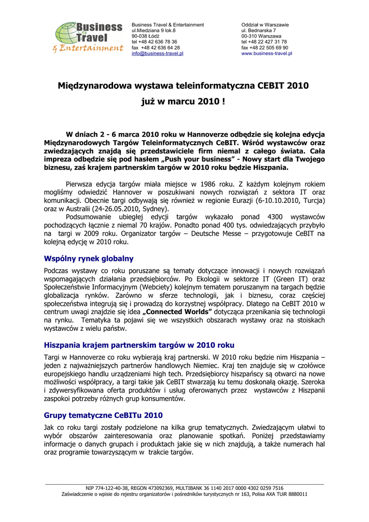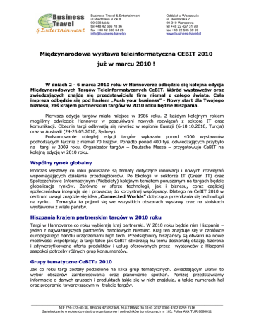 Business Travel & Entertainment ul.Miedziana 9 lok.8 90-038 Łódź tel +48 42 636 78 36 fax +48 42 636 64 28 [email protected] Oddział w Warszawie ul. Bednarska 7 00-310 Warszawa tel +48 22 427 31 78 fax +48 22 505 69 90 www.business-travel.pl Międzynarodowa wystawa teleinformatyczna CEBIT 2010 już w marcu 2010 ! W dniach 2 - 6 marca 2010 roku w Hannoverze odbędzie się kolejna edycja Międzynarodowych Targów Teleinformatycznych CeBIT. Wśród wystawców oraz zwiedzających znajdą się przedstawiciele firm niemal z całego świata. Cała impreza odbędzie się pod hasłem „Push your business” - Nowy start dla Twojego biznesu, zaś krajem partnerskim targów w 2010 roku będzie Hiszpania. Pierwsza edycja targów miała miejsce w 1986 roku. Z każdym kolejnym rokiem mogliśmy odwiedzić Hannover w poszukiwani nowych rozwiązań z sektora IT oraz komunikacji. Obecnie targi odbywają się również w regionie Eurazji (6-10.10.2010, Turcja) oraz w Australii (24-26.05.2010, Sydney). Podsumowanie ubiegłej edycji targów wykazało ponad 4300 wystawców pochodzących łącznie z niemal 70 krajów. Ponadto ponad 400 tys. odwiedzających przybyło na targi w 2009 roku. Organizator targów – Deutsche Messe – przygotowuje CeBIT na kolejną edycję w 2010 roku. Wspólny rynek globalny Podczas wystawy co roku poruszane są tematy dotyczące innowacji i nowych rozwiązań wspomagających działania przedsiębiorców. Po Ekologii w sektorze IT (Green IT) oraz Społeczeństwie Informacyjnym (Webciety) kolejnym tematem poruszanym na targach będzie globalizacja rynków. Zarówno w sferze technologii, jak i biznesu, coraz częściej społeczeństwa integrują się i prowadzą do korzystnej współpracy. Dlatego na CeBIT 2010 w centrum uwagi znajdzie się idea „Connected Worlds” dotycząca przenikania się technologii na rynku. Tematyka ta pojawi się we wszystkich obszarach wystawy oraz na stoiskach wystawców z wielu państw. Hiszpania krajem partnerskim targów w 2010 roku Targi w Hannoverze co roku wybierają kraj partnerski. W 2010 roku będzie nim Hiszpania – jeden z najważniejszych partnerów handlowych Niemiec. Kraj ten znajduje się w czołówce europejskiego handlu urządzeniami high tech. Przedsiębiorcy hiszpańscy są otwarci na nowe możliwości współpracy, a targi takie jak CeBIT stwarzają ku temu doskonałą okazję. Szeroka i zdywersyfikowana oferta produktów i usług oferowanych przez wystawców z Hiszpanii zaspokoi potrzeby różnych grup konsumentów. Grupy tematyczne CeBITu 2010 Jak co roku targi zostały podzielone na kilka grup tematycznych. Zwiedzającym ułatwi to wybór obszarów zainteresowania oraz planowanie spotkań. Poniżej przedstawiamy informacje o danych grupach i produktach jakie się w nich znajdują, a także numerach hal oraz programie towarzyszącym w trakcie targów. _______________________________________________________________________________________________________ NIP 774-122-40-38, REGON 473092369, MULTIBANK 36 1140 2017 0000 4302 0259 7516 Zaświadczenie o wpisie do rejestru organizatorów i pośredników turystycznych nr 163, Polisa AXA TUiR 8880011 Business Travel & Entertainment ul.Miedziana 9 lok.8 90-038 Łódź tel +48 42 636 78 36 fax +48 42 636 64 28 [email protected] Oddział w Warszawie ul. Bednarska 7 00-310 Warszawa tel +48 22 427 31 78 fax +48 22 505 69 90 www.business-travel.pl IT w biznesie – hala nr 2, 3, 4, 5 i 6 W ramach procesów i rozwiązań biznesowych w hali nr 2 będzie można zapoznać się z technologiami serwerowymi i magazynowaniem danych, wirtualizacją oraz rozwiązaniami klasy open source. W hali nr 3 spotkamy rozwiązania związane z mailingiem, analizą biznesową, rozwiązania biurowe i konferencyjne. Również do tej hali zaproszeni są przedsiębiorcy zainteresowani zarządzaniem treścią, obiegiem dokumentów a także zarządzaniem systemami i oprogramowaniem. W hali nr 4 i 5 wystawcy zaprezentują rozwiązania dotyczące zarządzania zasobami przedsiębiorstwa, procesami biznesowymi oraz relacjami z klientem. Również do hal nr 4 i 5 zapraszamy wszystkich zainteresowanych architekturą klasy SOA oraz telekomunikacją w firmie. W hali nr 6 przedstawione zostaną systemy związane z zarządzaniem zasobami ludzkimi, kontrolą dostępu do zasobów, rozwiązania dla przemysłu a także rozwiązania związane z zarządzaniem wiedzą i e-learningowe.W tej samej hali będzie można również zapoznać się z systemami identyfikacji AutoID oraz RFID. W ramach programu towarzyszącego działowi biznesowemu targów CeBIT odbędą się następujące imprezy specjalne: − forum wirtualizacji i magazynowania danych − forum dotyczące rozwiązań klasy open source − Rozwiązania dla sektora MSP − MAC Busness Parc − Forum klasy DMS powiązane z wystawą − Pokaz rozwiązań VoIP w telekomunikacji „Live & Digital VoiPost” − Forum eksperckie w zakresie zarządzania dokumentami − Forum i wystawa oprogramowania i systemów komputerowych − Świat aplikacji biznesowych − Giełda pracy i kariery CeBIT − Forum rozwiązń e-learningowych i zarządzania wiedzą − Systemy AutoID oraz RFID – forum i wystawa Internet i rozwiązania mobilne oraz Webciety – hala nr 6 W ramach tej grupy wystawcy zaprezentują na targach media elektroniczne, rozwiązania dla platform online, systemy zarządzania zawartością stron internetowych oraz inne mobilne rozwiązania dla firm. W ramach programu towarzyszącego tej grupie zainteresowani mogą odwiedzić: − forum Webciety − forum eksperckie ds Internetu − stoisko zbiorcze „Handel elektroniczny – Zarządzanie treścią – Usługi online” − forum marketingu internetowego „OnBIZ” Nawigacja i Inteligentne Systemy Transportowe (ITS) – hala nr 7 W hali nr 7 można będzie odwiedzić stoiska prezentujące rozwiązania dla przemysłu transportowego i logistycznego. Zapraszamy również wszystkich zainteresowanych telematyką i nawigacją. Prog