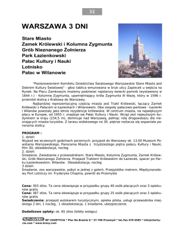 32 WARSZAWA 3 DNI Stare Miasto Zamek Królewski i Kolumna Zygmunta Grób Nieznanego Żołnierza Park Łazienkowski Pałac Kultury i Nauki Lotnisko Pałac w Wilanowie "Postanowieniem Komitetu Dziedzictwa Światowego Warszawskie Stare Miasto jest Dobrem Kultury Światowej" - głosi tablica wmurowana w bruk ulicy Zapiecek u wejścia na Rynek. Na Placu Zamkowym możemy podziwiać najstarszy świecki pomnik (wystawiony w 1644 r.) - Kolumnę Zygmunta, upamiętniający króla Zygmunta III Wazę, który w 1596 r. przeniósł stolicę z Krakowa do Warszawy. Najbardziej reprezentacyjną częścią miasta jest Trakt Królewski, łączący Zamek Królewski z Pałacem w Łazienkach i Wilanowem. Oba zespoły pałacowo-parkowe - Łazienki i Wilanów powstały jako letnie rezydencje królewskie. W centrum miasta, na największym placu w Europie, od 1955 r. znajduje się Pałac Kultury i Nauki. Wciąż jest najwyższym bu dynkiem w kraju (234,5 m), dominuje nad Warszawą, pełniąc rolę drogowskazu dla nieznających miasta turystów. Z tarasu widokowego na 30. piętrze roztacza się wspaniała panorama stolicy. PROGRAM : 1. dzień: Wyjazd we wczesnych godzinach porannych, przyjazd do Warszawy ok. 13.00 Muzeum Powstania Warszawskiego, Panorama Miasta z trzydziestego piętra pałacu Kultury i Nauki, film 3D, obiadokolacja, nocleg 2. dzień: Śniadanie. Zwiedzanie z przewodnikiem: Stare Miasto, Kolumna Zygmunta, Zamek Królewski, Grób Nieznanego Żołnierza. Przejazd Traktem Królewskim do Łazienek, spacer po Par ku Łazienkowskim. Wilanów. Obiadokolacja, nocleg 3 dzień: Śniadanie, zoo warszawskie, pobyt w jednej z galerii, Przejażdżka metrem, Międzynarodowy Port Lotniczy im. Fryderyka Chopina, powrót do Przemyśla Cena: 303 zł/os. Ta cena obowiązuje w przypadku grupy 40 osób płacących oraz 3 opiekunów gratis Cena: 387 zł/os. Ta cena obowiązuje w przypadku grupy 25 osób płacących oraz 2 opiekunów gratis Świadczenia: przejazd autokarem turystycznym, opieka pilota, usługi przewodnika miejskiego 2 dni, 1 nocleg, 1 obiadokolacja, 1 śniadanie, ubezpieczenie. Dodatkowe opłaty: ok. 65 zł/os (bilety wstępu) BP CHORTYCIA * Plac Na Bramie 8 * 37-700 Przemyśl * tel./fax 678 6585 * [email protected] * www.kresy.com