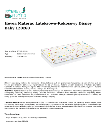 Hevea Materac Lateksowo-Kokosowy Disney Baby 120x60 Kod produktu HV08_08_06 Typ Lateksowo-kokosowe Wymiary 120x60 cm Hevea Materac lateksowo-kokosowy Disney Baby 120x60 Zdrowy, rozwojowy materac dla niemowląt i dzieci. Lateks o gr. 5 cm gwarantuje elastyczne podparcie a kokos gr. 2 cm twardą powierzchnię zalecaną od pierwszych dni po urodzeniu. Budowa warstw zapewnia cyrkulację powietrza wewnątrz materaca. Pozytywna Opinia IMID. Pokrowiec „Winnie The Pooh” łatwy do uprania, 100% czystość i higiena. Strona twarda i średnio-twarda, zmiana stron po ok. 9 miesiącach. BUDOWA: Płyta lateksowa 5 cm z warstwą kokosową lateksowaną 2 cm. Pokrowiec wewnętrzny bawełniany, pokrowiec zewnętrzny z dzianiny pikowanej owatą. Dzianina pokrowca – bawełna 100% interlock. Pokrowiec rozpinany, taśma suwakowa z 3 stron, pokrowiec do prania w temp. 60C. Dzianina z certyfikatem Bezpieczny dla dziecka. Kolekcja we wzory graficzne udostępnione przez The Walt Disney Company. ZASTOSOWANIE: grupa wiekowa 0-2 lata, łóżeczka dziecięce szczebelkowe z płytą lub stelażem, waga dziecka do 40 kg, materac dwustronny, rozwojowy – strona kokosowa przeznaczona dla niemowląt do 8-9 miesiąca, strona lateksowa po zamianie stron wkładu może być stosowana już do końca okresu łóżeczkowego. Możliwość wykonania rozmiarów nietypowych. Nie zginamy i nie zwijamy do transportu i przechowywania. Waga i wymiary: ∙ waga materaca 7 kg, wys. ok. 9cm (z pokrowcem); ∙ dostępne rozmiary: 120/60. Czas oczekiwania: 1-5 dni roboczych. Rodzaj pokrowca: Winnie the Pooh (Kubuś Puchatek). Twardość: H2 (średnio-twardy), H3 (twardy). Gwarancja: 24 miesiące (5 lat na wkład).