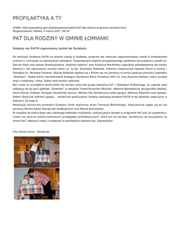 PROFILAKTYKA A TY Źródło: http://pat.policja.gov.pl/pat/wydarzenia/624,PaT-dla-rodziny-w-gminie-Lomianki.html Wygenerowano: Sobota, 4 marca 2017, 09:34 PAT DLA RODZINY W GMINIE ŁOMIANKI Kolejny raz PaT/R zaproszony został do Świątyni. Po realizacji działania PaT/R na terenie szkoły w Sadowej, program dla rodziców zaprezentowany został w Dziekanowie Leśnym k. Łomianek na zakończenie rekolekcji. Gospodarzami pięknie przygotowanego spotkania był proboszcz parafii ks. Dariusz Kosk oraz prezes Stowarzyszenia „Rodzina rodzinie” pani Krystyna Mychlińska (specjalne podziękowania dla siostry Eweliny!). Na zaproszenie przybył także J.E. ks.bp. Stanisław Stefanek, któremu towarzyszył kapelan Policji w Łomży i Ostrołęce ks. Mirosław Orłowski. Biskup Stefanek spotkał się z PaTem po raz pierwszy w Łomży podczas premiery spektaklu „Blackout”. Kadrę Policji reprezentował Zastępca Dyrektora Biura Prewencji KGP mł. insp Ryszard Garbarz, który przybył wraz z małżonką i córką. Zatem było bardzo rodzinnie. Być może ta szczególna okoliczność tak bardzo umocniła grupę teatralną PaT z Sokołowa Podlaskiego, że zagrała swój najlepszy do tej pory spektakl „Dzwonek” w obsadzie: Paweł Burzyński (Maciek), Wiktoria Benedykciuk (przyjaciółka Maćka), Anna Hilaruk (matka), Grzegorz Nowotniak (ojciec), Monika Fąk (dziewczyna szefa gangu), Mateusz Ratyński (szef gangu), Robert Stańczuk (żołnierz gangu) – serdecznie gratulujemy! Kolejną realizację działania PaT/R w tej obsadzie zobaczymy w Sabniach 25 maja br. Realizację techniczną prowadził Grzegorz Utnik wspierany przez Tomasza Bielińskiego. Inspicjenturą zajęła się po raz pierwszy Monika Kaiser-Maciejczak (dziękujemy!) oraz Maciej Kociszewski. W zasadzie do końca tego roku szkolnego kalendarz możliwości realizacyjnych działań w programie PaT jest już wypełniony. Czeka nas jeszcze wiosna teatralnych przeglądów profilaktycznych, które już się zaczęły. Zachęcamy do przysyłania na stronę PaT, własnych relacji z wydarzeń w profilaktyce rówieśniczej. Zapraszamy! Foto: Monika Kaiser - Maciejczak Ocena: 4.3/5 (4) Tweetnij