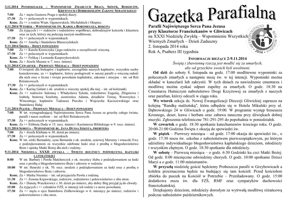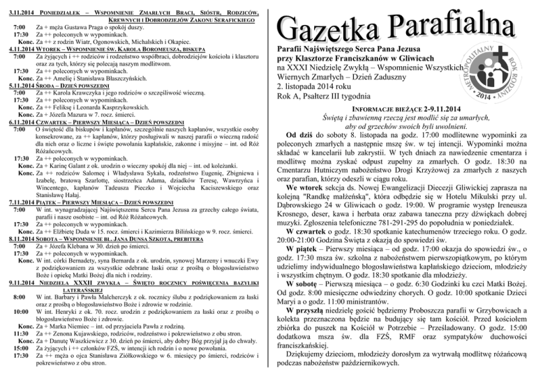 3.11.2014 PONIEDZIAŁEK – WSPOMNIENIE ZMARŁYCH BRACI, SIÓSTR, RODZICÓW, KREWNYCH I DOBRODZIEJÓW ZAKONU SERAFICKIEGO 7:00 Za + męża Gustawa Praga o spokój duszy. 17:30 Za ++ poleconych w wypominkach. Konc. Za ++ z rodzin Wiatr, Ogonowskich, Michalskich i Okapiec. 4.11.2014 WTOREK – WSPOMNIENIE ŚW. KAROLA BOROMEUSZA, BISKUPA 7:00 Za żyjących i ++ rodziców i rodzeństwo współbraci, dobrodziejów kościoła i klasztoru oraz za tych, którzy się polecają naszym modlitwom. 17:30 Za ++ poleconych w wypominkach. Konc. Za ++ Amelię i Stanisława Błaszczyńskich. 5.11.2014 ŚRODA – DZIEŃ POWSZEDNI 7:00 Za ++ Karola Krawczyka i jego rodziców o szczęśliwość wieczną. 17:30 Za ++ poleconych w wypominkach. Konc. Za ++ Feliksę i Leonarda Kasprzykowskich. Konc. Za + Józefa Mazura w 7. rocz. śmierci. 6.11.2014 CZWARTEK – PIERWSZY MIESIĄCA – DZIEŃ POWSZEDNI 7:00 O świętość dla biskupów i kapłanów, szczególnie naszych kapłanów, wszystkie osoby konsekrowane, za ++ kapłanów, którzy posługiwali w naszej parafii o wieczną radość dla nich oraz o liczne i święte powołania kapłańskie, zakonne i misyjne – int. od Róż Różańcowych. 17:30 Za ++ poleconych w wypominkach. Konc. Za + Karinę Galant z ok. urodzin o wieczny spokój dla niej – int. od koleżanki. Konc. Za ++ rodziców Salomeę i Władysława Sykała, rodzeństwo Eugenię, Zbigniewa i Izabelę, bratową Szarlottę, siostrzeńca Adama, dziadków Teresę, Wawrzyńca i Wincentego, kapłanów Tadeusza Pieczko i Wojciecha Kaciszewskiego oraz Stanisławę Hałaj. 7.11.2014 PIĄTEK – PIERWSZY MIESIĄCA – DZIEŃ POWSZEDNI 7:00 W int. wynagradzającej Najświętszemu Sercu Pana Jezusa za grzechy całego świata, parafii i nasze osobiste – int. od Róż Różańcowych. 17:30 Za ++ poleconych w wypominkach. Konc. Za ++ Elżbietę Duda w 15. rocz. śmierci i Kazimierza Bilińskiego w 9. rocz. śmierci. 8.11.2014 SOBOTA – WSPOMNIENIE BŁ. JANA DUNSA SZKOTA, PREBITERA 7:00 Za + Józefa Klebana w 30. dzień po śmierci. 17:30 Za ++ poleconych w wypominkach. Konc. W int. córki Bernadety, syna Bernarda z ok. urodzin, synowej Marzeny i wnuczki Ewy z podziękowaniem za wszystkie odebrane łaski oraz z prośbą o błogosławieństwo Boże i opiekę Matki Bożej dla nich i rodziny. 9.11.2014 NIEDZIELA XXXII ZWYKŁA – ŚWIĘTO ROCZNICY POŚWIĘCENIA BAZYLIKI LATERAŃSKIEJ W int. Barbary i Pawła Malcherczyk z ok. rocznicy ślubu z podziękowaniem za łaski oraz z prośbą o błogosławieństwo Boże i zdrowie w rodzinie. 10:00 W int. Henryki z ok. 70. rocz. urodzin z podziękowaniem za łaski oraz z prośbą o błogosławieństwo Boże i zdrowie. Konc. Za + Marka Niemiec – int. od przyjaciela Pawła z rodziną. 11:30 Za ++ Zenona Kujawskiego, rodziców, rodzeństwo i pokrewieństwo z obu stron. Konc. Za + Danutę Waszkiewicz z 30. dzień po śmierci, aby dobry Bóg przyjął ją do chwały. 15:00 Za żyjących i ++ członków FZŚ, w intencji ich rodzin i o nowe powołania. 17:30 Za ++ męża o ojca Stanisława Ziółkowskiego w 6. miesięcy po śmierci, rodziców i pokrewieństwo z obu stron. 8:00 Parafii Najświętszego Serca Pana Jezusa przy Klasztorze Franciszkanów w Gliwicach na XXXI Niedzielę Zwykłą – Wspomnienie Wszystkich Wiernych Zmarłych – Dzień Zaduszny 2. listopada 2014 roku Rok A, Psałterz III tygodnia INFORMACJE BIEŻĄCE 2-9.11.2014 Świętą i zbawienną rzeczą jest modlić się za umarłych, aby od grzechów swoich byli uwolnieni. Od dziś do soboty 8. listopada na godz. 17:00 modlitewne wypominki za poleconych zmarłych a następnie mszę św. w tej intencji. Wypominki można składać w kancelarii lub zakrystii. W tych dniach za nawiedzenie cmentarza i modlitwę można zyskać odpust zupełny za zmarłych. O godz. 18:30 na Cmentarzu Hutniczym nabożeństwo Drogi Krzyżowej za zmarłych z naszych oraz parafian, którzy odeszli w ciągu roku. We wtorek sekcja ds. Nowej Ewangelizacji Diecezji Gliwickiej zaprasza na kolejną "Randkę małżeńską", która odbędzie się w Hotelu Mikulski przy ul. Dąbrowskiego 24 w Gliwicach o godz. 19:00. W programie występ Ireneusza Krosnego, deser, kawa i herbata oraz zabawa taneczna przy dźwiękach dobrej muzyki. Zgłoszenia telefoniczne 781-291-295 do popołudnia w poniedziałek. W czwartek o godz. 18:30 spotkanie katechumenów trzeciego roku. O godz. 20:00-21:00 Godzina Święta z okazją do spowiedzi św. W piątek – Pierwszy miesiąca – od godz. 17:00 okazja do spowiedzi św., o godz. 17:30 msza św. szkolna z nabożeństwem pierwszopiątkowym, po którym udzielimy indywidualnego błogosławieństwa kapłańskiego dzieciom, młodzieży i wszystkim chętnym. O godz. 18:30 spotkanie dla młodzieży. W sobotę – Pierwszą miesiąca – o godz. 6:30 Godzinki ku czci Matki Bożej. Od godz. 8:00 miesięczne odwiedziny chorych. O godz. 10:00 spotkanie Dzieci Maryi a o godz. 11:00 ministrantów. W przyszłą niedzielę gościć będziemy Proboszcza parafii w Grzybowicach a kolekta przeznaczona będzie na budujący się tam kościół. Przed kościołem zbiórka do puszek na Kościół w Potrzebie – Prześladowany. O godz. 15:00 dodatkowa msza św. dla FZŚ, RMF oraz sympatyków duchowości franciszkańskiej. Dziękujemy dzieciom, młodzieży dorosłym za wytrwałą modlitwę różańcową podczas nabożeństw październikowych. Zwracamy się z prośbą o produkty do śniadań adwentowych dla dzieci: nutellę, dżem truskawkowy lub malinowy oraz tłuszcz do smarowania bułek. Zapisy na przyjęcie Ikony św. Rodziny z racji Roku Rodziny w zakrystii. Polecamy kolejny numer Gościa Niedzielnego i Gazetki Parafialnej, a w niej parafialne wypominki. Parafianom i Gościom dziękujemy za modlitwy, ofiary i kwiaty. Niech Bóg udzieli wiecznego pokoju naszym bliskim zmarłym. NASZE PARAFIALNE WYPOMINKI Od ubiegłorocznego Wspomnienia Wszystkich Wiernych Zmarłych odeszło do Boga 68 Parafian. Najstarsza z nich dożyła 94 roku życia, na