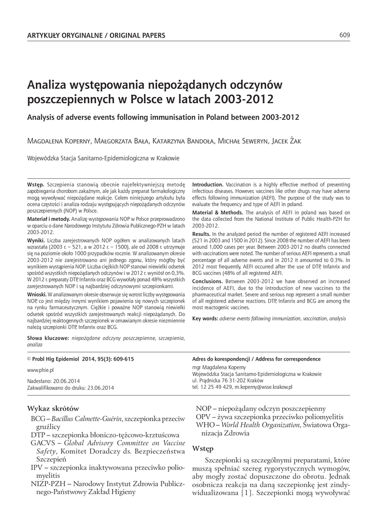Koperny Probl HigMEpidemiol i wsp. Analiza 2014,występowania 95(3): xxx niepożądanych Artykuły oryginalne / original papers odczynów poszczepiennych w Polsce w latach 2003-2012 609 Analiza występowania niepożądanych odczynów poszczepiennych w Polsce w latach 2003-2012 Analysis of adverse events following immunisation in Poland between 2003-2012 Magdalena Koperny, Małgorzata Bała, Katarzyna Bandoła, Michał Seweryn, Jacek Żak Wojewódzka Stacja Sanitarno-Epidemiologiczna w Krakowie Wstęp. Szczepienia stanowią obecnie najefektywniejszą metodę zapobiegania chorobom zakaźnym, ale jak każdy preparat farmakologiczny mogą wywoływać niepożądane reakcje. Celem niniejszego artykułu była ocena częstości i analiza rodzaju występujących niepożądanych odczynów poszczepiennych (NOP) w Polsce. Materiał i metody. Analizę występowania NOP w Polsce przeprowadzono w oparciu o dane Narodowego Instytutu Zdrowia Publicznego-PZH w latach 2003-2012. Wyniki. Liczba zarejestrowanych NOP ogółem w analizowanych latach wzrastała (2003 r. – 521, a w 2012 r. – 1500), ale od 2008 r. utrzymuje się na poziomie około 1000 przypadków rocznie. W analizowanym okresie 2003-2012 nie zarejestrowano ani jednego zgonu, który mógłby być wynikiem wystąpienia NOP. Liczba ciężkich NOP stanowi niewielki odsetek spośród wszystkich niepożądanych odczynów i w 2012 r. wyniósł on 0,3%. W 2012 r. preparaty DTP, Infanrix oraz BCG wywołały ponad 48% wszystkich zarejestrowanych NOP i są najbardziej odczynowymi szczepionkami. Wnioski. W analizowanym okresie obserwuje się wzrost liczby występowania NOP, co jest między innymi wynikiem pojawienia się nowych szczepionek na rynku farmaceutycznym. Ciężkie i poważne NOP stanowią niewielki odsetek spośród wszystkich zarejestrowanych reakcji niepożądanych. Do najbardziej reaktogennych szczepionek w omawianym okresie niezmiennie należą szczepionki DTP, Infanrix oraz BCG. Introduction. Vaccination is a highly effective method of preventing infectious diseases. However, vaccines like other drugs may have adverse effects following immunization (AEFI). The purpose of the study was to evaluate the frequency and type of AEFI in poland. Material & Methods. The analysis of AEFI in poland was based on the data collected from the National Institute of Public Health-PZH for 2003-2012. Results. In the analyzed period the number of registered AEFI increased (521 in 2003 and 1500 in 2012). Since 2008 the number of AEFI has been around 1,000 cases per year. Between 2003-2012 no deaths connected with vaccinations were noted. The number of serious AEFI represents a small percentage of all adverse events and in 2012 it amounted to 0.3%. In 2012 most frequently, AEFI occurred after the use of DTP, Infanrix and BCG vaccines (48% of all registered AEFI. Conclusions. Between 2003-2012 we have observed an increased incidence of AEFI, due to the introduction of new vaccines to the pharmaceutical market. Severe and serious nop represent a small number of all registered adverse reactions. DTP, Infanrix and BCG are among the most reactogenic vaccines. Key words: adverse events following immunization, vaccination, analysis Słowa kluczowe: niepożądane odczyny poszczepienne, szczepienia, analiza © Probl Hig Epidemiol 2014, 95(3): 609-615 www.phie.pl Nadesłano: 20.06.2014 Zakwalifikowano do druku: 23.06.2014 Wykaz skrótów BCG – Bacillus Calmette-Guérin, szczepionka przeciw gruźlicy DTP – szczepionka błoniczo-tężcowo-krztuścowa GACVS – Global Advisory Committee on Vaccine Safety, Komitet Doradczy ds. Bezpieczeństwa Szczepień IPV – szczepionka inaktywowana przeciwko poliomyelitis NIZP-PZH – Narodowy Instytut Zdrowia Publicznego-Państwowy Zakład Higieny Adres do korespondencji / Address for correspondence mgr Magdalena Koperny Wojewódzka Stacja Sanitarno-Epidemiologiczna w Krakowie ul. Prądnicka 76 31-202 Kraków tel. 12 25 49 429, [email protected] NOP – niepożądany odczyn poszczepienny OPV – żywa szczepionka przeciwko poliomyelitis WHO – World Health Organization, Światowa Organizacja Zdrowia Wstęp Szczepionki są szczególnymi preparatami, które muszą spełniać szereg rygorystycznych wymogów, aby mogły zostać dopuszczone do obrotu. Jednak osobnicza reakcja na daną szczepionkę jest zindywidualizowana [1]. Szczepionki mogą wywoływać 610 niepożądane odczyny poszczepienne (NOP) będące medycznymi objawami czasowo związanymi ze szczepieniem, które mogą być spowodowane działaniem szczepionki, współwystępowaniem objawów lub chorób u szczepionego pacjenta lub też błędem podczas podania szczepionki. Część z NOP może mieć przebieg łagodny, ale mogą również wystąpić odczyny ciężkie i poważne [2]. Zasady zgłaszania i kryteria klasyfikacji odczynów poszczepiennych w Polsce są uregulowane między innymi Ustawą z dnia 5 grudnia 2008 r. o zapobieganiu oraz zwalczaniu zakażeń i chorób zakaźnych u ludzi (tekst jednolity z dnia 19 kwietnia 2013 r. Dz. U. z 2013 r., poz. 947) oraz rozporządzeniem Ministra Zdrowia z dnia 21 grudnia 2010 r. w sprawie niepożądanych odczynów poszczepiennych oraz kryteriów ich rozpoznawania [4, 5]. Państwowa Inspekcja Sanitarna prowadzi rejestr zgłoszeń NOP z terenu powiatów oraz województw. Rejestr NOP prowadzi również Narodowy Instytut Zdrowia Publicznego-Państwowy Zakład Higieny (NIZP-PZH). Informacja o wystąpieniu NOP przekazywana jest ponadto do Departamentu Monitorowania Niepożądanych Działań Produktów Leczniczych Urzędu Rejestracji Produktów Leczniczych, Wyrobów Medycznych i Produktów Biobójczych, Głównego Inspektoratu Sanitarnego i Wojewódzkich Inspektoratów Farmaceutycznych. Na szczeblu międzynarodowym funkcjonuje powołany przez WHO Komitet Doradczy ds. Bezpieczeństwa Szczepień (Global Advisory Committee on Vaccine Safety – GACVS), którego zadaniem jest ocena bezpieczeństwa szczepień w oparciu o naukowe doniesienia or