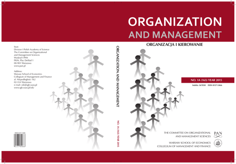 ORGANIZATION AND MANAGEMENT Address: Warsaw School of Economics Collegium of Management and Finance al. Niepodległości 162 02-554 Warszawa e-mail: [email protected] www.sgh.waw.pl/oik/ NO. 1A (165) YEAR 2015 ISSN 0137-5466 ORGANIZATION AND MANAGEMENT Seat: Division I Polish Academy of Science The Committee on Organizational and Management Sciences Wydział I PAN PKiN, Plac Defilad 1 00-901 Warszawa www.pan.pl ORGANIZACJA I KIEROWANIE NO. 1A (165) YEAR 2015 Indeks 367850 ISSN 0137-5466 THE COMMITTEE ON ORGANIZATIONAL AND MANAGEMENT SCIENCES WARSAW SCHOOL OF ECONOMICS COLLEGIUM OF MANAGEMENT AND FINANCE OrganizatiOn and management ORGANIZAcjA I kIeROwANIe MEMBERS OF “ORGANIZATION AND MANAGEMENT” QUARTERLY PROGRAMME COMMITTEE Bogdan Nogalski (University of Gdansk) – President of the Committee Ryszard Borowiecki (Cracow University of Economics) – Vice President of the Committee Maria Romanowska (Warsaw School of Economics) – Vice President of the Committee Wiesław M. Grudzewski (Academy of Physical Education in Katowice) Jan Jeżak (University of Lodz) Andrzej K. Koźmiński (Kozminski University) Kazimierz Krzakiewicz (Poznan University of Economics) Tadeusz Listwan (Social Academy of Science in Lodz, School of Management and Banking in Wroclaw) Janusz Strużyna (University of Economics in Katowice) Michał Trocki (Warsaw School of Economics) Wiktor Askanas (University of New Brunswick, Canada) Klaus Brockhoff (Otto Beisheim School of Management, Vallendar, Germany) Zbigniew J. Czajkiewicz (University of Houston, USA) William Egelhoff (Graduale School of Business. Fordham University, New York, USA) Frank Krawiec (Pennsylvania University, USA) Rainer Marr (Bundeswehr University Munchen, Germany) Claude Martin (University of Grenoble, France) Jurij Pawlenko (Russian Academy of Sciences, Russia) Zdenek Soucek (Univeristy of Economics, Prague, Czech Rep.) Norbert Thom (University of Bern, Switzerland) ORGANIZATION AND MANAGEMENT ORGANIZACJA I KIEROWANIE N0. 1A (165) YEAR 2015 Index 367850 ISSN 0137‑5466 Publisher: THE COMMITTEE ON ORGANIZATIONAL AND MANAGEMENT SCIENCES & WARSAW SCHOOL OF ECONOMICS This publication is subsidized by Ministry of Science and Higher Education Editorial board: Szymon Cyfert (Poznan University of Economics) – Chairman Janusz Czekaj (Cracow University of Economics) – Editor‑in chief Jacek M. Rybicki (University of Gdansk) – Editor‑in chief Piotr Wachowiak (Warsaw School of Economics) – Editorial Assistant Sections editors: Janusz Czekaj (Cracow University of Economics) – methodology of organizational and management sciences, management concepts and methods Wojciech Dyduch (University of Economics in Katowice) – entrepreneurship, small business management Aldona Frączkiewicz‑Wronka (University of Economics in Katowice) – public sector management Jerzy Niemczyk (Wroclaw University of Economics) – firm theory Jacek M. Rybicki (University of Gdansk) – strategic management Agnieszka Sopińska (Warsaw School of Economics) – knowledge management and intellectual capital management Marzena Stor (Wroclaw University of Economics) – human resources management Maciej Urbaniak (University of Lodz) – logistics and quality management Reception: Anna Domalewska, tel. +48 22 564 95 34, e‑mail: [email protected] Distribution and Promotion: Anna Czułek, tel. +48 22 564 98 37, e‑mail: [email protected] Section chief editor: Kamila Grzesiak, e-mail: [email protected] Production editor: Ewa Łukasiewicz, e‑mail: [email protected] © Copyright by The Committee on Organizational and Management Sciences & Warsaw School of Economics, Collegium of Management Finance, Warsaw 2015 All rights reserved. No part of this issue may be reproduced or transmitted in any form or by any means, electronic or mechanical, including photocopying, recording or by any information storage and retrieval system, without permission in writing from the publisher. All articles published in the quarterly are subject to reviews. Statistical review: Małgorzata Rószkiewicz (Warsaw School of Economics) Peer review: Jarosław Karpacz, Wioletta Mierzejewska, Rafał Mrówka, Anna Wójcik-Karpacz. Adress: Warsaw School of Economics Collegium of Management and Finance al. Niepodległości 162, 02–554 Warszawa e‑mail: [email protected], www.sgh.waw.pl/oik/ Cover design: Małgorzata Przestrzelska DTP Operator: DM QUADRO Printing and Binding: QUICK‑DRUK Edition: 150 copies Order 163/XI/15 CONTENTS Szymon Cyfert THE INTRODUCTION ................................................................................................7 Paweł Mielcarek IMPLEMENTATION OF INNOVATION PROCESS IN INDUSTRIAL ENTERPRISES – RESEARCH RESULTS ........................................................................9 WDRAŻANIE PROCESU INNOWACJI W PRZEDSIĘBIORSTWACH PRZEMYSŁOWYCH – WYNIKI BADAŃ.............................................................................................................................. 19 Barbara Fryzel CSR MOTIVES AND IDENTITY. ROLE OF ATTRIBUTIONS IN ENHANCING CSR DECLARATIONS .................................................................................................21 MOTYWY I TOŻSAMOŚĆ CSR. ROLA ATRYBUCJI WE WZMACNIANIU SPOŁECZNYCH DEKLARACJI FIRM............................................................................................................................. 36 Norbert Thom TALENT MANAGEMENT THROUGH “TRAINEE PROGRAMMES”. CONCEPTUAL PRELIMINARIES AND RESEARCH-BASED ADVICE ON THE DESIGN OF CORPORATE EDUCATIONAL PROGRAMMES FOR UNIVERSITY GRADUATES .................................................................................37 ZARZĄDZANIE TALENTEM POPRZEZ “PROGRAMY STAŻOWE”. ZARYS KONCEPCJI ORAZ POPARTE NAUKOWO SUGESTIE ODNOŚNIE TWORZENIA KORPORACYJNYCH PROGRAMÓW EDUKACYJNYCH DLA ABSOLWENTÓW UCZELNI............................................. 48 Krzysztof Nowosielski CONTROLLERS’ IT-QUALIFICATIONS AND MANAGEMENT RE
