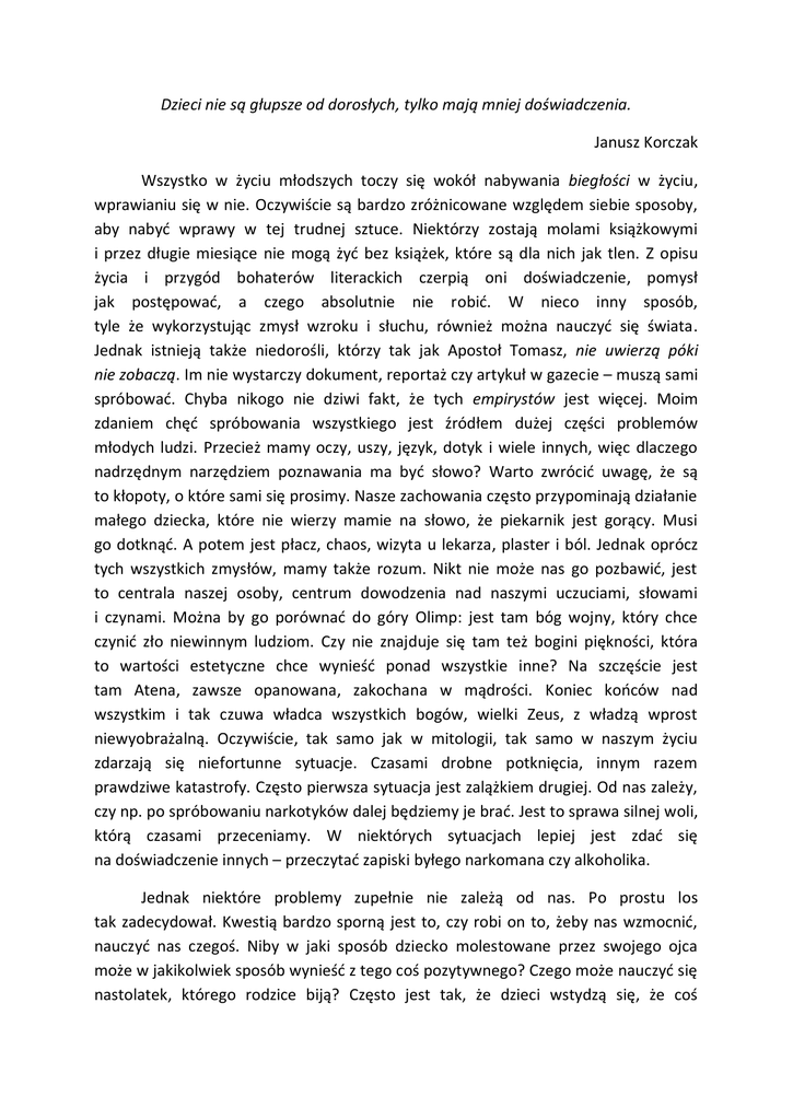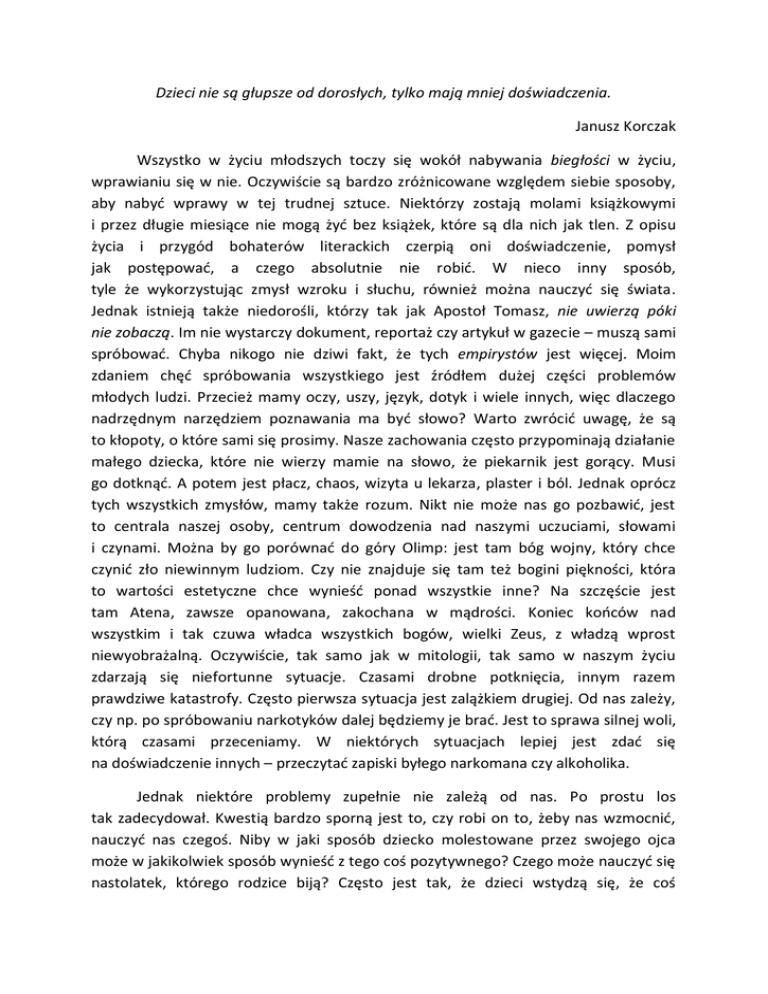 Dzieci nie są głupsze od dorosłych, tylko mają mniej doświadczenia. Janusz Korczak Wszystko w życiu młodszych toczy się wokół nabywania biegłości w życiu, wprawianiu się w nie. Oczywiście są bardzo zróżnicowane względem siebie sposoby, aby nabyć wprawy w tej trudnej sztuce. Niektórzy zostają molami książkowymi i przez długie miesiące nie mogą żyć bez książek, które są dla nich jak tlen. Z opisu życia i przygód bohaterów literackich czerpią oni doświadczenie, pomysł jak postępować, a czego absolutnie nie robić. W nieco inny sposób, tyle że wykorzystując zmysł wzroku i słuchu, również można nauczyć się świata. Jednak istnieją także niedorośli, którzy tak jak Apostoł Tomasz, nie uwierzą póki nie zobaczą. Im nie wystarczy dokument, reportaż czy artykuł w gazecie – muszą sami spróbować. Chyba nikogo nie dziwi fakt, że tych empirystów jest więcej. Moim zdaniem chęć spróbowania wszystkiego jest źródłem dużej części problemów młodych ludzi. Przecież mamy oczy, uszy, język, dotyk i wiele innych, więc dlaczego nadrzędnym narzędziem poznawania ma być słowo? Warto zwrócić uwagę, że są to kłopoty, o które sami się prosimy. Nasze zachowania często przypominają działanie małego dziecka, które nie wierzy mamie na słowo, że piekarnik jest gorący. Musi go dotknąć. A potem jest płacz, chaos, wizyta u lekarza, plaster i ból. Jednak oprócz tych wszystkich zmysłów, mamy także rozum. Nikt nie może nas go pozbawić, jest to centrala naszej osoby, centrum dowodzenia nad naszymi uczuciami, słowami i czynami. Można by go porównać do góry Olimp: jest tam bóg wojny, który chce czynić zło niewinnym ludziom. Czy nie znajduje się tam też bogini piękności, która to wartości estetyczne chce wynieść ponad wszystkie inne? Na szczęście jest tam Atena, zawsze opanowana, zakochana w mądrości. Koniec końców nad wszystkim i tak czuwa władca wszystkich bogów, wielki Zeus, z władzą wprost niewyobrażalną. Oczywiście, tak samo jak w mitologii, tak samo w naszym życiu zdarzają się niefortunne sytuacje. Czasami drobne potknięcia, innym razem prawdziwe katastrofy. Często pierwsza sytuacja jest zalążkiem drugiej. Od nas zależy, czy np. po spróbowaniu narkotyków dalej będziemy je brać. Jest to sprawa silnej woli, którą czasami przeceniamy. W niektórych sytuacjach lepiej jest zdać się na doświadczenie innych – przeczytać zapiski byłego narkomana czy alkoholika. Jednak niektóre problemy zupełnie nie zależą od nas. Po prostu los tak zadecydował. Kwestią bardzo sporną jest to, czy robi on to, żeby nas wzmocnić, nauczyć nas czegoś. Niby w jaki sposób dziecko molestowane przez swojego ojca może w jakikolwiek sposób wynieść z tego coś pozytywnego? Czego może nauczyć się nastolatek, którego rodzice biją? Często jest tak, że dzieci wstydzą się, że coś w ich domu jest nie tak. Nie chcą, żeby ktokolwiek się dowiedział, bo sąsiedzi, szkoła, ogólnie środowisko będzie gadało: Patrz, to ten, co ma ojca alkoholika, Jej, ale Ania ma siniaki na rękach, słyszałam, że matka ją bije. Chociaż niektórzy, a nawet większość z nich już wcześniej wiedziało o problemie, pozostawiali na niego ślepi. Dlaczego nie reagowali? Wszystko, co robili, to plotkowali, nie chcieli wtykać nosa w nie swoje sprawy. Często dzieci szukają pomocy, ale dorośli udają, że nie ma problemu. Znana mi osoba wychowywała się w patologicznej rodzinie. Jej ojciec po wypiciu alkoholu stawał się agresywny. Gdy uderzył ją w twarz, bała się wrócić do domu. Udała się po pomoc do swojej ciotki. Ta powiedziała jej, że było się schylić. Przyznam szczerze, że nie wiem, jak bym zareagowała na takie słowa. Może zamarłabym, zaczęłabym płakać z bezsilności, albo znienawidziłabym cały świat i jego Stworzyciela za to, że pozwala, żeby coś takiego działo się na padole ludzkim. Więcej jest sytuacji, gdy dorośli chcą negować problem. W książce W sidłach anoreksji Heidi Hassenmuller, gdy autorka wyjawia swojej mamie, że prawdopodobnie choruje na anoreksję, ta mocno zaprzecza. Nie chce nawet dopuścić do siebie myśli, że jej córka jest chora. Oczywiście najłatwiej jest zamknąć oczy i udawać, że problemu nie ma. Ale przecież każdy z tych ludzi, którzy nie odpowiedzieli na wołanie o pomoc, mogli być w takiej samej sytuacji. Tam, gdzie dzieje się krzywda dziecku, kiedy nie radzi sobie ono z problemami, potrzebna jest pomoc wszystkich, surowo zabronione jest wytykanie palcami. Przecież każdy ma jakieś utrapienia, jedni większe, drudzy większe. Naturalnym zachowaniem każdego z nas jest chęć pomocy. Jeżeli ktoś nie odczuwa takiej potrzeby, nie można go nazwać w pełni człowiekiem. Słysząc hasło „problemy młodzieży” myślimy przede wszystkim o nałogach, uzależnieniach, narkotykach, alkoholu itp.. Ponieważ trudno jest pisać o problemach, które mnie nie dotyczą, teraz chciałabym poruszyć inny, bliższy mi kłopot. W każdej szkole jest pewna grupa młodzieży, ogólnie określana jako „mądra”. Ponieważ wykazuje ona wysokie ambicje, radzi sobie dobrze ze wszystkimi przedmiotami w szkole, jest niejako zmuszana do udziału we wszelkiej maści konkursach. Nietrudnym do zauważenia jest fakt, że rozpraszając swoją uwagę na wiele czynności, nie wykonamy doskonale ani jednej. Młodzież ma ambicje, ale nauczyciele często nie dają się im skupić na rozwijaniu jednej specjalności. Bo jak nie odmówić np. Pani od matematyki wzięcia udziału w prostym konkursie? Kolejnym, zupełnie odwrotnym problemem jest niedocenianie uczniów, którzy za pozór wydają się głupsi. Kto jak kto, ale pracownicy oświaty, z których przecież bierzemy przykład, nie powinni oceniać ludzi po pozorach. Ile razy w klasie do wykonania jakiegoś zadania zgłaszały się dwie osoby, a nauczyciel wybierał tą mądrzejszą? Ści