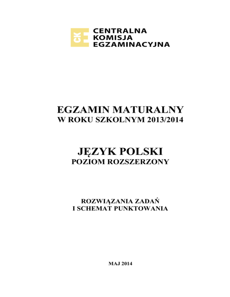EGZAMIN MATURALNY W ROKU SZKOLNYM 2013/2014 JĘZYK POLSKI POZIOM ROZSZERZONY ROZWIĄZANIA ZADAŃ I SCHEMAT PUNKTOWANIA MAJ 2014 2 Egzamin maturalny z języka polskiego Rozwiązania zadań i schemat punktowania – poziom rozszerzony Tworzenie informacji Napisanie własnego tekstu w związku z tekstem literackim zamieszczonym w arkuszu. Temat 1. Literackie obrazy miłości i sposoby ich kreowania we fragmentach Don Kichota z La Manchy Miguela de Cervantesa Saavedry oraz Romea i Julii Williama Szekspira. 1. Zasada zestawienia tekstów, np.: 0-3 a) fragmenty z rożnych gatunkowo/rodzajowo utworów, b) tematyka niezwykłej miłości, c) samotny zakochany i para kochanków, d) wyznania miłosne (monolog i dialog). Obrazy miłości 2. Bohaterowie w Don Kichocie, np.: 0-2 a) tradycja i konwencja średniowiecznych pieśni miłosnych / pieśni pasterskich / ksiąg rycerskich. b) naśladowani (podziwiani) w kręgach kultury dwornej, c) ukazani zgodnie z kodeksem rycerskim (zachowania i wartości). 3. Bohaterowie w Romeo i Julii, np.: a) przedstawiciele zwaśnionych rodów szlacheckich, b) pod osłoną nocy wyznają miłość, c) ofiary wrogości – w rodzinie i wśród przyjaciół. 0-2 4. Miłość w Don Kichocie, np.: a) wymyślona (manifestowana), b) tragiczna, (zabiera spokój, przynosi cierpienie), c) efekt obłędu, d) wyznanie w monologu, e) poczucie opuszczenia/oddalenia, f) negatywne emocje (np.: zazdrość), g) bezgraniczna. 0-3 5. Miłość w Romeo i Julii, np.: a) prawdziwa (ukrywana), b) spełniona, c) tragiczna (zabiera życie), d) skazana na niepowodzenie (przeznaczenie), e) miłosna rozmowa, f) bliskość ducha i ciała, g) nieskończona. 6. Sposób ukazania miłości w Don Kichocie, np.: a) miłość na wzór tradycji rycerskiej (wykoncypowana), b) patos mówienia, c) egzaltacja odczuwania, d) motyw walki, zmagania z uczuciem, e) obrazowanie wanitatywne, f) bestiarium, g) rozszalałe żywioły, h) hiperbolizacja, 0-3 0-4 Egzamin maturalny z języka polskiego Rozwiązania zadań i schemat punktowania – poziom rozszerzony 3 i) użalanie się (rozpacz), j) apostroficzność. 7. Sposób ukazania miłości w Romeo i Julii, np.: a) miłość na pograniczu dorosłości (pierwsza/niewinna/autentyczna, nieuchronna), b) czułość, c) zmysłowość, d) kontrast, e) zapewnianie o wzajemności miłowania, f) metafory, g) romantyczny nastrój (gra słów, rola światła, h) afirmacja. 0-4 8. Konteksty, np.: 0-2 a) historycznoliteracki (np.: Pieśń nad pieśniami, romanse rycerskie, dramaty Szekspira), b) epoki (krytyka zachowań, znaczenie autorów), c) kulturowy (symboliczność postaci). 9. Podsumowanie 0-3 pełne: dostrzeżenie, że miłość w obu utworach jest zjawiskiem potężnym i niezwykłym, ma swoje ograniczenia (np.: wyobraźni i relacji do innych). Dla bohatera Don Kichota stanowiła udręczenie z powodu poczucia osamotnienia, nieodwzajemnienia i niedostępności wybranki serca. Natomiast dla Romea i Julii była przeznaczeniem i autentyczna. Została ukazana jako cierpienie lub spełnienie. (3) częściowe: dostrzeżenie, że miłość w obu utworach jest zjawiskiem potężnym i niezwykłym, ma swoje ograniczenia (np.: wyobraźni i relacji do innych). Została ukazana jako cierpienie lub spełnienie. (2) próba podsumowania: dostrzeżenie, że miłość w obu utworach jest zjawiskiem potężnym i niezwykłym, ma swoje ograniczenia (np.: wyobraźni i relacji do innych). (1) 4 Egzamin maturalny z języka polskiego Rozwiązania zadań i schemat punktowania – poziom rozszerzony Temat 2. Porównaj obrazy miasta przedstawione we fragmentach opowiadania Sierpień Brunona Schulza i powieści Zły Leopolda Tyrmanda. Omów sposoby ukazania przestrzeni i funkcje, jakie ona pełni w obu utworach. I. 1. a) b) c) 2. a) b) c) d) e) f) ROZWINIĘCIE TEMATU (można uzyskać maksymalnie 26 punktów) Punktacja Zasada zestawienia tekstów, np.: 0-2 niezwykłość obrazu miasta – w każdym tekście uzyskana innymi środkami, pierwszoosobowa narracja (konwencja wspomnienia), różnorodne odwołania kulturowe. Sierpień Obraz miasta, np.: 0-4 anonimowe małe miasto, czas: poza historią (letnie świąteczne popołudnie – jedno z wielu powtarzających się w sierpniowe soboty), pozornie typowe składniki obrazu (dziecko na spacerze z matką, przechodnie, bawiący się chłopcy, rynek, drzewa, domy), piękno (mimo brzydoty pojedynczych elementów), miasto jako miejsce świętych tajemnic, drzewa, domy, okna , balkony jako istoty żyjące własnym, niezależnym od człowieka życiem (rynek jest pusty, ale nie martwy). 3. Sposoby ukazania przestrzeni i jej funkcje w utworze, np.: 0-6 a) opowiadanie o spacerze, b) narrator – ukazujący świat z punktu widzenia dziecka, ale mówiący językiem dorosłego, c) kreacjonizm / oniryzm, d) symbolika, e) motywy biblijne służące sakralizacji świata przedstawionego, f) nawiązania kulturowe służące mityzacji świata przedstawionego, g) rola motywu słońca, h) kontrasty (upał – chłód, światło – cień), i) liryzacja prozy, j) zmysłowe metafory, k) personifikacja drzew, domów, okien, balkonów, l) porównania nadające elementom świata przedstawionego cechy dzieł sztuki, m) plastyczność – liczne epitety nazywające wrażenia zmysłowe (kolory, zapachy, wrażenia dotykowe), n) otwarta przestrzeń jako symbol przekroczenia granicy rzeczywistości i marzenia. Zły 4. Obraz miasta, np.: 0-5 a) konkretne wielkie miasto (Warszawa), b) czas: historyczny (dzieje miasta od okresu przedwojennego po powstanie warszawskie), c) miasto ukazane poprzez jeden charakterystyczny element (bramy), d) brak klasycznego piękna (śmieszne, pretensjonalne, pseudorenesansowe ozdoby, nieprzyzwoite napisy), e) bramy jako tło i świadek indywidualnych doświadczeń (dorastania narratora), f) bramy jako tło i świadek doświadczeń zbiorowości (dziecięcych zabaw, ale i zbrodni), g) bramy jako sprzymierzeńcy walczących w powstaniu. Egzamin maturalny z języka