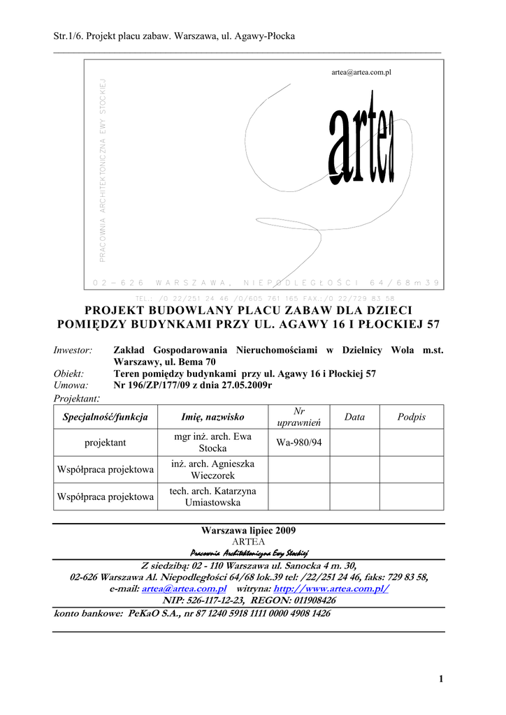 Str.1/6. Projekt placu zabaw. Warszawa, ul. Agawy-Płocka ____________________________________________________________________________ PRACOWNIA ARCHITEKTONICZNA EWY STOCKIEJ [email protected] 0 2 - 6 2 6 W A R S Z A W A , N I E P O D L E G Ł O Ś C I 6 4 / 6 8 m 3 9 TEL. : /0 2 2/ 25 1 2 4 46 / 0/ 60 5 7 61 16 5 FA X. :/ 0 22 /7 2 9 8 3 58 PROJEKT BUDOWLANY PLACU ZABAW DLA DZIECI POMIĘDZY BUDYNKAMI PRZY UL. AGAWY 16 I PŁOCKIEJ 57 Inwestor: Obiekt: Umowa: Projektant: Zakład Gospodarowania Nieruchomościami w Dzielnicy Wola m.st. Warszawy, ul. Bema 70 Teren pomiędzy budynkami przy ul. Agawy 16 i Płockiej 57 Nr 196/ZP/177/09 z dnia 27.05.2009r Specjalność/funkcja Imię, nazwisko Nr uprawnień projektant mgr inŜ. arch. Ewa Stocka Wa-980/94 Współpraca projektowa inŜ. arch. Agnieszka Wieczorek Współpraca projektowa tech. arch. Katarzyna Umiastowska Data Podpis Warszawa lipiec 2009 ARTEA Pracownia Architektoniczna Ewy Stockiej Z siedzibą: 02 - 110 Warszawa ul. Sanocka 4 m. 30, 02-626 Warszawa Al. Niepodległości 64/68 lok.39 tel: /22/251 24 46, faks: 729 83 58, e-mail: [email protected] witryna: http://www.artea.com.pl/ NIP: 526-117-12-23, REGON: 011908426 konto bankowe: PeKaO S.A., nr 87 1240 5918 1111 0000 4908 1426 1 Str.2/6. Projekt placu zabaw. Warszawa, ul. Agawy-Płocka ____________________________________________________________________________ ZAWARTOŚĆ OPRACOWANIA OPIS TECHNICZNY UPRAWNIENIA PROJEKTOWE DOKUMENTACJA FOTOGRAFICZNA CZĘŚĆ RYSUNKOWA A-1. – Projekt zagospodarowania terenu – plac zabaw – skala 1:250 A-2. – Projekt ogrodzenia – skala 1:250 A-3. – Projekt ogrodzenia typ A - zestawienie – skala 1:50 A-4. – Projekt ogrodzenia typ B- piłkochwyty - zestawienie – skala 1:50 A-5. – Nawierzchnie – skala 1:10 Elementy placu zabaw OPIS TECHNICZNY PROJEKTU ROŚLINNOŚCI Z-1. – Projekt zieleni – skala 1:250 2 Str.3/6. Projekt placu zabaw. Warszawa, ul. Agawy-Płocka ____________________________________________________________________________ OPIS TECHNICZNY DO PROJEKTU PLACU ZABAW PLAN ZAGOSPODAROWANIA PROJEKT BUDOWLANY I. Dane ogólne 1.1 Przedmiot opracowania Przedmiotem opracowania jest projekt placu zabaw pomiędzy budynkami przy ul. Agawy 16 i Płockiej 57 w Warszawie I. 2. Podstawa opracowania 2.1. Umowa nr 196/ZP/177/09 z dnia 27.05.2009r zawarta z Inwestorem – Zakładem Gospodarowania Nieruchomościami w Dzielnicy Wola m.st. Warszawy. 2.2. Uzgodniona z Inwestorem koncepcja rozwiązań technologicznych i przestrzennych 2.3. Mapa sytuacyjno-wysokościowa w skali 1:500. 2.4.Wizja lokalna. 2.5. Inwentaryzacja drzewostanu 2.6. Materiały dodatkowe i informacyjne – wywiad środowiskowy, materiały archiwalne. 1.3. Inwestor, uŜytkownik Teren jest terenem komunalnym i znajduje się we władaniu m. st. Warszawy. Zarządcą terenu jest Zakład Gospodarowania Nieruchomościami w Dzielnicy Wola m.st. Warszawy. Powierzchnia terenu w granicach opracowania wynosi 621 m². 1.4. Lokalizacja obiektu Teren będący przedmiotem niniejszego opracowania jest terenem zielonym, niezabudowanym i znajduje się pomiędzy budynkami wielorodzinnymi połoŜonymi przy ul. Agawy 16 - Płockiej 57 w Warszawie. 1.5.Zakres opracowania Przedmiotem opracowania jest projekt placu zabaw – terenu rekreacyjnego dla dzieci starszych w wieku 7 ÷12 lat, obejmujący modernizację i wymianę nawierzchni, wykonanie boiska dla mini-koszykówki, wykonanie syntetycznych nawierzchni bezpiecznych, projekt zieleni oraz mała architekturę i ogrodzenie wraz z piłkochwytami. II. Opis terenu Teren przeznaczony pod realizację w/w załoŜeń inwestycyjnych połoŜony jest wśród osiedlowej zabudowy mieszkaniowej. 3 Str.4/6. Projekt placu zabaw. Warszawa, ul. Agawy-Płocka ____________________________________________________________________________ Skala budynków i charakter architektury jest bardzo niejednorodna i waha się od IV do IX kondygnacji. W bezpośrednim sąsiedztwie projektowanego placu zabaw jest zlokalizowany zespół garaŜy indywidualnych. Teren posiada moŜliwość dojazdu kołowego od strony ul. Agawy oraz dojścia pieszego od strony istniejącego chodnika. Teren jest trawiasty, istniejące zadrzewienie zostało opisane w rozdziale projektu zieleni. Na terenie obecnie zlokalizowana jest piaskownica betonowa oraz utwardzone dojście do niej. III. Wnioski - Podstawy do załoŜeń projektowych 3.1. ZałoŜenia projektowe - wyznaczenie wygrodzonego terenu placu zabaw dla dzieci starszych ( 7 ÷ 12 lat) 3.2. Zakres przewidywanych prac realizacyjnych - realizacja wygrodzenia terenu placu zabaw realizacja nowego placyku zabaw dla dzieci z montaŜem zabawek; renowacja trawników i nasadzenia nowej zieleni średniej – patrz projekt zieleni wyposaŜenie terenu placu zabaw w stałe urządzenia - ławki, śmietniczki. IV. Elementy projektowane 4.1. Opis ogólny Projektuje się wygrodzenie terenu i montaŜ urządzeń zabawowych wg wykazu oraz pokrycie powierzchni placyku nawierzchnią bezpieczną z wielowarstwowego granulatu gumowego w połączeniu z nawierzchnią Ŝwirową + obrzeŜa elastyczne (gumowe). Alternatywnie dopuszcza się wykonanie tylko nawierzchni Ŝwirowej (poza boiskiem do minikoszykówki) o uziarnieniu 3-10mm + obrzeŜa elastyczne (gumowe) spełniającej wymogi bezpieczeństwa i higieny. Ze względu na bliskość zespołu garaŜowego, zaprojektowano nasadzenia zieleni średniej wzdłuŜ ściany garaŜy. 4.2. Ogrodzenie Ogrodzenie terenu stalowe ocynkowane - wzór wg załącznika, wysokość 110 cm, słupki w rozstawie 200 cm wg rys. projektu mocowane wbijanymi kotwami ze stali galwanizowanej + słupki podporowe na załamaniach ogrodzenia. Furtka – jednoskrzydłowa szer. 150 cm, wyposaŜone w automatyczny zamykacz. Brama – dwuskrzydłowa szer. 300 cm Piłkochwyty z sieci nylonowej mocowanej na zatrzaskach na przedłuŜonych do 4,00 m słupach ogrodzeniowych. Uwaga! Ze względu na moŜliwość opadania sieci po mocnych uderzeniach piłki wykonać podw