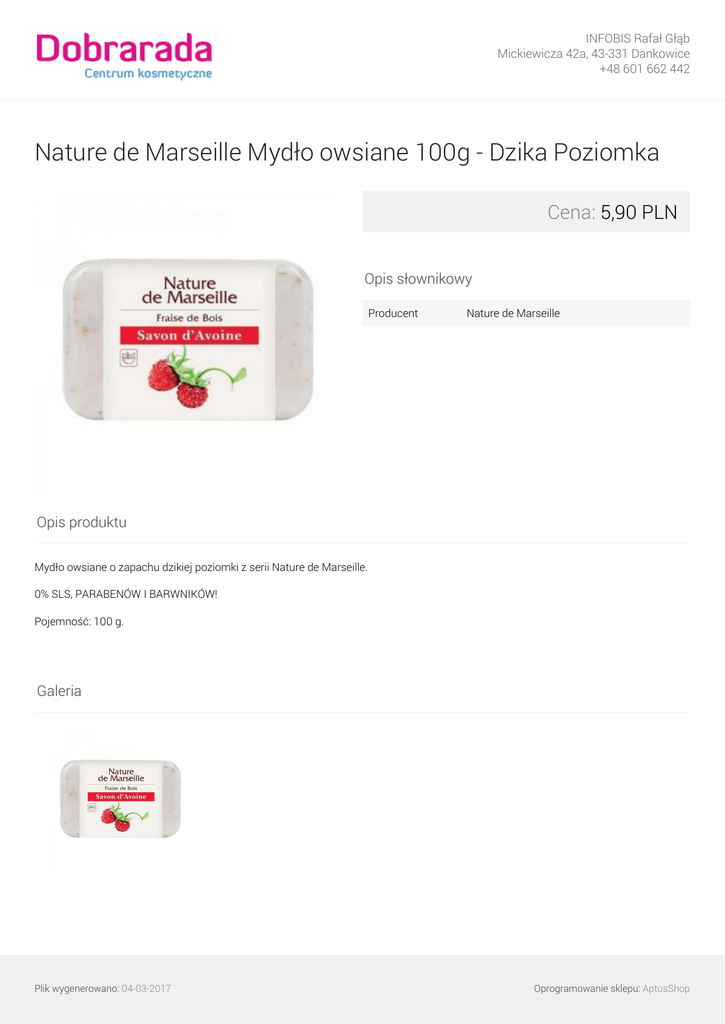 INFOBIS Rafał Głąb Mickiewicza 42a, 43-331 Dankowice +48 601 662 442 Nature de Marseille Mydło owsiane 100g - Dzika Poziomka Cena: 5,90 PLN Opis słownikowy Producent Nature de Marseille Opis produktu Mydło owsiane o zapachu dzikiej poziomki z serii Nature de Marseille. 0% SLS, PARABENÓW I BARWNIKÓW! Pojemność: 100 g. Galeria Plik wygenerowano: 04-03-2017 Powered by TCPDF (www.tcpdf.org) Oprogramowanie sklepu: AptusShop