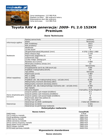 Cena katalogowa: 112 900 PLN Dopłata za kolor: Nie wybrano koloru Wyposażenie dod.:Nie wybrano Cena końcowa: 112 900 PLN Toyota RAV 4 generacja: 2009- FL 2.0 152KM Premium Dane Techniczne Rodzaj samochodu Klasa Informacje ogólne Rok modelowy Rok produkcji Nadwozie Liczba drzwi Długość/Szerokość/Wysokość [mm] Masa własna [kg] Nadwozie Pojemność bagażnika [l] Ładowność [kg] Liczba miejsc siedzących Rozstaw osi w [mm] Minimalna średnica skrętu [m] Rodzaj silnika Przyspieszenie (od 0 do 100 km/h [s]) Prędkość maksymalna [km/h] Typ paliwa Pojemność [cm3] Moc w [KM] Układ napędowy Moc w [kW] Prędkość obr. dla maksymalnej mocy - od [obr./min] Maksymalny moment obrotowy [Nm] Maksymalny moment obrotowy [kGm] Prędkość obr. dla maksymalnego momentu obr - od [obr./min] Typ napędu Skrzynia biegów Zużycie paliwa cykl miejski [l/100km] Zużycie paliwa cykl mieszany [l/100km] Dane eksploatacyjne Zużycie paliwa cykl pozamiejski [l/100km] benzyna Pojemność zbiornika paliwa [l] Emisja CO2 [g/km] Gwarancja na silnik i podzespoły Gwarancja Gwarancja na lakier Gwarancja na perforację nadwozia osobowy Terenowy 2013 2013 SUV 5 4 570/ 1 845/ 1 660 1 570 547 540 5 2 660 11 benzynowy 9.90 185 benzyna 1 987 152 111 6 200 195 20 4 000 4x4 manualna, liczba biegów 6 9.3 7.2 6 60 167 3 lata lub 100000 km 3 lata 12 lat Kolorystyka nadwozia Nazwa koloru Cena(PLN) 0 PLN 2900 PLN 2900 PLN 2900 PLN 2900 PLN 2900 PLN 2900 PLN 2900 PLN 4400 PLN [040] biały [1F7] srebrny metalik [1G3] grafitowy metalik [209] czarny metalik [3R3] czerwony metalik [4T3] ciemny brązowy metalik [6V4] zieleń mchu metalik [8V5] indygo metalik [070] biały perłowy metalik Wyposażenie standardowe Nazwa elementu ABS, EBD, BA aktywne zagłówki automatyczna klimatyzacja dwustrefowa Bluetooth boczne kurtyny powietrzne boczne panele pokryte skórą centralny zamek sterowany pilotem chromowana listwa okienna chromowana listwa przedniego zderzaka czujnik ciśnienia powietrza w oponach czujniki deszczu (automatyczne wycieraczki) czujniki zmierzchu (automatyczne światła) deska rozdzielcza pokryta skórą elektrochromatyczne lusterko wewnętrzne elektryczna regulacja szyb przednich i tylnych elektrycznie regulowane i podgrzewane lusterka zewnętrzne ISOFIX na skrajnych tylnych miejscach kamera cofania (na ekranie 6,1") kierownica wielofunkcyjna kierunkowskazy w lusterkach kieszenie w oparciach przednich foteli koła 225/65 R17, felgi aluminiowe koło dojazdowe komputer pokładowy lakierowane klamki i lusterka zewnętrzne lusterka w osłonach przeciwsłonecznych podgrzewane fotele przednie podgrzewanie wycieraczek przedniej szyby poduszka kolanowa kierowcy przednie i boczne poduszki powietrzne kierowcy i pasażera przednie lampy przeciwmgielne regulacja kierownicy w pionie i w poziomie rozkładane oparcie tylnej kanapy w proporcji 60:40 skórzana kierownica i gałka dźwigni zmiany biegów sportowe fotele spryskiwacze reflektorów sygnalizacja niezapiętych pasów bezpieczeństwa system multimedialny Toyota Touch, dotykowy ekran 6,1", MP3, WMA, 6 głośników system opóźnionego wyłączania świateł po zgaszeniu silnika "Follow me home" system stabilizacji toru jazdy (VSC+) i kontrola trakcji (TRC) system wspomagający pokonywanie podjazdu (HAC) światła do jazdy dziennej typu LED tapicerka materiałowa tempomat tylny spoiler dachowy wspomaganie kierownicy zabezpieczenie tylnych drzwi przed otwarciem przez dzieci zagłówki z regulacją wysokości złącze Aux-In do podłączenia urządzeń zewnętrznych i port USB Wyposażenie dodatkowe Lista wyposażenia dodatkowego Cena lampy ksenonowe 3900 PLN Pakiet BIS Gwarancja serwisowa - rok lub 2 lata dodatkowego ubezpieczenia kosztów naprawy 899 PLN pojazdu Pakiet Executive - lampy ksenonowe, 18" felgi aluminiowe, przyciemniane tylne szyby, 9900 PLN elektrycznie unoszone drzwi bagażnika, elektrycznie składane lusterka zewnętrzne relingi dachowe 1700 PLN system multimedialny Toyota Touch&Go (nawigacja) 3200 PLN