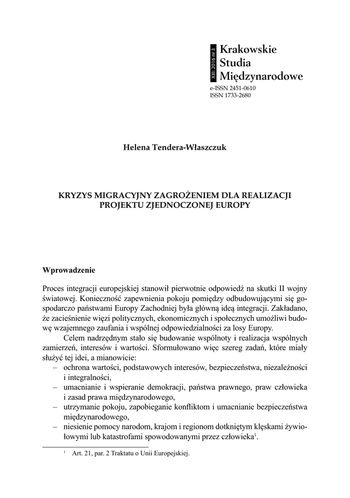 XIII: 2016 nr 3 e-ISSN 2451-0610 ISSN 1733-2680 Helena Tendera-Właszczuk KRYZYS MIGRACYJNY ZAGROŻENIEM DLA REALIZACJI PROJEKTU ZJEDNOCZONEJ EUROPY Wprowadzenie Proces integracji europejskiej stanowił pierwotnie odpowiedź na skutki II wojny światowej. Konieczność zapewnienia pokoju pomiędzy odbudowującymi się gospodarczo państwami Europy Zachodniej była główną ideą integracji. Zakładano, że zacieśnienie więzi politycznych, ekonomicznych i społecznych umożliwi budowę wzajemnego zaufania i wspólnej odpowiedzialności za losy Europy. Celem nadrzędnym stało się budowanie wspólnoty i realizacja wspólnych zamierzeń, interesów i wartości. Sformułowano więc szereg zadań, które miały służyć tej idei, a mianowicie: – ochrona wartości, podstawowych interesów, bezpieczeństwa, niezależności i integralności, – umacnianie i wspieranie demokracji, państwa prawnego, praw człowieka i zasad prawa międzynarodowego, – utrzymanie pokoju, zapobieganie konfliktom i umacnianie bezpieczeństwa międzynarodowego, – niesienie pomocy narodom, krajom i regionom dotkniętym klęskami żywiołowymi lub katastrofami spowodowanymi przez człowieka1. 1 Art. 21, par. 2 Traktatu o Unii Europejskiej. 10 HELENA TENDERA-WŁASZCZUK Jednym z najważniejszych elementów projektu europejskiego, który świadczy o jego zdolności do łączenia ze sobą narodów ponad granicami ich państw, są wspólne wartości. Próbą dla realizacji tych wartości może bez wątpienia stać się masowy, niekontrolowany napływ imigrantów i uchodźców z krajów Bliskiego Wschodu, Turcji i Afryki, szukających możliwości zatrudnienia, lepszego życia czy schronienia przed wojną. Istnieje obawa, że obecna fala imigrantów i uchodźców doprowadzi do kryzysu w europejskim społeczeństwie, którego część nie chce bądź nie potrafi zaakceptować nowo przybyłych z powodu odmienności wyznawanych przez nich zasad i wartości. Z kolei przymusowe narzucenie imigrantom i uchodźcom europejskich wartości, czyli czegoś nowego i nieznanego, może wywołać strach i niezadowolenie, a nawet nienawiść. Nie należy również zapominać o najpoważniejszym zagrożeniu, jakie ów napływ niesie za sobą – terroryzmie, w konsekwencji którego spada poziom bezpieczeństwa i zaufania wobec imigrantów i uchodźców. Istnieje realna obawa, że wśród napływającej masowo ludności zza granicy mogą być specjalnie wyszkoleni terroryści, którzy zostali wysłani z misją dokonania zamachów w Europie. Unia Europejska jest zaś nie tylko wspólnym rynkiem i sojuszem państw, ale też wspólnotą wartości politycznych i etycznych. Rodzi się więc pytanie, czy masowy i niekontrolowany napływ imigrantów i uchodźców nie zagraża realizacji wspólnych wartości, a co za tym idzie – realizacji projektu europejskiego. Próba odpowiedzi na to pytanie jest podstawowym celem niniejszego artykułu. Teoretyczne aspekty uchodźctwa Analiza literatury przedmiotowej wyraźnie wskazuje na brak teoretycznych podstaw w studiach nad uchodźctwem. Istniejące teorie migracji, zarówno ekonomiczne, jak i socjologiczne, jedynie wyrywkowo ujmują problem uchodźctwa, analizując jego specyfikę jako jeden z czynników wpływających na podjecie decyzji o opuszczeniu własnego kraju. Używa się tu często zamiennie terminów: migracje polityczne i migracje przymusowe, co nie odzwierciedla specyfiki tego zjawiska we współczesnym świecie globalnych konfliktów i zagrożeń. Istnieje więc potrzeba tworzenia nowych teorii opisujących to zjawisko2. Interesujący przegląd literatury przedmiotu prezentuje Elżbieta Czapka3. Przytacza ona poglądy amerykańskiego socjologa Anthony’ego H. Richmonda, który uważa, że ludzie migrują albo w oczekiwaniu na zmianę swojej sytuacji, albo z powodu zmieniających się warunków w swoim kraju, albo w celu ochrony 2 H. Kelm, H. Tendera-Właszczuk, Analiza sytuacji uchodźców w Polsce w aspekcie realizacji wspólnej polityki azylowej Unii Europejskiej, „Zeszyty Naukowe Uniwersytetu Ekonomicznego w Krakowie” 2011, nr 852, s. 63–80. 3 E. Czapka, Stereotyp uchodźcy, Olsztyn 2006, s. 36–45. KRYZYS MIGRACYJNY ZAGROŻENIEM DLA REALIZACJI PROJEKTU... 11 lub zachowania tego, co posiadają4. Z kolei W. Petersen wyróżnia 5 rodzajów migracji: prymitywną, przymusową, przymuszoną, dobrowolną i masową. Zgodnie z tą klasyfikacją, uchodźctwo zaliczyć można do migracji przymuszonej. E. Czapka wskazuje jednak, że współcześnie problem uchodźctwa zdeterminowany jest zarówno politycznie jak i ekonomicznie, a nie jak uprzednio, jedynie sytuacją polityczną w kraju pochodzenia. Tak więc osoby poszukujące azylu lub uchodźcy to ci, którzy opuścili swoje kraje, aby uniknąć skutków katastrof spowodowanych przez człowieka bądź przyrodę, prześladowania lub konfliktu5. Istniej bardzo liczne pozycje literatury klasyfikujące migracje ze względu na różne kryteria6, pominiemy więc w niniejszym artykule te kwestie, skupiając się jedynie na jednym kryterium, a mianowicie na kryterium dobrowolności, które jest niezwykle istotne z punktu widzenia przeprowadzanej analizy. Ze względu na kryterium dobrowolności, możemy wyróżnić migracje dobrowolne i przymusowe. Migracje przymusowe do niedawna utożsamiane były jedynie z występowaniem niesprzyjających czynników ekonomicznych i demograficznych (złe warunki życia, przeludnienie) lub politycznych (wojny, konflikty, prześladowania) w kraju pochodzenia. Ostatnio coraz częściej wymienianym wśród przyczyn emigracji czynnikiem jest czynnik ekologiczny, a mianowicie zmiany klimatyczne, wyczerpywanie się zasobów naturalnych, w tym głównie wody, i pustynnienie terenów dawniej uprawnych. Poważnym problemem jest również zalewanie przez powodzie terenów gęsto zaludnionych czy podnoszenie się poziomu wód oceanów na skutek wzrostu temperatury na naszej planecie. Migracje ekonomiczne mają zazwyc