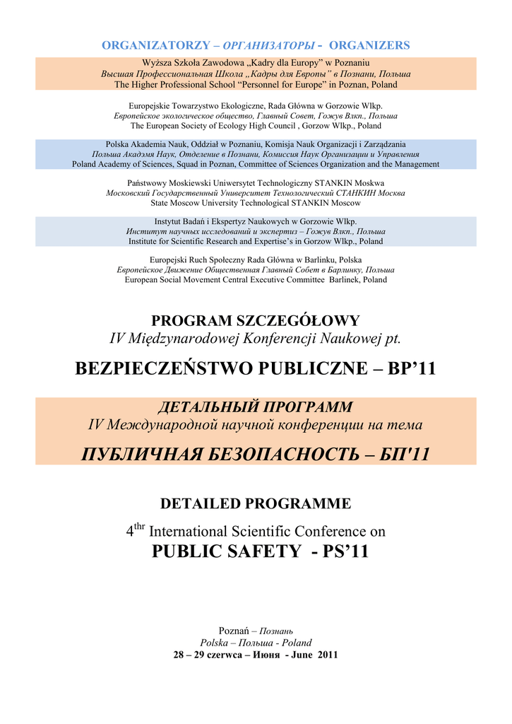 ORGANIZATORZY – ОРГАНИЗАТОРЫ - ORGANIZERS Wyższa Szkoła Zawodowa „Kadry dla Europy” w Poznaniu Высшая Профессиональная Школа „Кадры для Европы” в Познани, Польша The Higher Professional School “Personnel for Europe” in Poznan, Poland Europejskie Towarzystwo Ekologiczne, Rada Główna w Gorzowie Wlkp. Европейское экологическое общество, Главный Совет, Гожув Влкп., Польша The European Society of Ecology High Council , Gorzow Wlkp., Poland Polska Akademia Nauk, Oddział w Poznaniu, Komisja Nauk Organizacji i Zarządzania Польша Акадэмя Наук, Отделение в Познани, Комиссия Наук Организации и Управления Poland Academy of Sciences, Squad in Poznan, Committee of Sciences Organization and the Management Państwowy Moskiewski Uniwersytet Technologiczny STANKIN Moskwa Московский Государственный Университет Технологический СТАНКИН Москва State Moscow University Technological STANKIN Moscow Instytut Badań i Ekspertyz Naukowych w Gorzowie Wlkp. Институт научных исследований и экспертиз – Гожув Влкп., Польша Institute for Scientific Research and Expertise’s in Gorzow Wlkp., Poland Europejski Ruch Społeczny Rada Główna w Barlinku, Polska Европейское Движение Общественная Главный Собет в Барлинку, Польша European Social Movement Central Executive Committee Barlinek, Poland PROGRAM SZCZEGÓŁOWY IV Międzynarodowej Konferencji Naukowej pt. BEZPIECZEŃSTWO PUBLICZNE – BP’11 ДЕТАЛЬНЫЙ ПРОГРАММ IV Международной научной конференции на тема ПУБЛИЧНАЯ БЕЗОПАСНОСТЬ – БП'11 DETAILED PROGRAMME 4thr International Scientific Conference on PUBLIC SAFETY - PS’11 Poznań – Познань Polska – Польша - Poland 28 – 29 czerwca – Июня - June 2011 KOMITET NAUKOWY KONFERENCJI НАУЧНЫЙ КОМИТЕТ КОНФЕРЕНЦЙИ THE SCIENTIFIC COMMITTEE OF THE CONFERENCE Przewodniczący – Председатель – Chairman Tadeusz ZABOROWSKI - Polska, Польша, Poland [email protected] ; [email protected]; [email protected] Wiceprzewodniczący - Заместитель председателя - Vice-Chairman Walter B. ERICSON – USA, Adam GIEREK – Polska, Fang HAI-PING – Chiny, Gerard J. KECK – Francja, Werner RICHTER – Niemcy, Leonid SHVARTSBURG – Rosja Sekretarz Naukowy - Научный секретарь - Scientific Secretary Włodzimierz SEREBRIAKOW e-mail: [email protected] Sekretarz Organizacyjny - Организационный секретарь - Organizational secretary Maciej DZIKUĆ e-mail: [email protected] Członkowie – Члены - Members Józef ALESZCZYK – Polska, Igor ARIEFIEW – Rosja, Joseph D. BAGYARAJ – Indie, Zygmunt BAUMAN – Anglia, Zoja BEDNAREK – Polska, Przemysław BILIŃSKI – Polska, V.BUŁGAKOV – Ukraina, David CAHEN – Izrael, Tarik DAMRA – Palestyna, Alberto C. DIAS – Portugalia, Luis V. DIAZ MARTIN – Hiszpania, Mieczysław DUDEK – Polska, Mauro FELLI – Włochy, Jan F. FILIPSKA – Francja, Kohzaburo FUJIKAWA-YAMAMOTO – Japonia, Fernando GALEMBECK – Brazylia, Grażyna GRELOWSKA – Polska, Samir R. HAJARNIS – Szwecja, Wiesław HŁADKIEWICZ – Polska, Joao V. ISSLER – Brazylia, Zbigniew IZDEBSKI-Polska, Michael D. JACOBSON – Wielka Brytania, Andrzej JAGUSIEWICZ – Polska, Jozef JURKO – Słowacja, Jonathan KARN – Anglia, Heralampos KATSIKAS – Grecja, Igor KEFELI - Rosja, Wiesław KOZIARA – Polska, Gerardo LAMAS MÜLLER – Peru, Jos M. LAMERS – Holandia, Zdenek LAŚTUVKA – Czechy, Jan LUDWICKI – Polska, Chaudhory A. MAJID – Pakistan, Marian MALICKI – Polska, Anita Sui Woh MAK – Australia, Zygmunt MIERCZYK – Polska, Bogdan NOGALSKI – Polska, Alojzy Z. NOWAK – Polska, Leontin S. PETERFI – Rumunia, Tomasz POŁEĆ – Polska, Tatiana RONGIŃSKA – Polska, Michał STOSIK – Polska, Roman STRYJSKI – Polska, Stefan TRZCIELINSKI - Polska, Vladimir V. TUMALEV – Rosja, Stanisław URBAN – Polska, Marek WALCZAK – Polska, Wawrzyniec WAWRZYNIAK – Polska, Robert ZABOROWSKI – Polska, Maria ŻUK – Białoruś 2 PROGRAM SZCZEGÓŁOWY - ДЕТАЛЬНЫЙ ПРОГРАММ - DETAILED PROGRAMME 28.06.2011 r. 09,00 - Otwarcie konferencji - открытие конференции - openly conference I SESJA PLENARNA - ПЛЕНАРНАЯ СЕСИЯ - PLENARY SESSION ТРОФИМОВ Сергей В. 09,15 РОЛЬ РЕЛИГИИ В ПУБЛИЧНОЙ БЕЗОПАСНОСТИ ZABOROWSKI Tadeusz, STEFAŃCZYK Alicja 09,35 ZAGROŻENIE DLA ZARZĄDZANIA ORGANIZACJĄ WSKUTEK SYNDROMU TMS ШВАРЦБУРГ Лeонид Э. 09,55 АВТОМАТИЗАЦИЯ ОБЕСПЕЧЕНИЯ БЕЗОПАСНОСТИ ПРОИЗВОДСТВЕННОЙ СРЕДЫ MAMEDOV Agamali K. 10,15 СОБЫТИЯ НА БЛИЖНЕМ ВОСТОКЕ: УРОКИ СОЦИАЛЬНОГО РАЗВИТИЯ ZABOROWSKI Robert, ZABOROWSKI Tadeusz 10,35 OCENA KAPITAŁU LUDZKIEGO A BEZPIECZEŃSTWO ZARZĄDZANIA ORGANIZACJĄ БОНДАРЕВ Валерий 10,55 ТЕОРЕТИЧЕСКИЕ ОСНОВАНИЯ ИНВАЙРОНМЕНТАЛЬНОЙ БЕЗОПАСНОСТИ ZALESIŃSKI Zbigniew, ZABOROWSKI Tadeusz 11,15 OBLICZA WSPÓŁCZESNEGO BIOTERRORYZMU 11,35 Dyskusja - дискусия - discussion 11,50 Przerwa - перерыв - pause II SESJA PLENARNA - ПЛЕНАРНАЯ СЕСИЯ - PLENARY SESSION 12,05 ALESZCZYK Józef AGENCJA REZERW MATERIAŁOWYCH W SYSTEMIE RZECZOWYCH REZERW PAŃSTWOWYCH W POLSCE 12,20 JAŚKOWSKI Jerzy, OSIELSKA-LEŚNIKOWSKA Katarzyna, WAWRZYNIAK Wawrzyniec NOWE PODSTAWY OCENY SKAŻENIA ŚRODOWISKA, PROMIENIOWANIEM JONIZUJĄCYM W ZWIĄZKU Z WEJŚCIEM POLSKI 