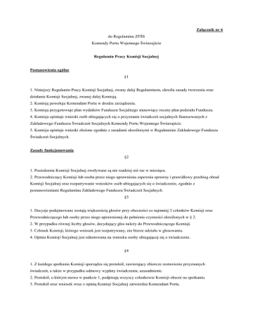 Załącznik nr 6 do Regulaminu ZFŚS Komendy Portu Wojennego Świnoujście Regulamin Pracy Komisji Socjalnej Postanowienia ogólne §1 1. Niniejszy Regulamin Pracy Komisji Socjalnej, zwany dalej Regulaminem, określa zasady tworzenia oraz działania Komisji Socjalnej, zwanej dalej Komisją. 2. Komisję powołuje Komendant Portu w drodze zarządzenia. 3. Komisja przygotowuje plan wydatków Funduszu Socjalnego stanowiący roczny plan podziału Funduszu. 4. Komisja opiniuje wnioski osób ubiegających się o przyznanie świadczeń socjalnych finansowanych z Zakładowego Funduszu Świadczeń Socjalnych Komendy Portu Wojennego Świnoujście. 5. Komisja opiniuje wnioski złoŜone zgodnie z zasadami określonymi w Regulaminie Zakładowego Funduszu Świadczeń Socjalnych. Zasady funkcjonowania §2 1. Posiedzenia Komisji Socjalnej zwoływane są nie rzadziej niŜ raz w miesiącu. 2. Przewodniczący Komisji lub osoba przez niego uprawniona zapewnia sprawny i prawidłowy przebieg obrad Komisji Socjalnej oraz rozpatrywanie wniosków osób ubiegających się o świadczenie, zgodnie z postanowieniami Regulaminu Zakładowego Funduszu Świadczeń Socjalnych. §3 1. Decyzje podejmowane zostają większością głosów przy obecności co najmniej 3 członków Komisji oraz Przewodniczącego lub osoby przez niego uprawnionej do pełnienia czynności określonych w § 2. 2. W przypadku równej liczby głosów, decydujący głos naleŜy do Przewodniczącego Komisji. 3. Członek Komisji, którego wniosek jest rozpatrywany, nie bierze udziału w głosowaniu. 4. Opinia Komisji Socjalnej jest odnotowana na wniosku osoby ubiegającej się o świadczenie. §4 1. Z kaŜdego spotkania Komisji sporządza się protokół, zawierający zbiorcze zestawienie przyznanych świadczeń, a takŜe w przypadku odmowy wypłaty świadczenia, uzasadnienie. 2. Protokół, o którym mowa w punkcie 1, podpisują wszyscy członkowie Komisji obecni na spotkaniu. 3. Protokół oraz wniosek wraz z opinią Komisji Socjalnej zatwierdza Komendant Portu. §5 1. Komisja Socjalna sporządza Plan wydatków Funduszu Socjalnego do końca marca kaŜdego roku. 2. Plan stanowi roczny podział Funduszu z wyszczególnieniem kwot przeznaczonych na poszczególne rodzaje świadczeń. 3. Plan wydatków, o którym mowa w pkt 1 zatwierdza Komendant Portu. 4. W terminie do końca stycznia kaŜdego roku, Komisja jest zobowiązana sporządzić sprawozdanie z wydatkowania środków Funduszu Socjalnego za rok poprzedni i przedstawić je Komendantowi Portu oraz Głównemu Księgowemu, celem rozliczenia wydatkowanych środków. Postanowienia końcowe §6 1. Regulamin wchodzi w Ŝycie wraz z Regulaminem Zakładowego Funduszu Świadczeń Socjalnych. 2. W przypadkach szczególnie uzasadnionych Komendant Portu moŜe wyrazić zgodę na odstąpienie od procedur określonych w niniejszym Regulaminie. 3. Zmiany do Regulaminu wprowadza Komendant Portu w formie aneksu. 4. Regulamin podlega publikacji na stronie internetowej www.kpw.uznam.net.pl.