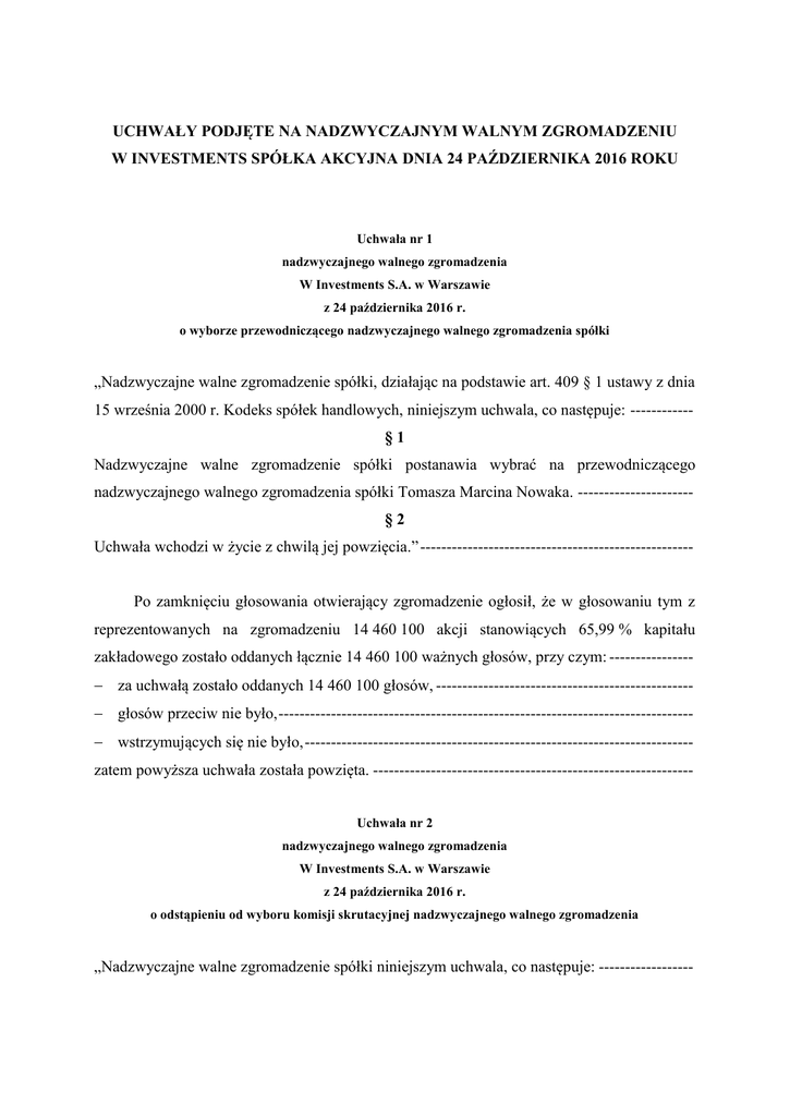 UCHWAŁY PODJĘTE NA NADZWYCZAJNYM WALNYM ZGROMADZENIU W INVESTMENTS SPÓŁKA AKCYJNA DNIA 24 PAŹDZIERNIKA 2016 ROKU Uchwała nr 1 nadzwyczajnego walnego zgromadzenia W Investments S.A. w Warszawie z 24 października 2016 r. o wyborze przewodniczącego nadzwyczajnego walnego zgromadzenia spółki „Nadzwyczajne walne zgromadzenie spółki, działając na podstawie art. 409 § 1 ustawy z dnia 15 września 2000 r. Kodeks spółek handlowych, niniejszym uchwala, co następuje: -----------§1 Nadzwyczajne walne zgromadzenie spółki postanawia wybrać na przewodniczącego nadzwyczajnego walnego zgromadzenia spółki Tomasza Marcina Nowaka. ---------------------§2 Uchwała wchodzi w życie z chwilą jej powzięcia.” ---------------------------------------------------Po zamknięciu głosowania otwierający zgromadzenie ogłosił, że w głosowaniu tym z reprezentowanych na zgromadzeniu 14 460 100 akcji stanowiących 65,99 % kapitału zakładowego zostało oddanych łącznie 14 460 100 ważnych głosów, przy czym: --------------- za uchwałą zostało oddanych 14 460 100 głosów, ------------------------------------------------ głosów przeciw nie było, ------------------------------------------------------------------------------ wstrzymujących się nie było, -------------------------------------------------------------------------zatem powyższa uchwała została powzięta. ------------------------------------------------------------Uchwała nr 2 nadzwyczajnego walnego zgromadzenia W Investments S.A. w Warszawie z 24 października 2016 r. o odstąpieniu od wyboru komisji skrutacyjnej nadzwyczajnego walnego zgromadzenia „Nadzwyczajne walne zgromadzenie spółki niniejszym uchwala, co następuje: ------------------ §1 Nadzwyczajne walne zgromadzenie spółki postanawia odstąpić od wyboru komisji skrutacyjnej i powierzyć obowiązek sprawdzenia listy obecności i obowiązek liczenia głosów przewodniczącemu nadzwyczajnego walnego zgromadzenia. ---------------------------------------§2 Uchwała wchodzi w życie z chwilą jej powzięcia.” ---------------------------------------------------Po zamknięciu głosowania przewodniczący walnego zgromadzenia ogłosił, że w głosowaniu tym z reprezentowanych na zgromadzeniu 14 460 100 akcji stanowiących 65,99 % kapitału zakładowego zostało oddanych łącznie 14 460 100 ważnych głosów, przy czym: --------------------------------------------------------------------------------------------------------- za uchwałą zostało oddanych 14 460 100 głosów, ------------------------------------------------ głosów przeciw nie było, ------------------------------------------------------------------------------ wstrzymujących się nie było, -------------------------------------------------------------------------zatem powyższa uchwała została powzięta. ------------------------------------------------------------Uchwała nr 3 nadzwyczajnego walnego zgromadzenia W Investments S.A. w Warszawie z 24 października 2016 r. o przyjęciu porządku obrad nadzwyczajnego walnego zgromadzenia spółki „Nadzwyczajne walne zgromadzenie spółki niniejszym uchwala, co następuje: -----------------§1 Nadzwyczajne walne zgromadzenie spółki postanawia przyjąć następujący porządek obrad: -1. otwarcie obrad nadzwyczajnego walnego zgromadzenia; ---------------------------------------2. wybór przewodniczącego nadzwyczajnego walnego zgromadzenia; --------------------------3. stwierdzenie przez przewodniczącego nadzwyczajnego walnego zgromadzenia prawidłowości zwołania nadzwyczajnego walnego zgromadzenia oraz jego zdolności do podejmowania uchwał; --------------------------------------------------------------------------------4. podjęcie uchwały w sprawie odstąpienia od wyboru komisji skrutacyjnej; -------------------5. przyjęcie porządku obrad nadzwyczajnego walnego zgromadzenia; ---------------------------6. podjęcie uchwały w sprawie wyrażenia zgody na zbycie zorganizowanej części przedsiębiorstwa spółki;-------------------------------------------------------------------------------- -2- 7. podjęcie uchwały w sprawie zmiany statutu spółki; ----------------------------------------------8. zamknięcie obrad nadzwyczajnego walnego zgromadzenia. ------------------------------------§2 Uchwała wchodzi w życie z chwilą jej powzięcia.” ---------------------------------------------------Uchwała nr 4 nadzwyczajnego walnego zgromadzenia W Investments S.A. w Warszawie z 24 października 2016 r. o wyrażeniu zgody na zbycie zorganizowanej części przedsiębiorstwa spółki „Działając na podstawie art. 393 pkt 3) Kodeksu spółek handlowych oraz art. 24 ust. 2 lit. j) statutu spółki, walne zgromadzenie postanawia, co następuje: --------------------------------------§1 Zgoda na zbycie Zorganizowanej Części Przedsiębiorstwa Walne zgromadzenie wyraża zgodę na zbycie zorganizowanej części przedsiębiorstwa obejmującej organizacyjnie, funkcjonalnie oraz finansowo wyodrębniony w wewnętrznej strukturze organizacyjnej przedsiębiorstwa spółki zespół składników materialnych i niematerialnych w postaci oddziału W Investments S.A. Odział w Poznaniu, z wyłączeniem: 1) udziałów w kapitale zakładowym WinVentures spółka z ograniczoną odpowiedzialnością, wpisanej do rejestru przedsiębiorców Krajowego Rejestru Sądowego pod numerem 431683, --------------------------------------------------------------------------------------------------2) akcji w kapitale zakładowym WinVentures spółka z ograniczoną odpowiedzialnością spółka komandytowo-akcyjna, wpisanej do rejestru przedsiębiorców Krajowego Rejestru Sądowego pod numerem 486499, -------------------------------------------------------------------(dalej: ZCP). W związku z powyższym, walne zgromadzenie spółki wyraża także zgodę na przejęcie przez Spółkę Zależną (o której mowa poniżej) wszelkich zobowiązań spółki związanyc